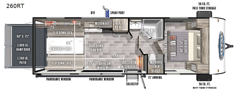 Load up your motorcycles for a weekend of off-road fun in up to 13'4" of cargo space that includes a drive-on wheel well for more space. Once at your destination, you can set up the patio deck on the ramp door, and the 15' full-length power awning with adjustable legs to enjoy the great outdoors and map out your ride. If you prefer some air conditioning, head inside to the two flip-down sofas and removable table that allow you to look out the two panoramic windows without having to be hot. And when it gets too cold, the fireplace is a nice convenience to have. You will soon find that the walk-through bathroom is super convenient, allowing you to enter through the main area or the private bedroom that includes plenty of storage for your clothes and such.