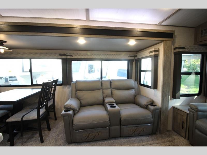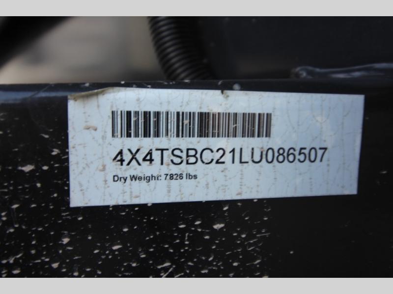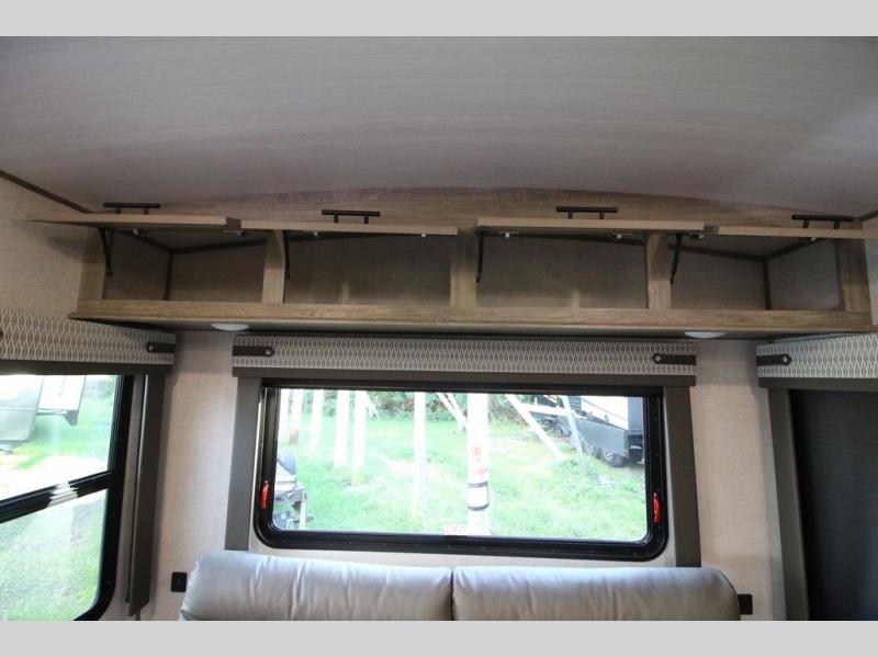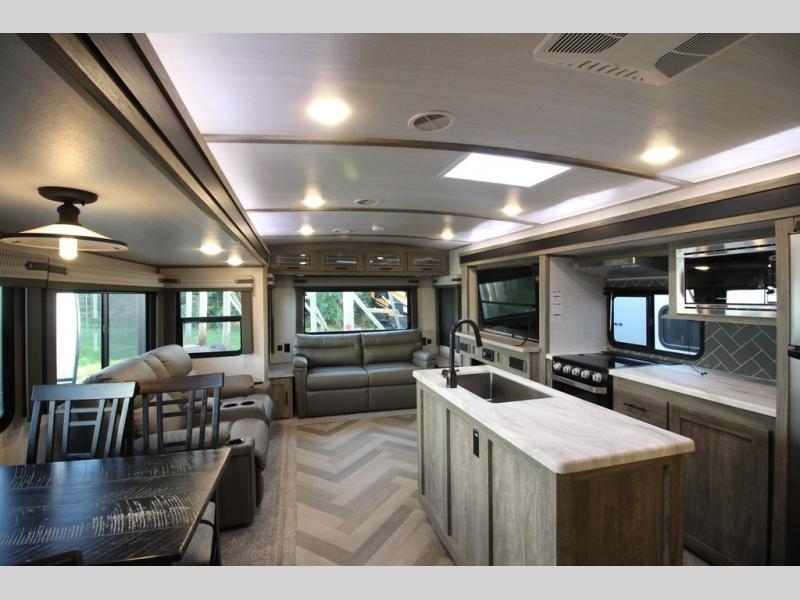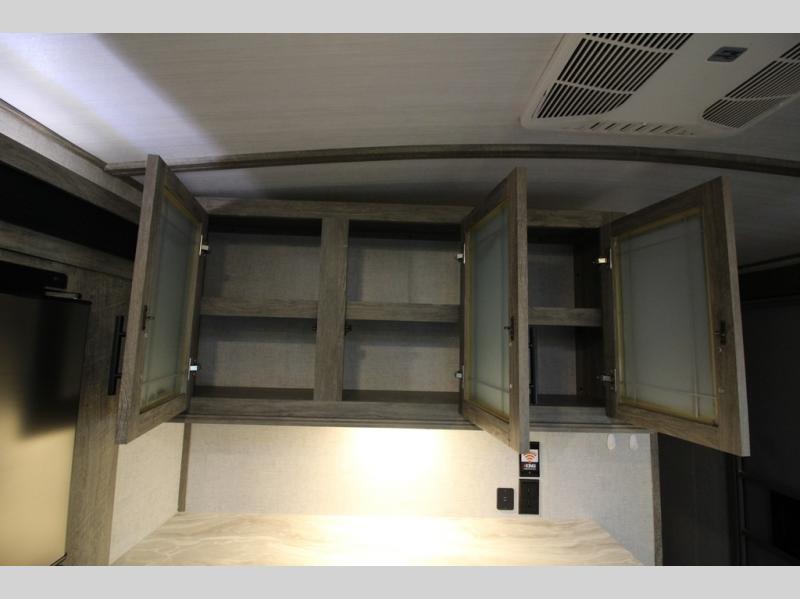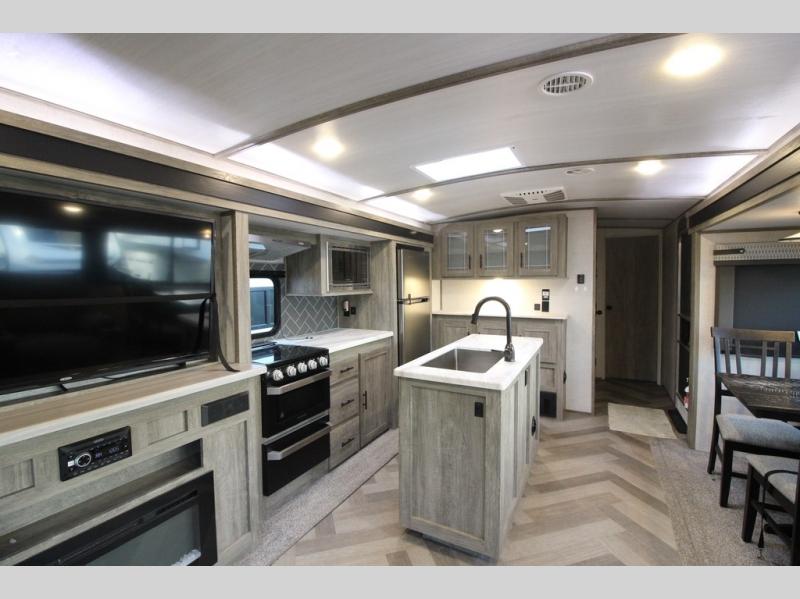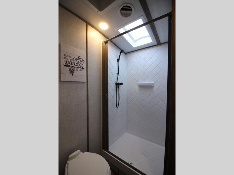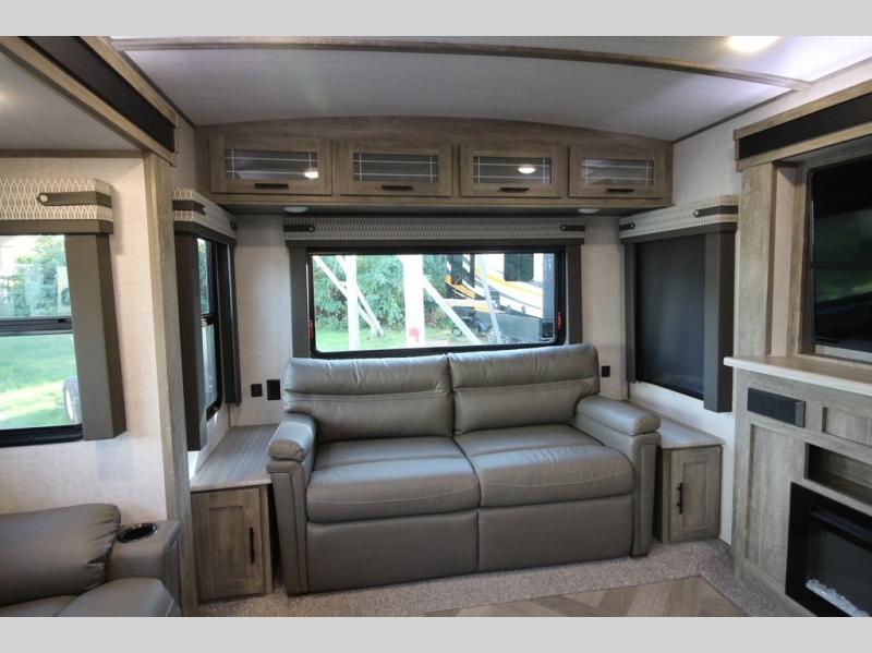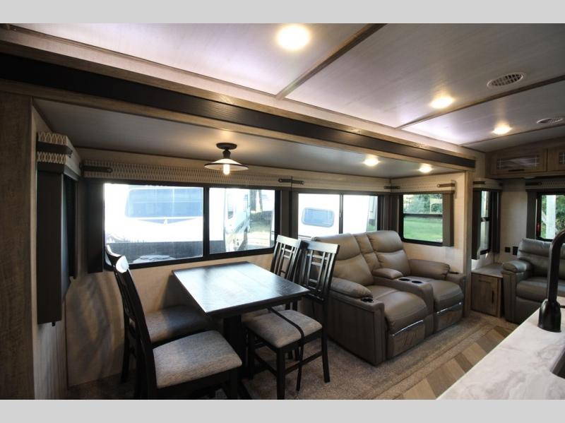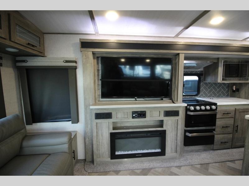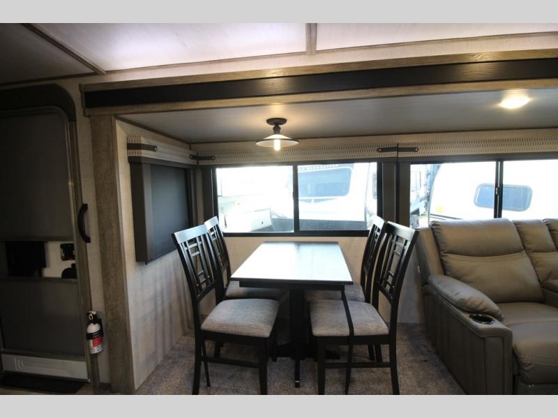 Step inside this luxurious travel trailer and see all that it has to offer! You will enjoy a good night's rest each night on the queen bed with wardrobes on either side to keep your hang up clothes wrinkle free, and if you have a couple of guests then you can convert the rear tri-fold sofa or the booth dinette into a sleeping space. The 30" x 36" walk-in shower with a skylight above invites you to take a hot, steamy shower after a fun-filled day outdoors. Once you're cleaned up, you can grab some leftovers from the 10.7 c. ft. residential refrigerator and warm it up in the stainless steel microwave then head to the theatre seating and watch your favorite movie on the 50" LED TV with a 32" glass front electric fireplace below!