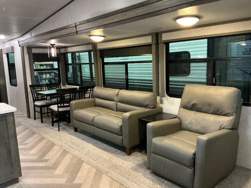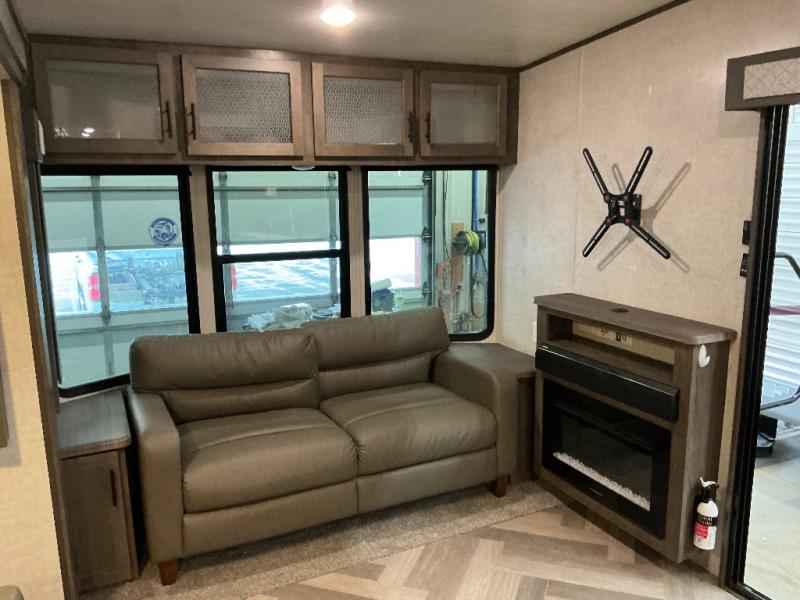 Why not stay a little longer the next time you are at your favorite spot in this trailer! You can sleep in late on your own king-size bed slide while washing your clothes in the optional washer/dryer if you added those appliances. You can also gaze out the many windows looking at the scenery before getting up to head outside the second entry/exit door for a walk or to sit under the 21' awning. Or you might decide to get cleaned up in the full bathroom with a walk-in shower. The cook will love the kitchen layout with an L-shaped counter, a pantry and all the appliances needed for warm or cold meals. The large slide in the living area gives you more floor space and panoramic windows plus the bay front includes lots of windows for more natural light and great views. The ceiling fan will keep every cool and the fireplace can keep everyone warm, it all depends which season you are in.
