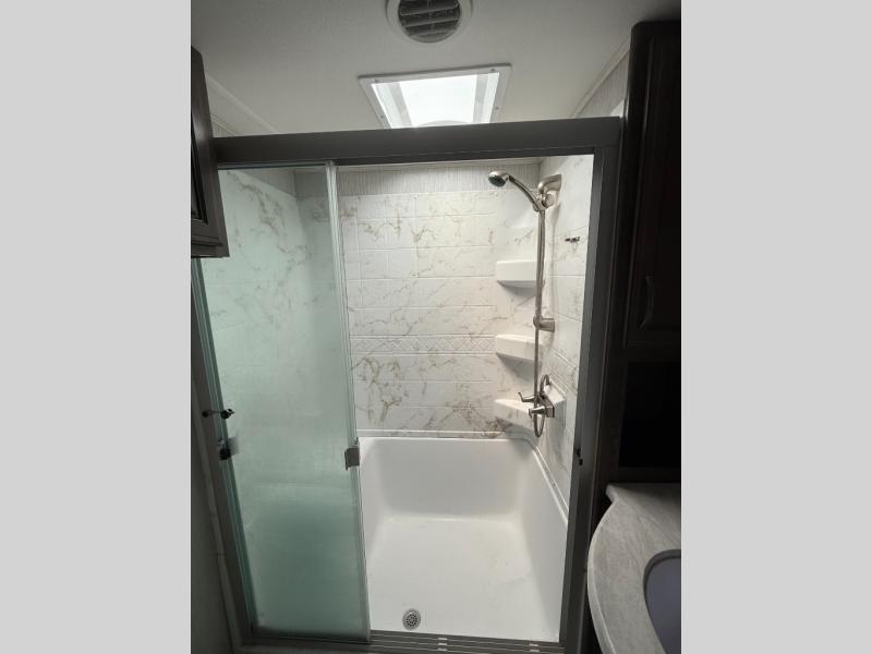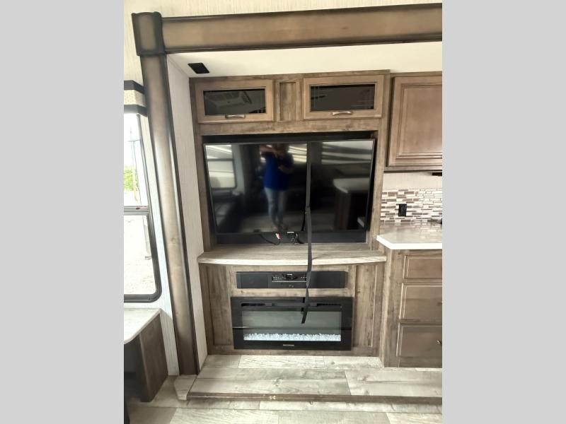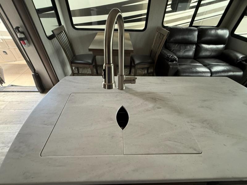 You won't want to pass up your chance to camp in this luxurious Sandpiper fifth wheel! With a rear living area featuring a tri-fold hide-a-bed sofa with end tables, theater seating with cupholders, and an entertainment center with a fireplace, you can enjoy relaxing in true comfort each evening. Inside the full bathroom there is a walk-in shower with a seat, a vanity sink, and a linen closet so that you can start each morning off clean and fresh. Once you're ready for the day, head to the coffee bar area to brew up your favorite cup of coffee then head outdoors and enjoy a relaxing morning while you sit under the 16' electric awning with LED lights!