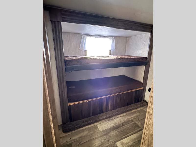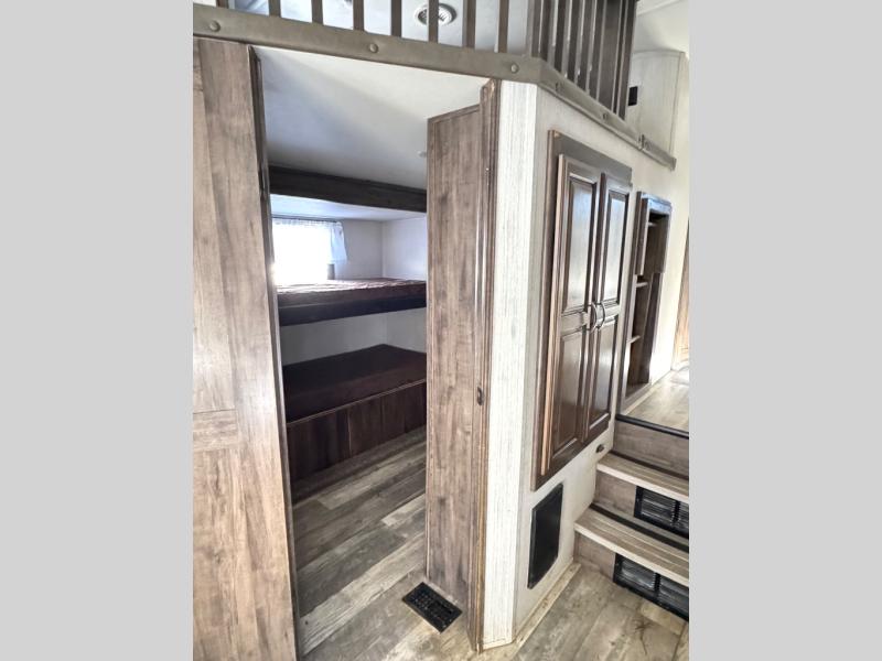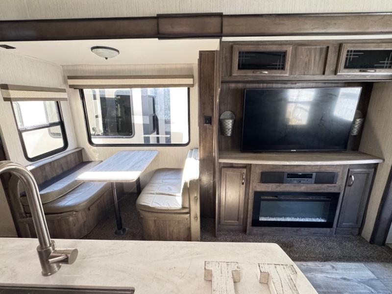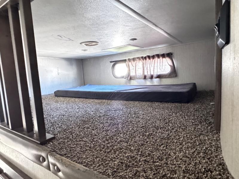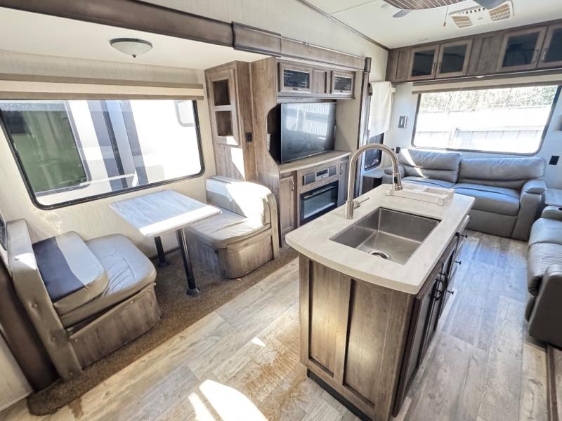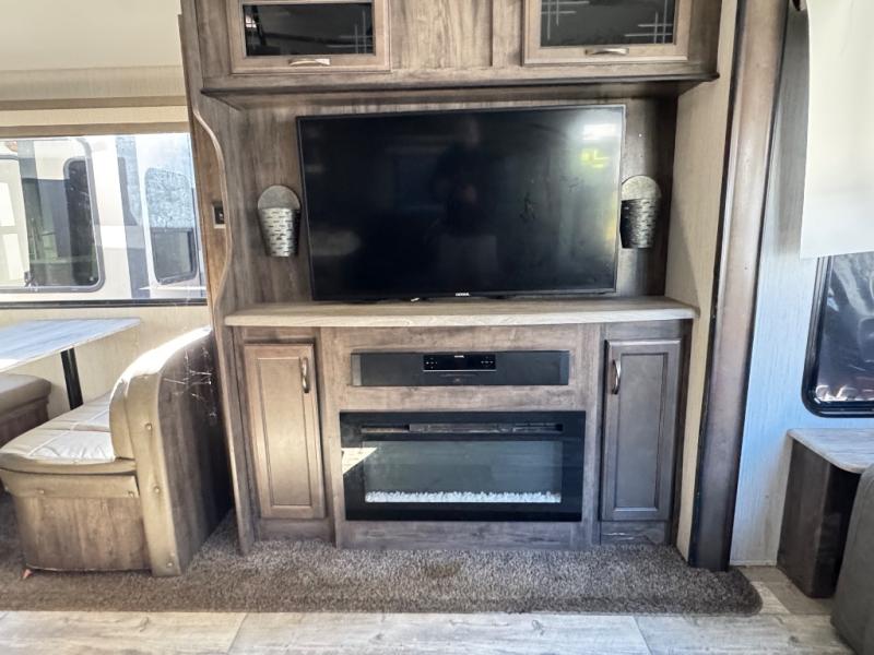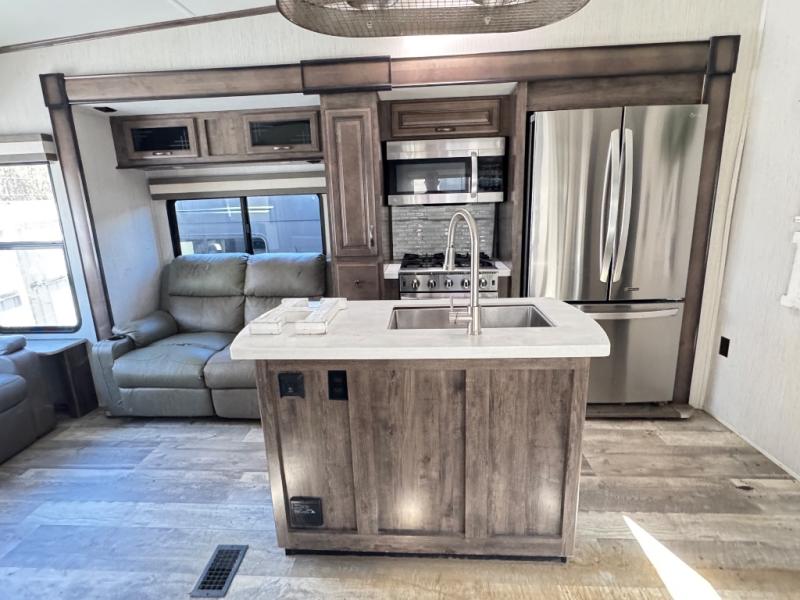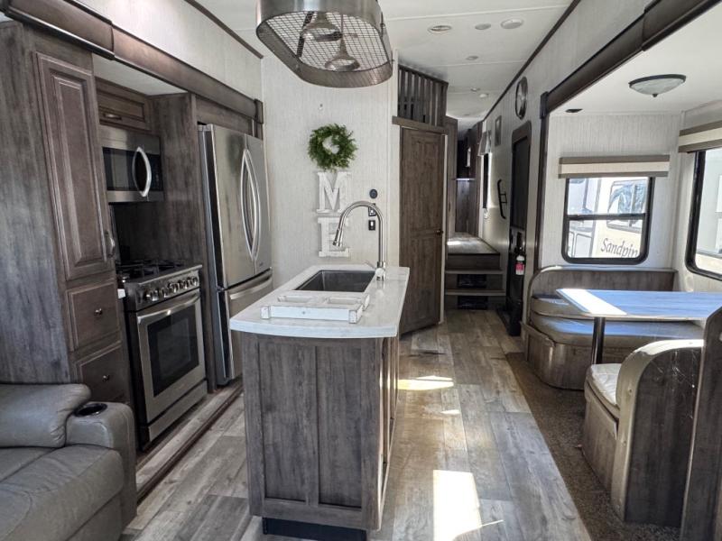 For the family-friendly fifth wheel that you've always wanted, look no further than this Sandpiper by Forest River. You will enjoy the convenience of having two kitchens - one inside and one outside. Almost straight in from the door is the second bedroom which can easily double as a den. Above this room is a loft which features sleeping space for two people. In the combined kitchen and living area there is an island with pendant lights above and extra counter space to make meal prep run smoothly. You can easily relax in this living area with an entertainment center, fireplace, and theater seating!