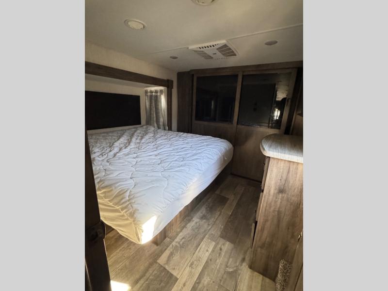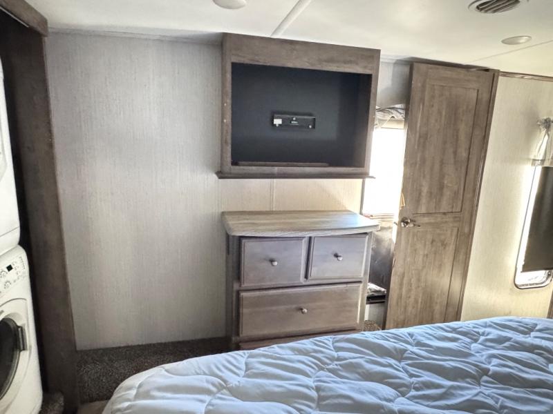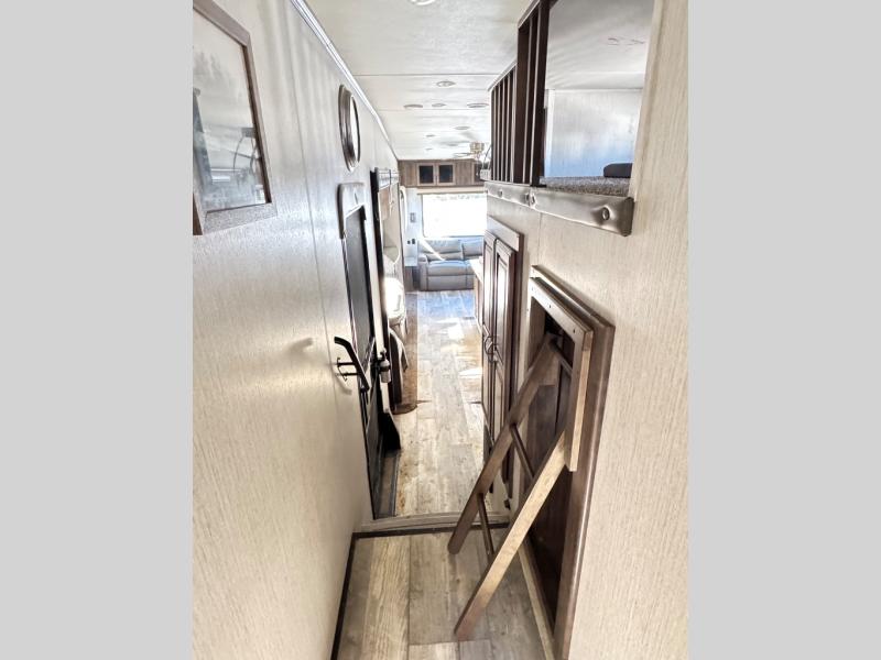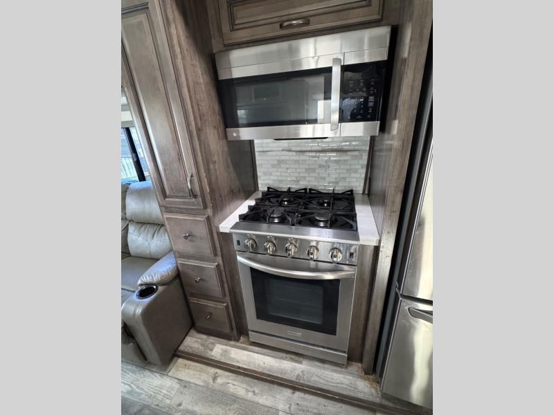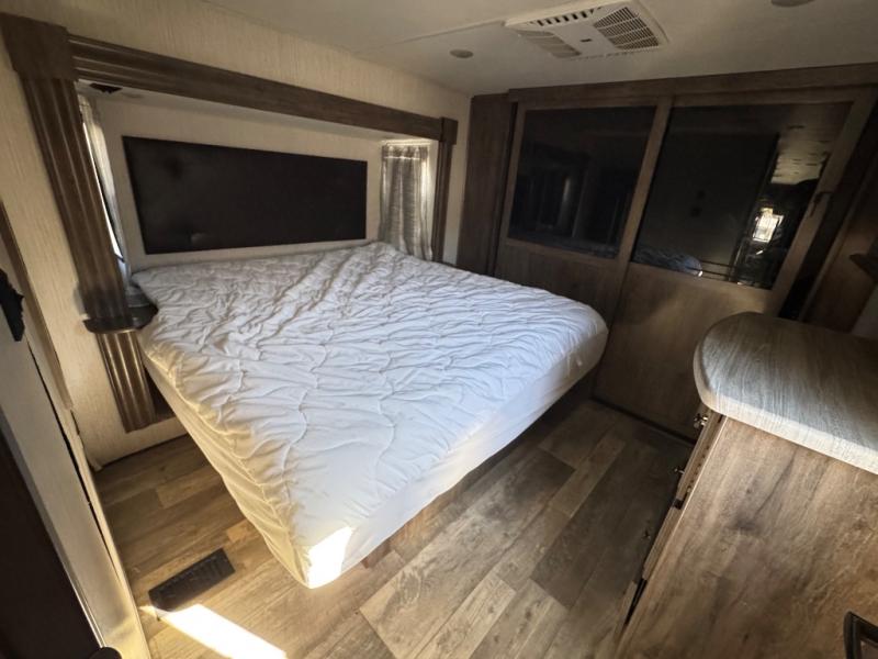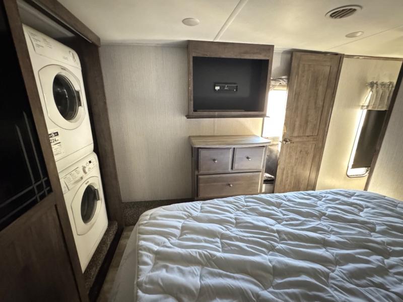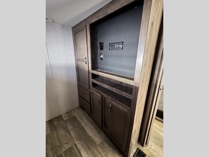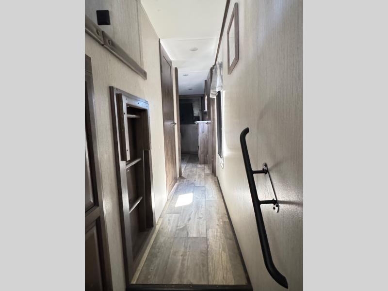 For the family-friendly fifth wheel that you've always wanted, look no further than this Sandpiper by Forest River. You will enjoy the convenience of having two kitchens - one inside and one outside. Almost straight in from the door is the second bedroom which can easily double as a den. Above this room is a loft which features sleeping space for two people. In the combined kitchen and living area there is an island with pendant lights above and extra counter space to make meal prep run smoothly. You can easily relax in this living area with an entertainment center, fireplace, and theater seating!