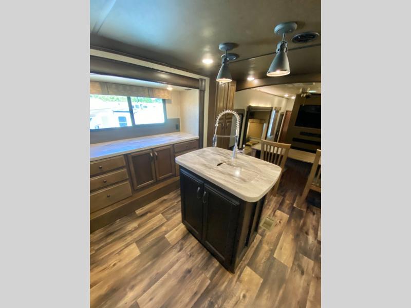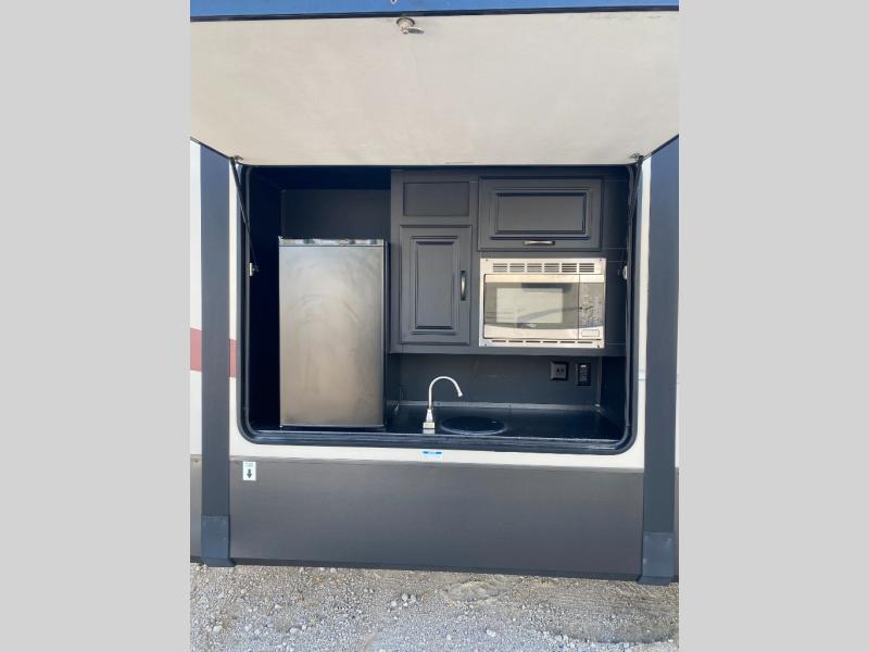 Get ready for more family time and new experiences when you choose to camp with this six-slide Sandpiper fifth wheel. Where are you going to make dinner tonight? That is the question you will be asking yourself when you see this unit. The exterior kitchen allows more time outdoors with your family and features a refrigerator and microwave. The unique front kitchen is spacious and accommodating with opposing slides, an island, and a dinette with two chairs. In the spacious bathroom is a large walk-in shower with a seat, plus a closet that has been prepped for a washer and dryer. With two entry doors into this model, you can easily slip out the rear door and head out for an early morning fishing trip!