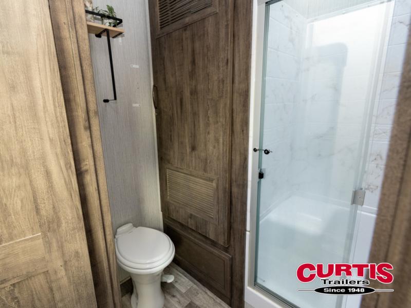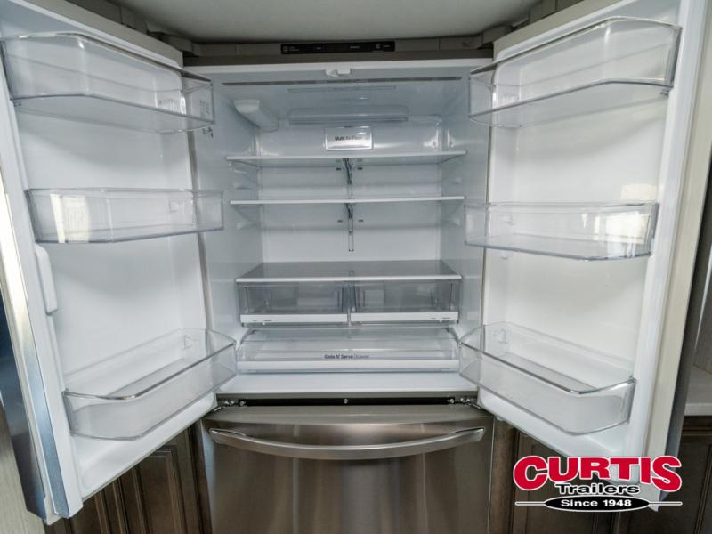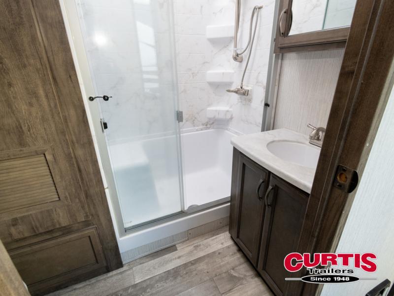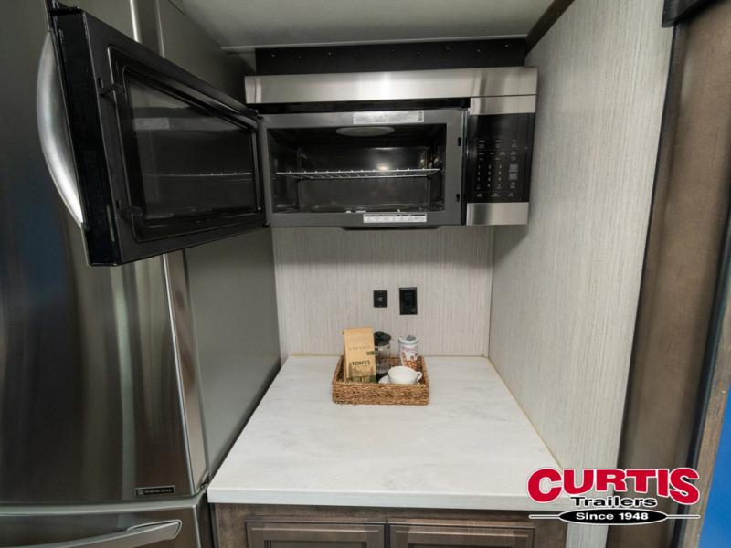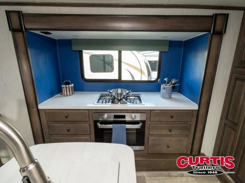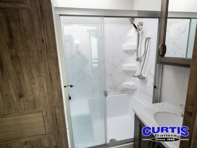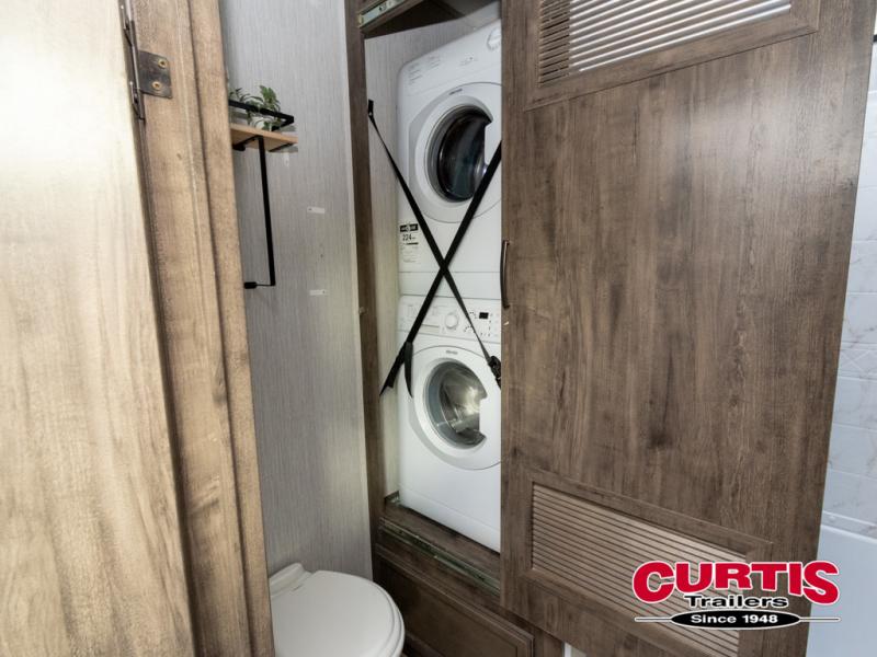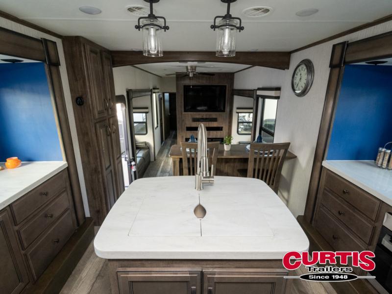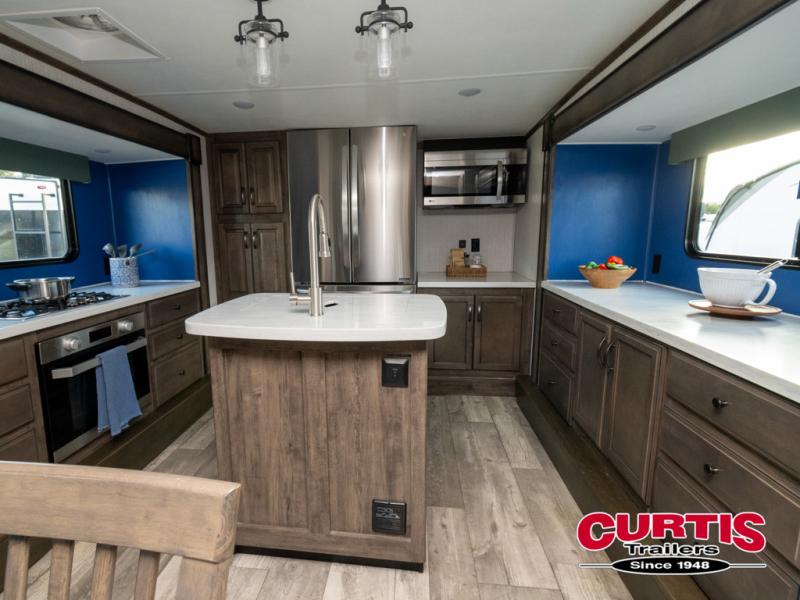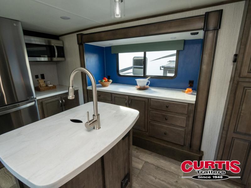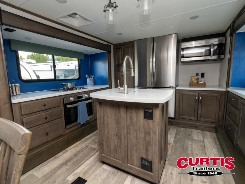 Get ready for more family time and new experiences when you choose to camp with this six-slide Sandpiper fifth wheel. Where are you going to make dinner tonight? That is the question you will be asking yourself when you see this unit. The exterior kitchen allows more time outdoors with your family and features a refrigerator and microwave. The unique front kitchen is spacious and accommodating with opposing slides, an island, and a dinette with two chairs. In the spacious bathroom is a large walk-in shower with a seat, plus a closet that has been prepped for a washer and dryer. With two entry doors into this model, you can easily slip out the rear door and head out for an early morning fishing trip!