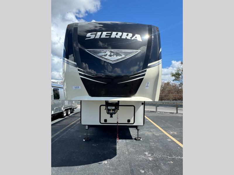Get away in luxury and comfort with this Sierra fifth wheel! This model gives you a great rear living space with large opposing slides, an entertainment center, a fireplace, theater seating, and a hide-a-bed sofa with end tables, and the kitchen is just as fabulous with its island, pantry, coffee bar, and stainless steel refrigerator. You will even enjoy the time that you spend in the bathroom because the walk-in shower with seat will provide more room to rinse off, and the linen closet will store all of your towels and toiletries.