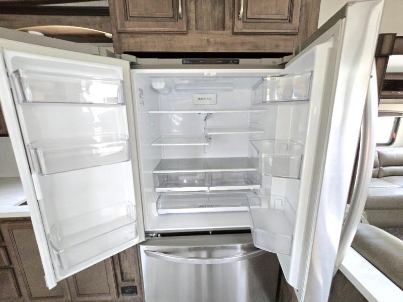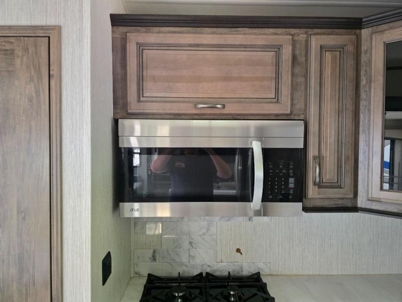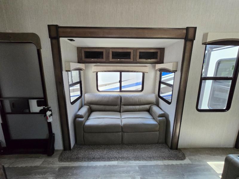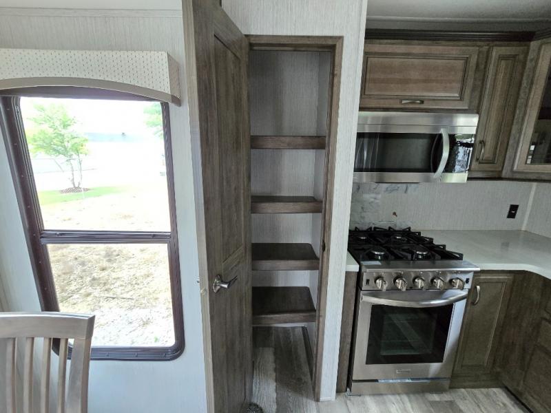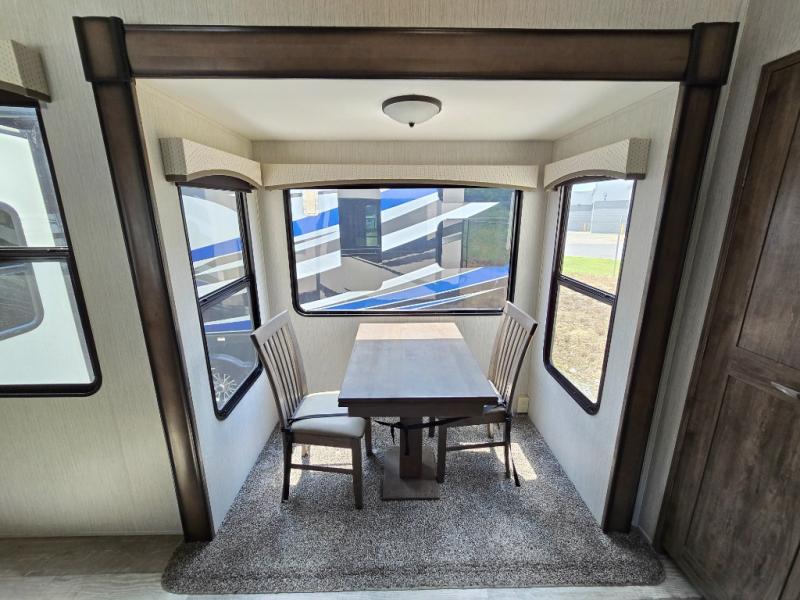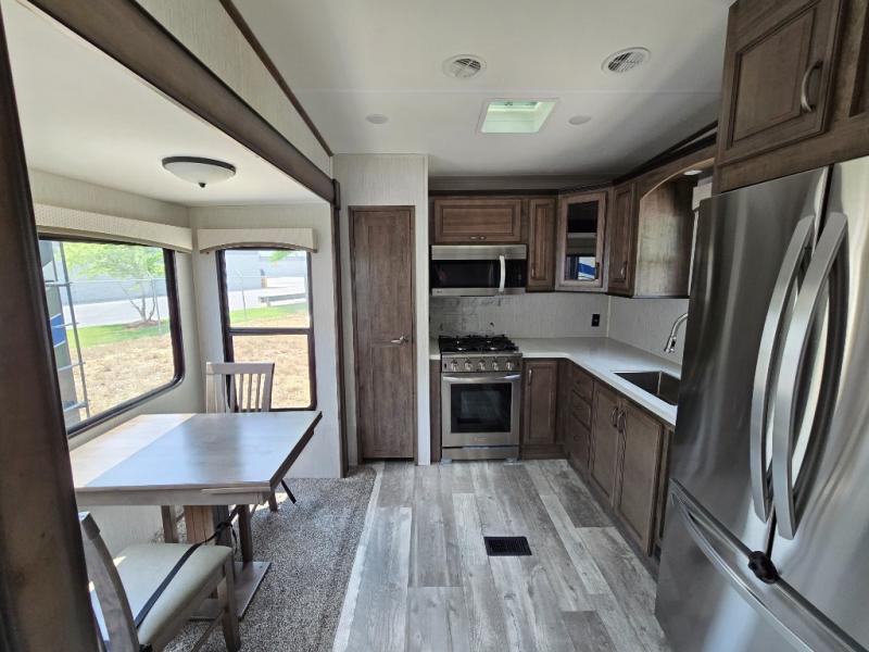Wouldn't it be fun to travel to all-new destinations while still enjoying the many comforts that home provides? This Sierra fifth wheel will let you do just that! The front private bedroom is pretty cozy and convenient with its king bed slide, large wardrobe, and dresser. Since the bedroom is right next to the large bathroom that has a dual-sink vanity, you won't have to roam far when you need to get cleaned up in the walk-in shower with seat after waking up. Afterwards, head to the back of this unit where you will find a fabulous kitchen. This kitchen comes with great features, like the residential range with four burners, the residential refrigerator, the large pantry, and the free-standing table with chairs so that company can join you while you chop and fry.