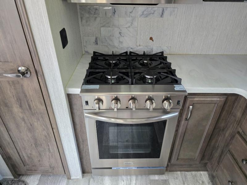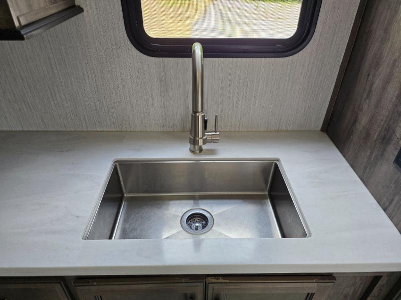 In any Forest River Sierra, you will find a line of luxury fifth wheels that brings you the very best in modern interiors and exteriors. Each of these elegant and high-class models has rustic wood plank linoleum, mocha accent crown molding over the kitchen cabinets, stainless steel appliances, a decorative backsplash, and a premium soundbar with built-in flush-mounted DVD player. The Sierra has been constructed with a welded aluminum-framed, vacuum-bonded laminated superstructure, a fully enclosed and heated underbelly, and enclosed and heated dump valves for years of enjoyment. You will also love the limited-time Platinum package that comes standard and provides you with extra features that will enhance many different aspects of the Sierra.