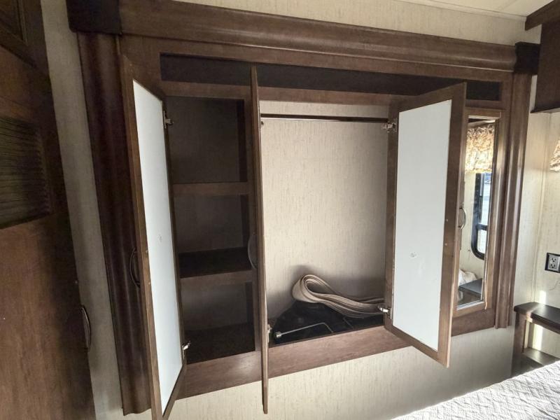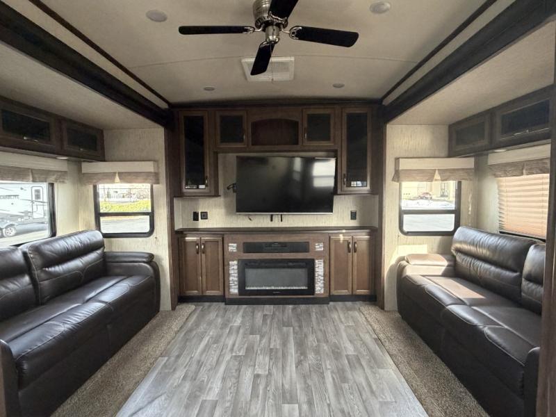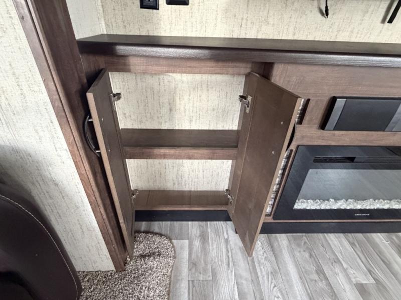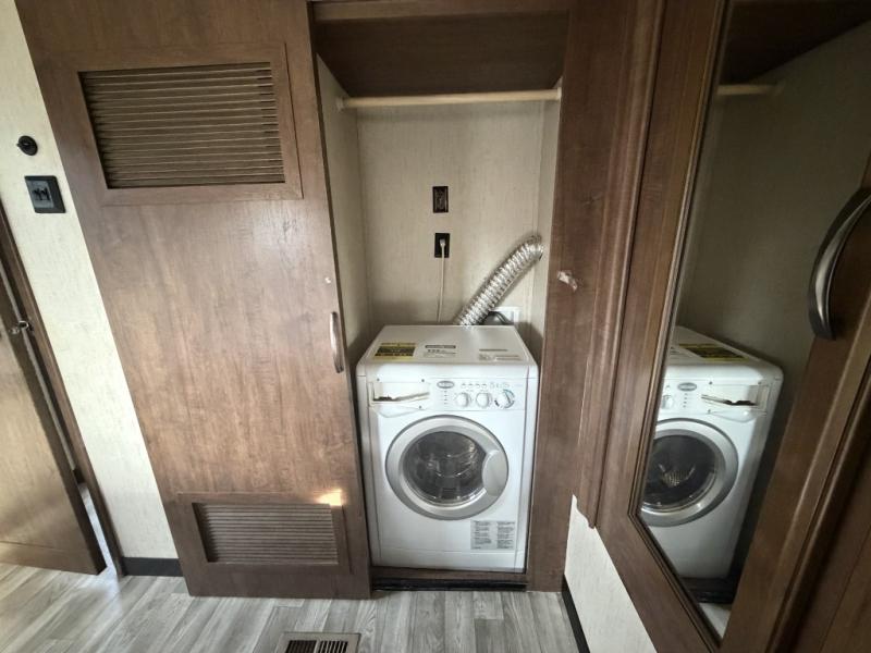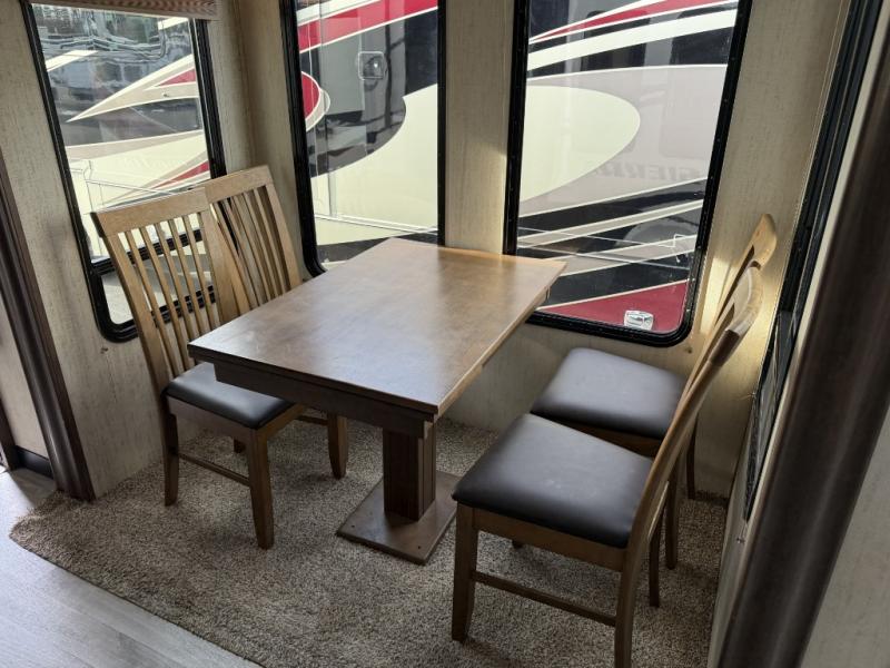 You will love to entertain all your friends and family in this five slide out destination trailer that offers a spacious interior with beautiful extra large picture windows and two sets of patio doors. You can make and serve food from the kitchen island, buffet or hutch while your guests visit on one of the dual opposing hide-a-bed sofas, theater seats, or free standing dinette. Once your party is over, you can fall a sleep quickly on your queen bed after taking a shower in the full bathroom. You even have an option to add a washer and dryer in the bedroom closet. Take a look today!