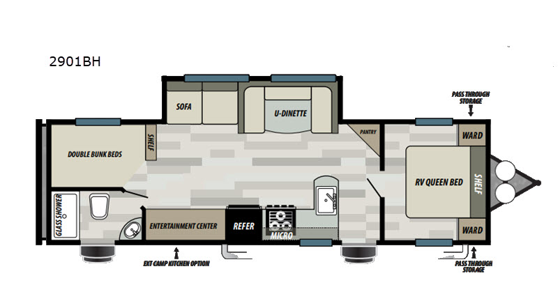 If you're looking for a travel trailer for the whole family, look no further than this unit that includes double bunk beds for the kids and a private bedroom for you and your spouse. There are convenient dual entry doors; one leading into the main living area, and one into the rear corner bath so you can get right back to the fun outside. The chef of the family can prepare a big breakfast on the three burner cooktop or use the microwave oven for instant oatmeal, and if they're wanting some fresh air, choose the optional exterior camp kitchen! You'll find comfortable seating space around the U-shaped dinette or on the sofa, and the large entertainment center allows you to add a TV if you choose. This model also includes a pass-through storage, so don't forget your fishing poles and tackle boxes!