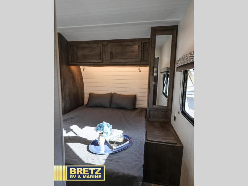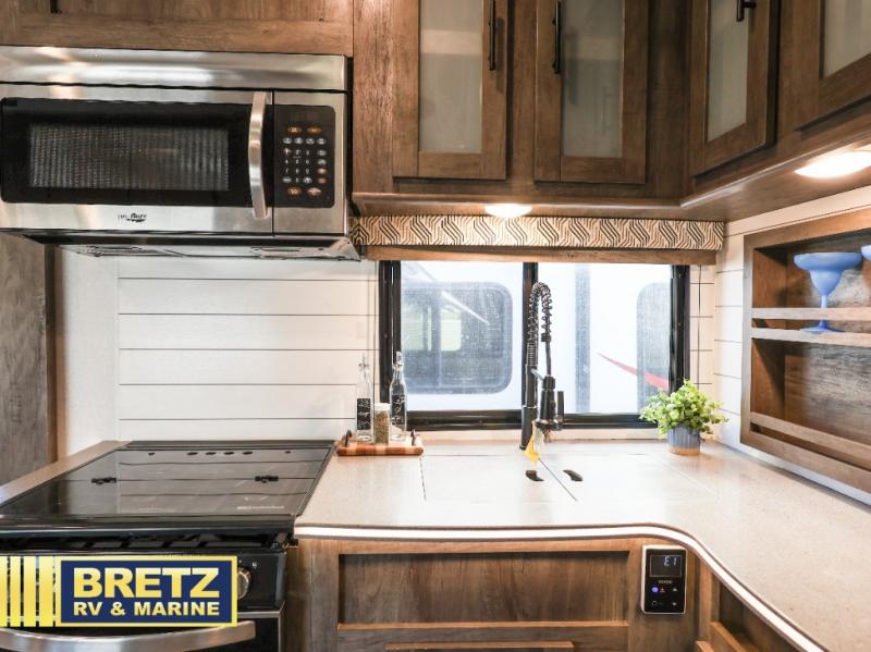 This Stealth travel trailer is a unit that delivers the amenities you need in a comfortable environment. Because there has been an electric bed installed with a sofa underneath, this unit has the ability to sleep eight people each night, and the private master suite in the front of this trailer gives you the privacy that you are accustomed to having. The two wardrobes that are located at the head of the bed will provide enough space for you to bring along all of your favorite outdoor garments, like a pair of hiking boots or a rain coat.