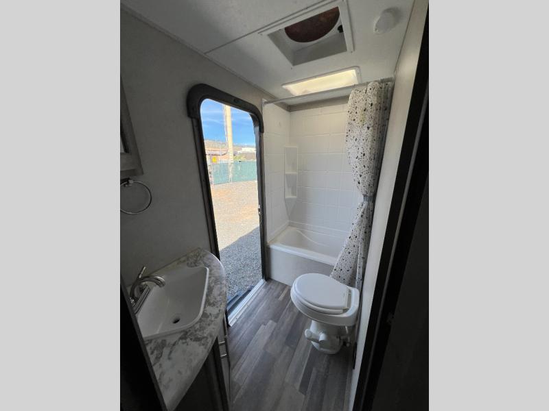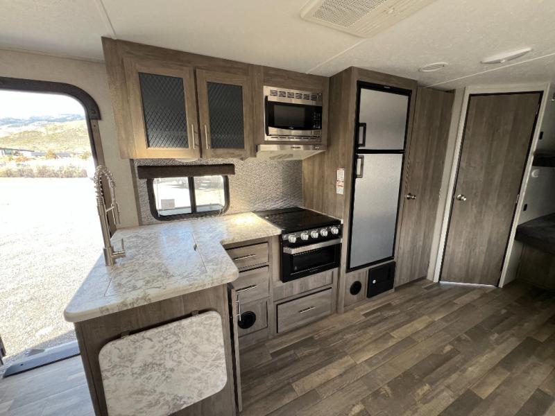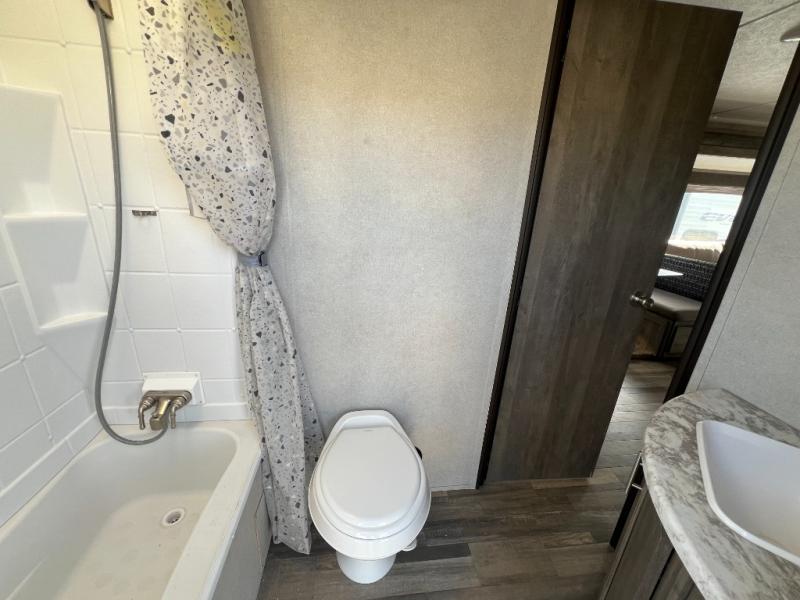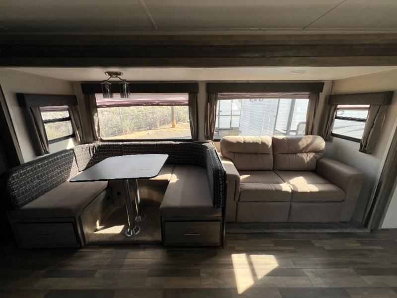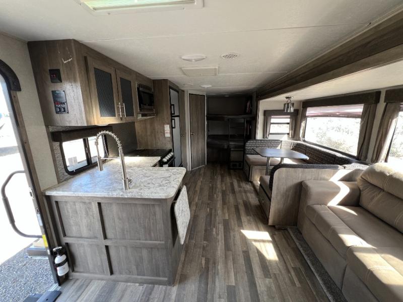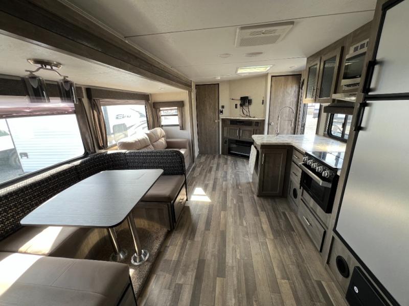 Step into the 2020 Vibe 26DB and you’re welcomed by a bright, open living space that feels both comfortable and thoughtfully designed. The main area offers a relaxed seating and dining setup surrounded by large windows that bring in natural light, creating an inviting atmosphere for everything from quiet mornings to evenings spent with family and friends. The kitchen is well-equipped with ample counter space, modern appliances, and smart storage, making it easy to cook and stay organized while on the road.