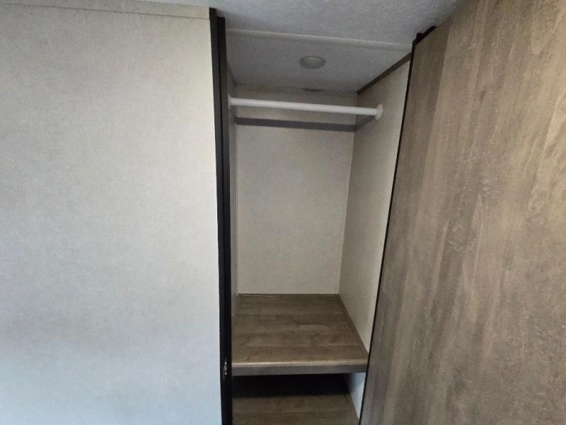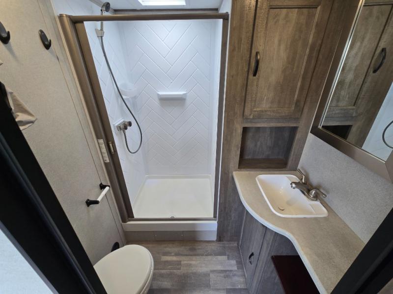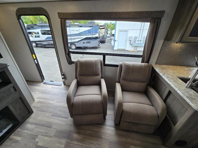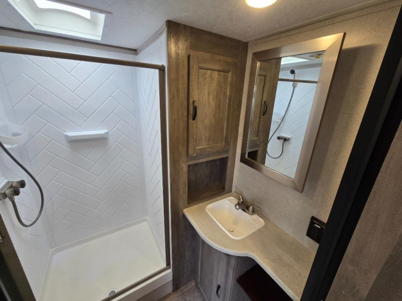 The cook will love the layout of this trailer with the kitchen appliances in the rear with lots of counter space along the side wall allowing them to prepare and serve meals for everyone. They might even like to make a few meals using the outside kitchen. You can offer lots of seating inside with a sleeper sofa and booth dinette slide out, plus the two recliners. And the 18' awning with LED light gives you an outdoor living area, all you need to do is grab your camping chairs from the exterior large pass through compartment. When you are ready to call it a night, you can get cleaned up in the walk-in shower in the full bathroom, grab your pajamas from the wardrobes or overhead cabinets, and fall asleep on the walk-around queen bed.