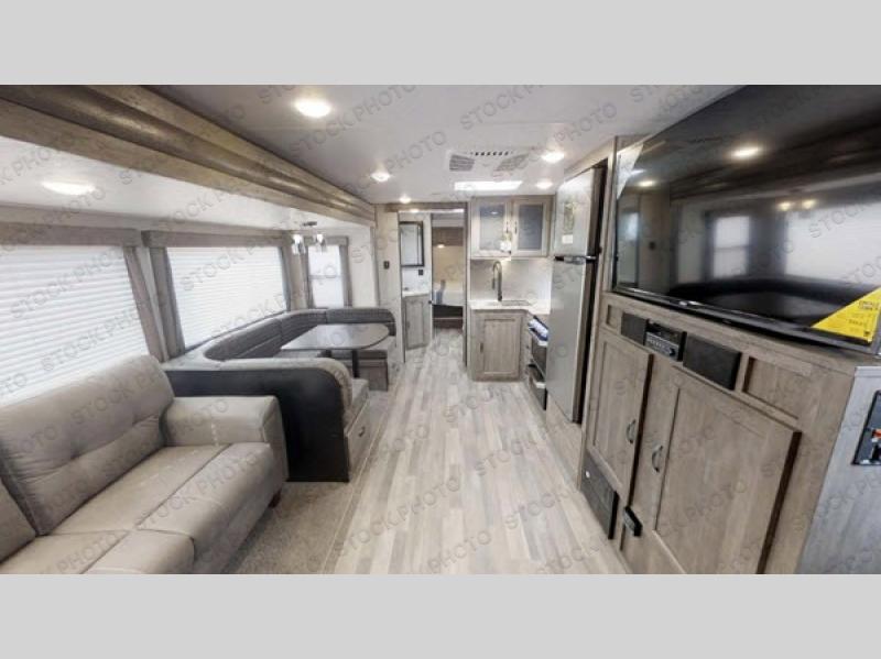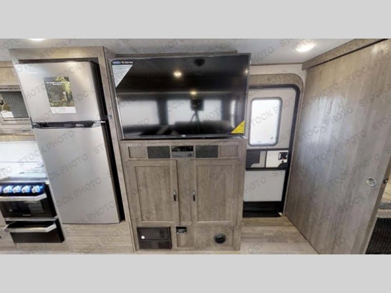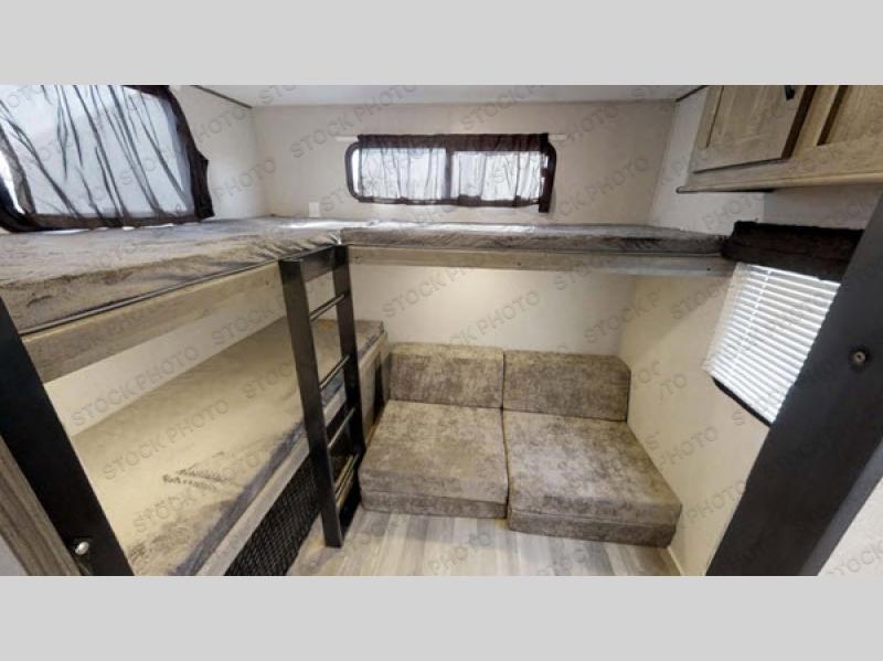 This travel trailer has all the amenities to make your camping trip convenient and fun at the same time. The kids will love being able to invite their friends with a private bunkhouse that sleeps five with two oversized bunks, and an upper bunk above two Vibe Cubes that they can relax on with a book or their tablet. Open up the main area slide out which houses the U-shaped dinette and sleeper sofa to make the living area feel just like home. You will also find a recessed 50" TV above a storage cubby, and an L-shaped kitchen. The walk-through bath offers a walk-in shower and lots of counter space to get ready for hiking, shopping, or before bedtime. And the queen size bed in the front bedroom gives you an oasis from it all. Don't forget about all the outside features such as the 20' awning, the outside kitchen, the large pass through storage, and the TV prep.