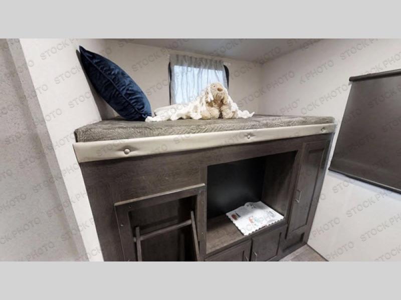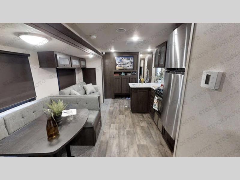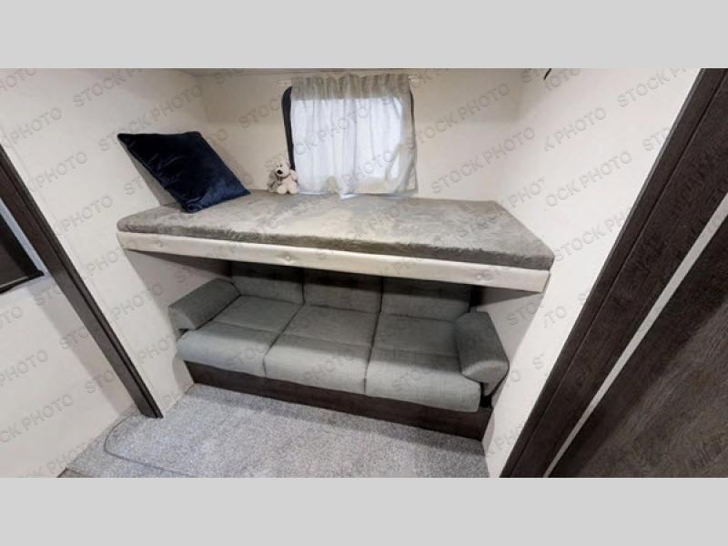 Get ready for your next weekend getaway to your local state park with this double slide out travel trailer. The private bunkhouse is perfect for the kids, while mom and dad enjoy the front private bedroom with a queen bed. This unit also includes a U-shaped dinette and a sofa, which allows this travel trailer to sleep nine campers. The kitchen features an L-shaped counter, which allows more space to cut and prepare a meal and the double sink is perfect for cleaning up afterward. You'll love how convenient the full bath is with its own exterior entry door.