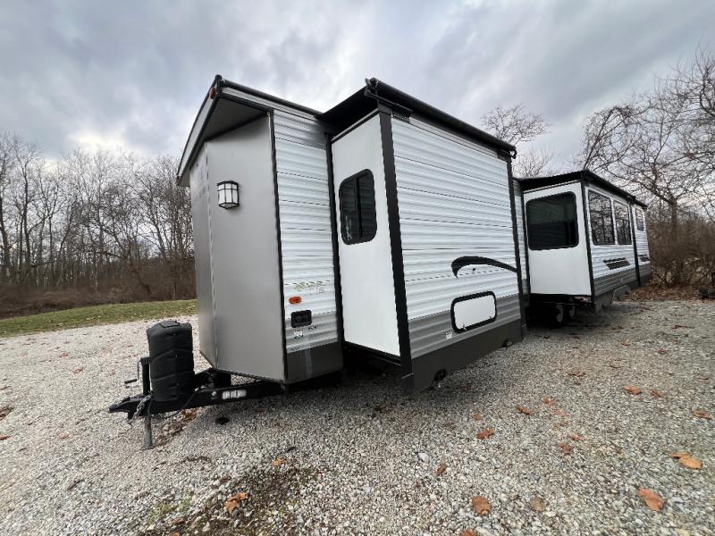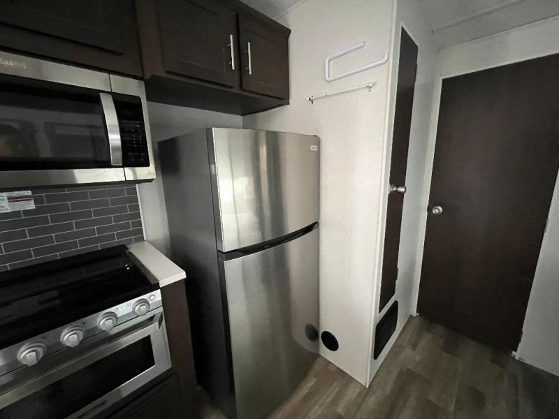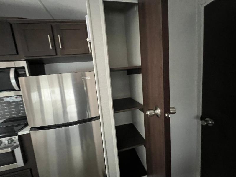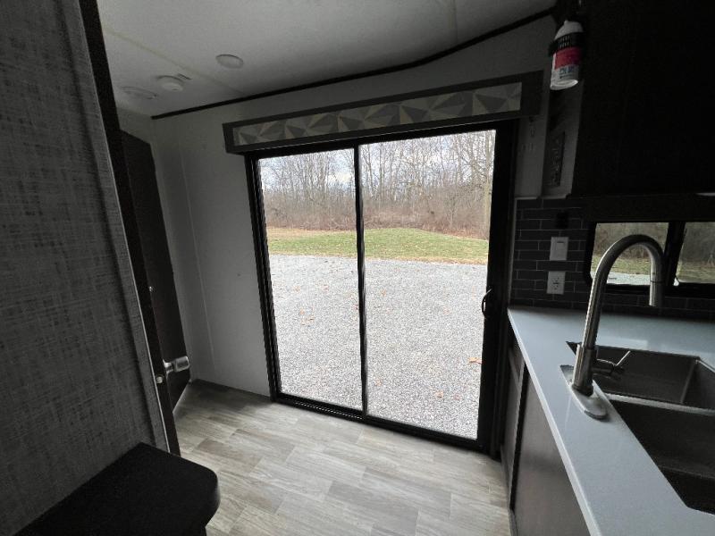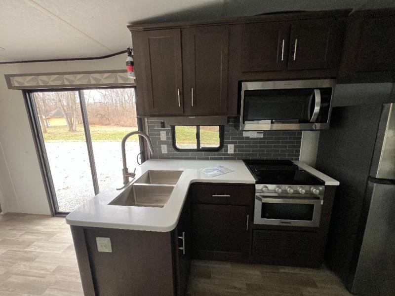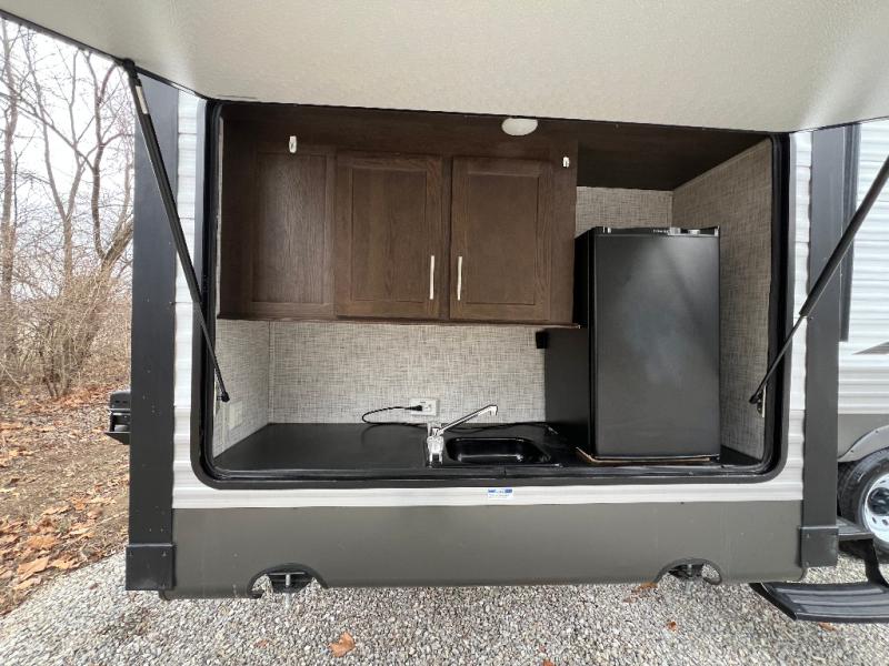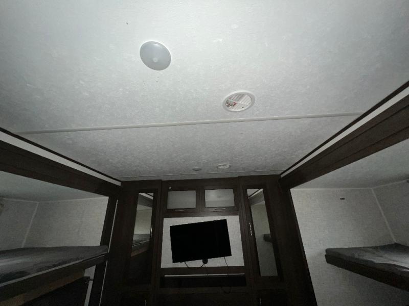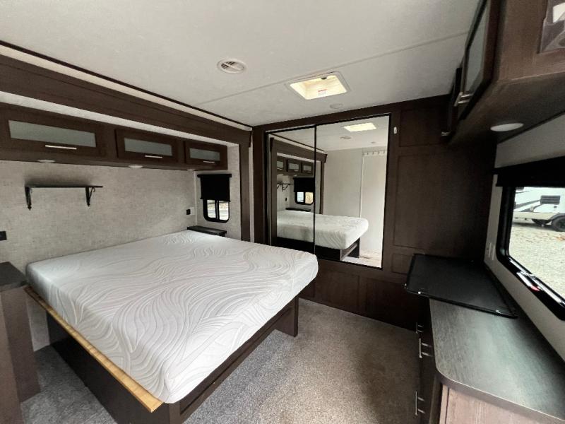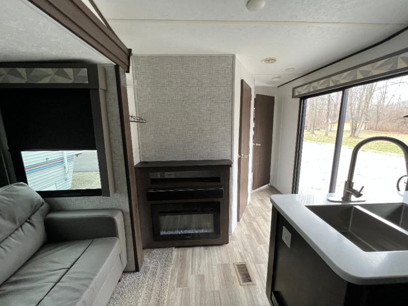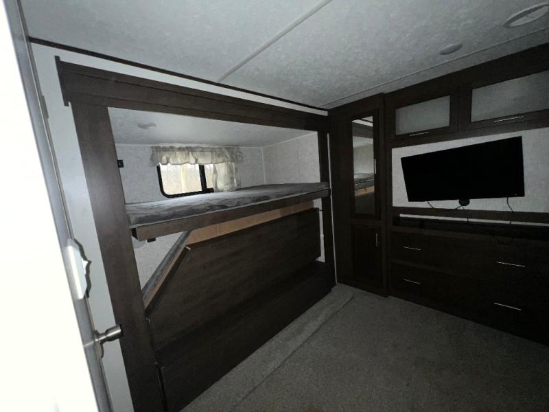 It's time to invite the extended family for a fun weekend at your favorite destination! The kids and their cousins can sleep in the rear bunkhouse in privacy which includes two slide outs, four bunk beds and plenty of storage, plus a half bath with an exterior entry/exit door. You might even decide to add the optional jiffy sofa in place of one bunk giving the kiddos another place to relax. The main living area is spacious thanks to the slide out that offers panoramic windows plus seating and dining space. And the residential inspired floating fireplace set-up, the entertainment center and the ceiling fan will keep everyone comfortable. The cook will have stainless steel appliances including a residential refrigerator to keep everyone fed, as well as the choice of using the outside kitchen when they like. The front bedroom can be your escape with modern bedding and throw pillows, a closet and more storage, plus the unique third entry/exit door into the trailer.