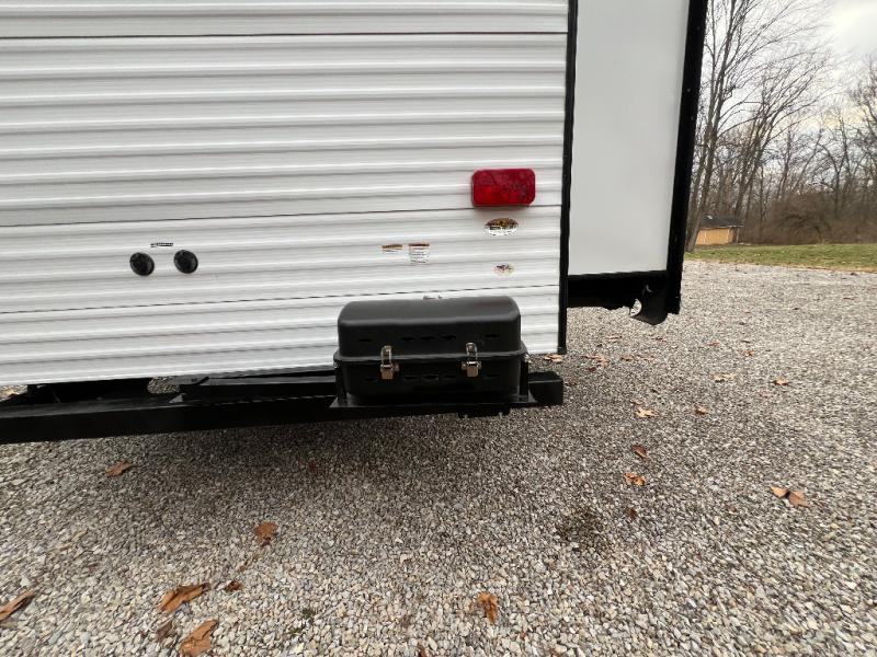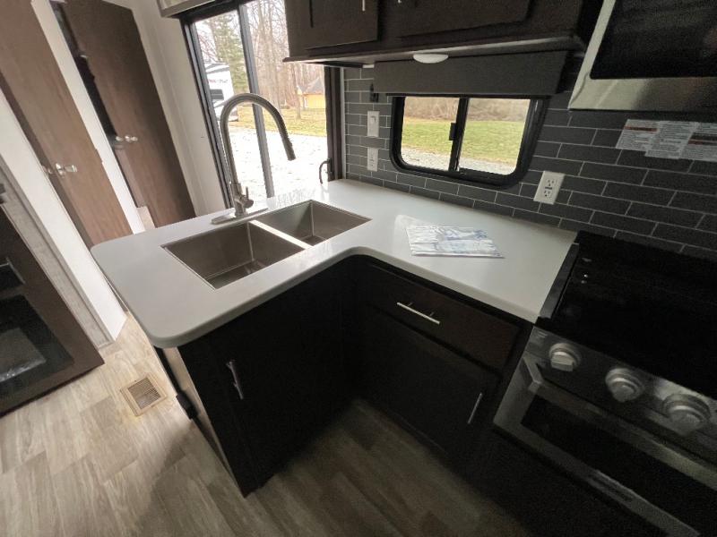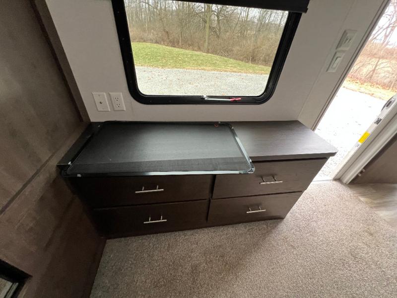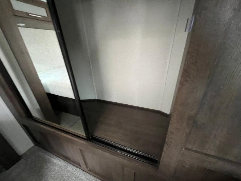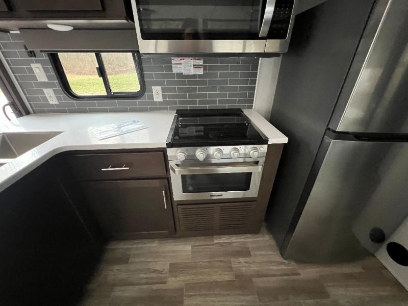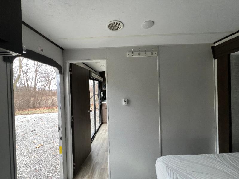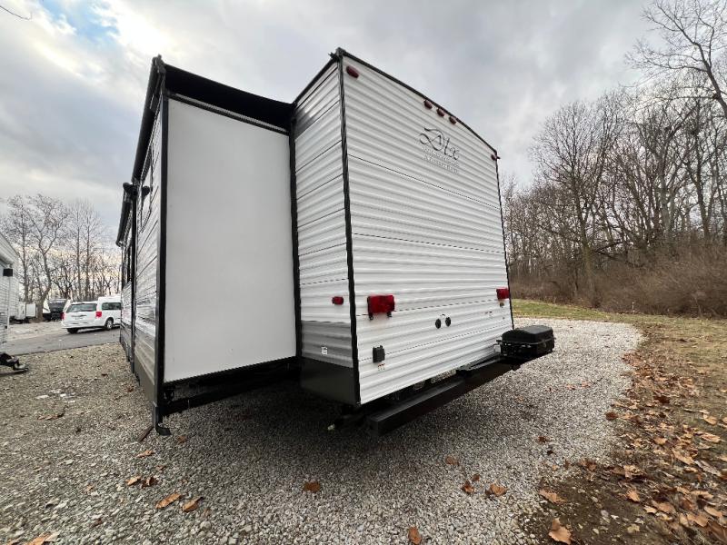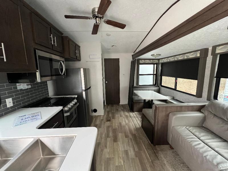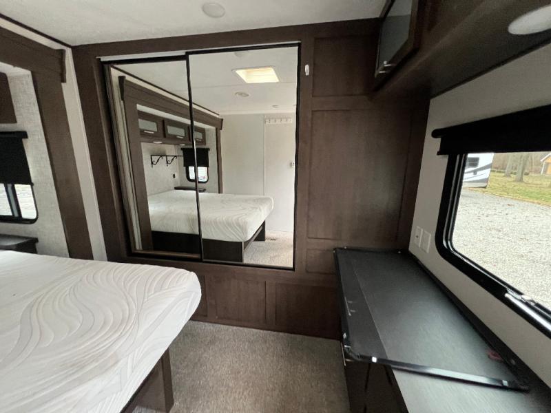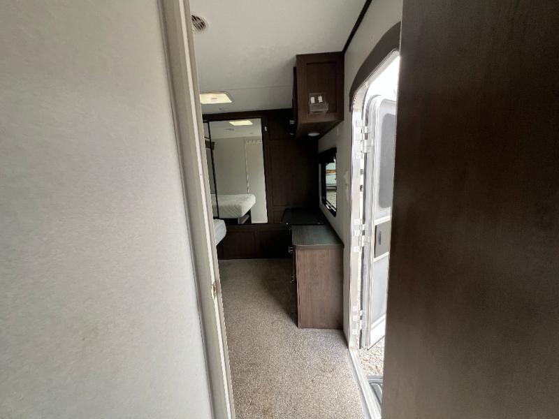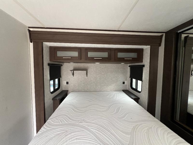 It's time to invite the extended family for a fun weekend at your favorite destination! The kids and their cousins can sleep in the rear bunkhouse in privacy which includes two slide outs, four bunk beds and plenty of storage, plus a half bath with an exterior entry/exit door. You might even decide to add the optional jiffy sofa in place of one bunk giving the kiddos another place to relax. The main living area is spacious thanks to the slide out that offers panoramic windows plus seating and dining space. And the residential inspired floating fireplace set-up, the entertainment center and the ceiling fan will keep everyone comfortable. The cook will have stainless steel appliances including a residential refrigerator to keep everyone fed, as well as the choice of using the outside kitchen when they like. The front bedroom can be your escape with modern bedding and throw pillows, a closet and more storage, plus the unique third entry/exit door into the trailer.