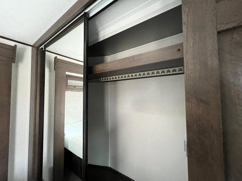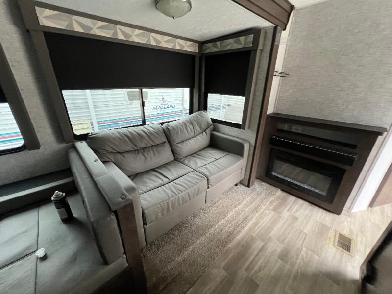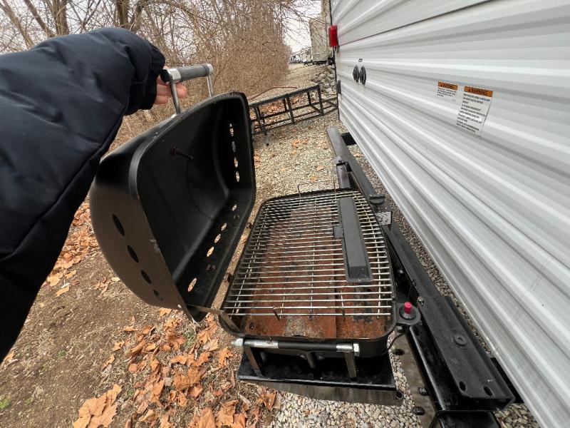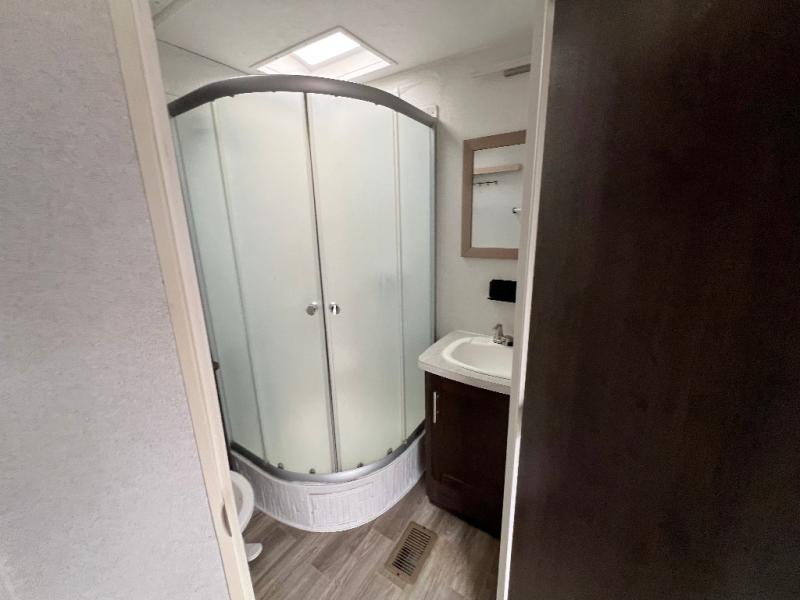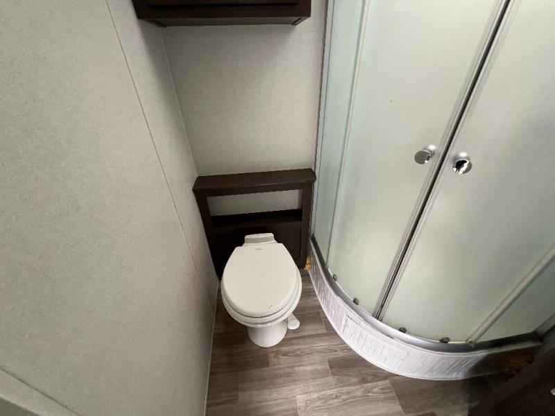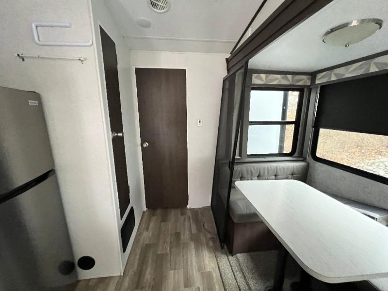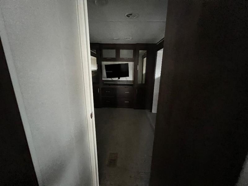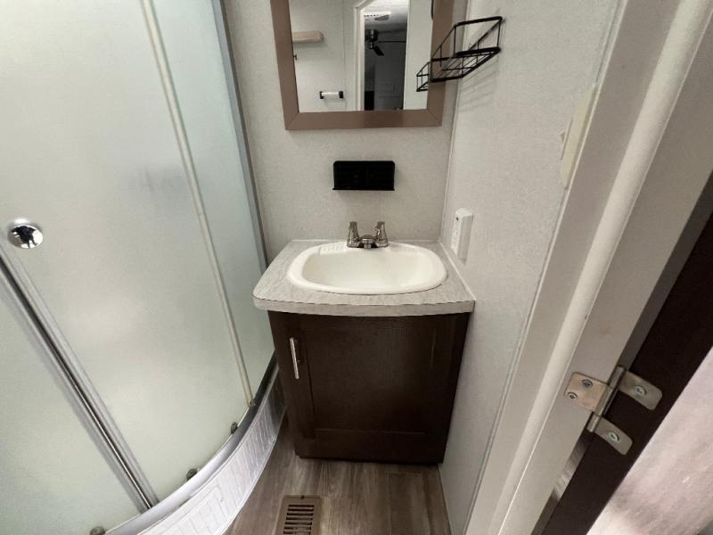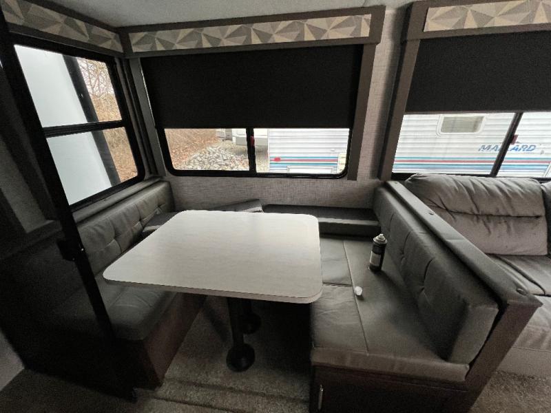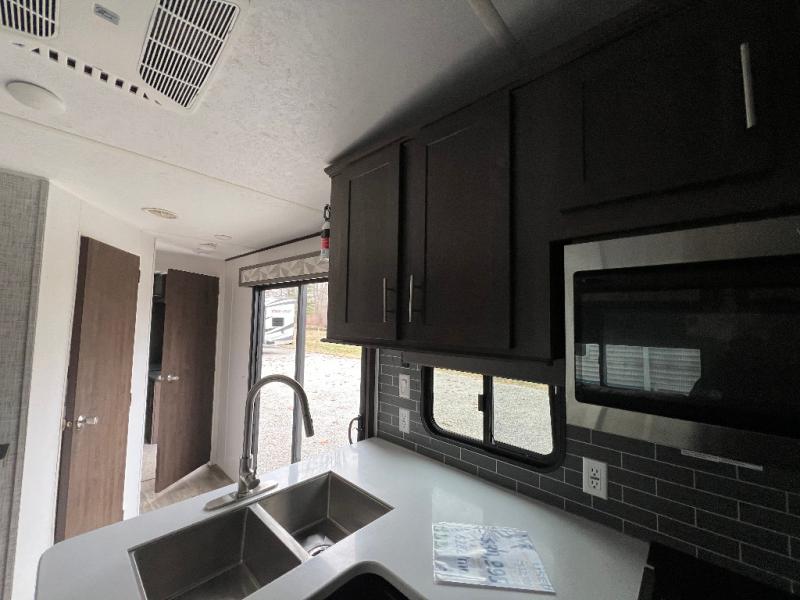 It's time to invite the extended family for a fun weekend at your favorite destination! The kids and their cousins can sleep in the rear bunkhouse in privacy which includes two slide outs, four bunk beds and plenty of storage, plus a half bath with an exterior entry/exit door. You might even decide to add the optional jiffy sofa in place of one bunk giving the kiddos another place to relax. The main living area is spacious thanks to the slide out that offers panoramic windows plus seating and dining space. And the residential inspired floating fireplace set-up, the entertainment center and the ceiling fan will keep everyone comfortable. The cook will have stainless steel appliances including a residential refrigerator to keep everyone fed, as well as the choice of using the outside kitchen when they like. The front bedroom can be your escape with modern bedding and throw pillows, a closet and more storage, plus the unique third entry/exit door into the trailer.