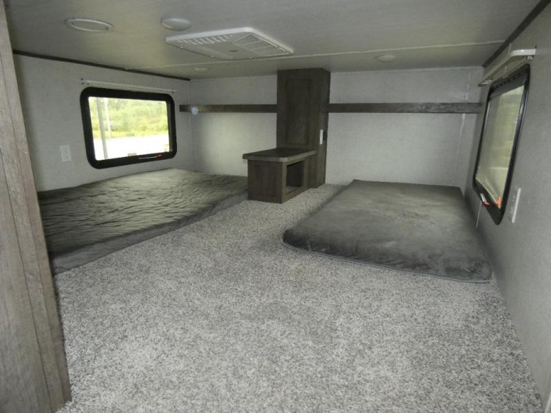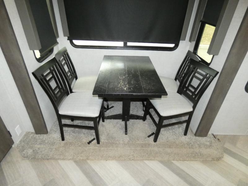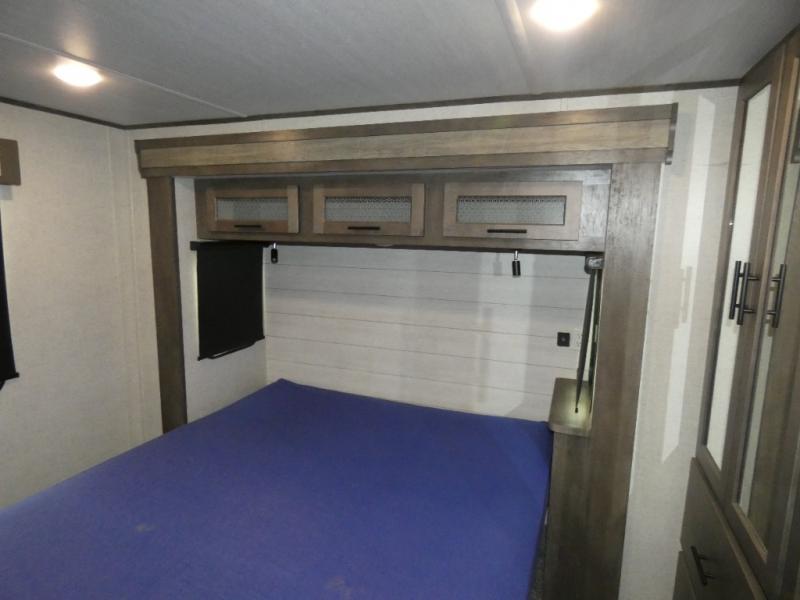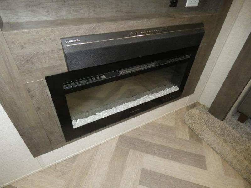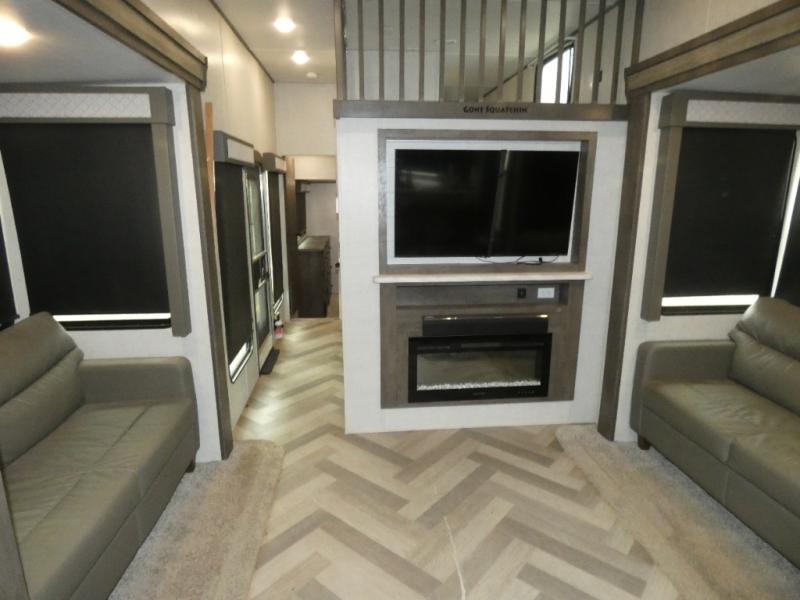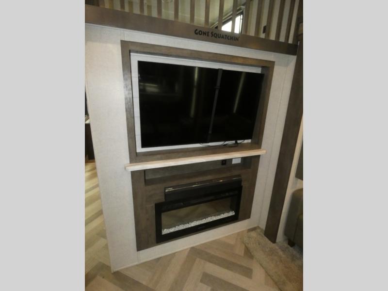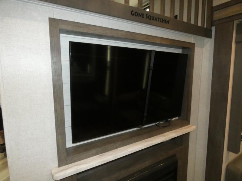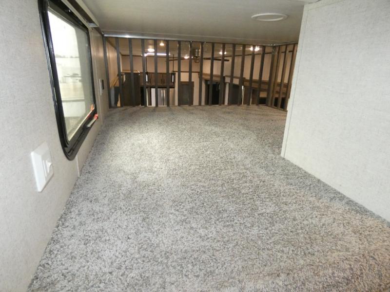 Let all of your cares go free with this Wildwood Grand Lodge destination trailer! Forget about trying to squish your family into one tiny unit because this trailer gives you space to spread out and enjoy yourself. In the central portion of this trailer, you will find a living area that has opposing sofa slides, an entertainment center, a fireplace, and even a ceiling fan. While the chef of the family is preparing dinner in the front kitchen, you can sit down at the free-standing table with chairs to chat with them. To keep your kids from running around on the main level while you are getting dinner ready, you can send them upstairs to the large loft where they can work on puzzles and games.