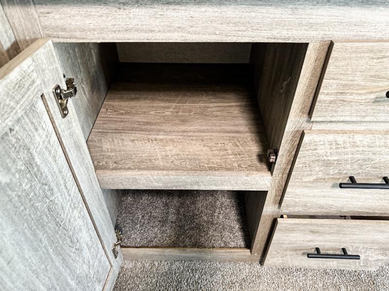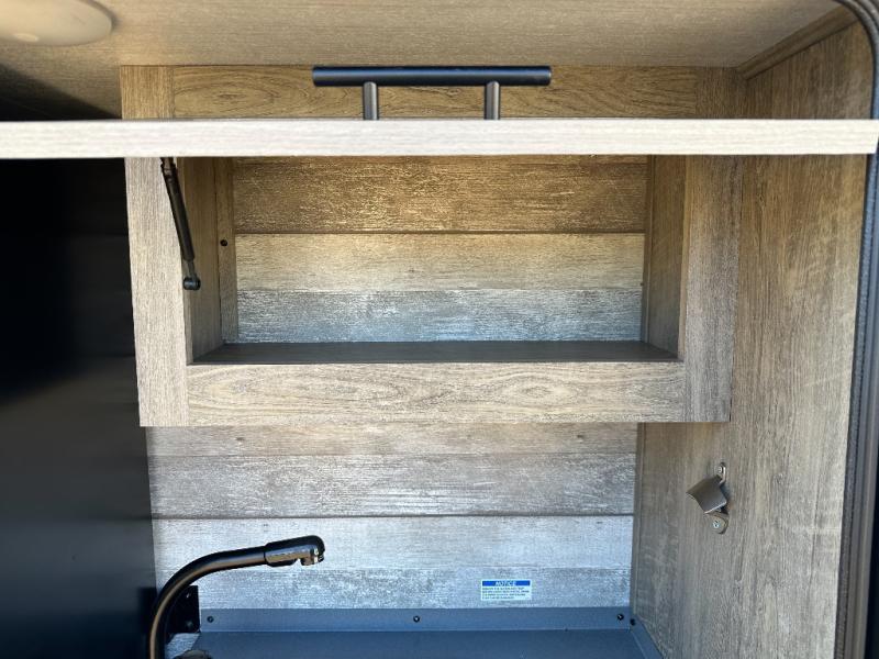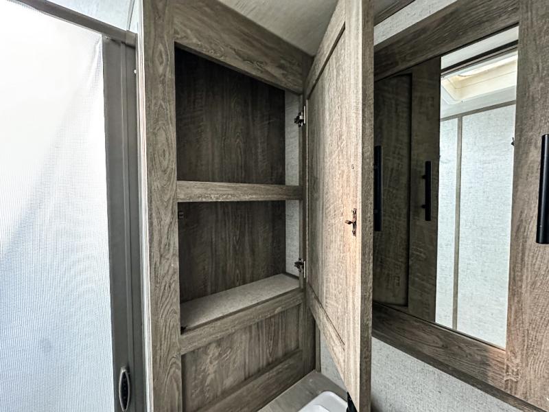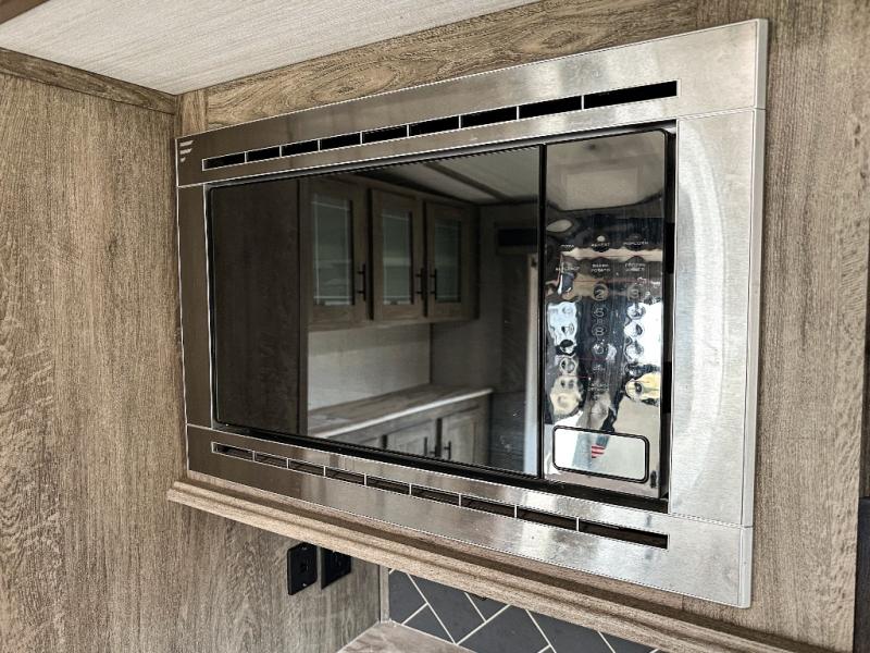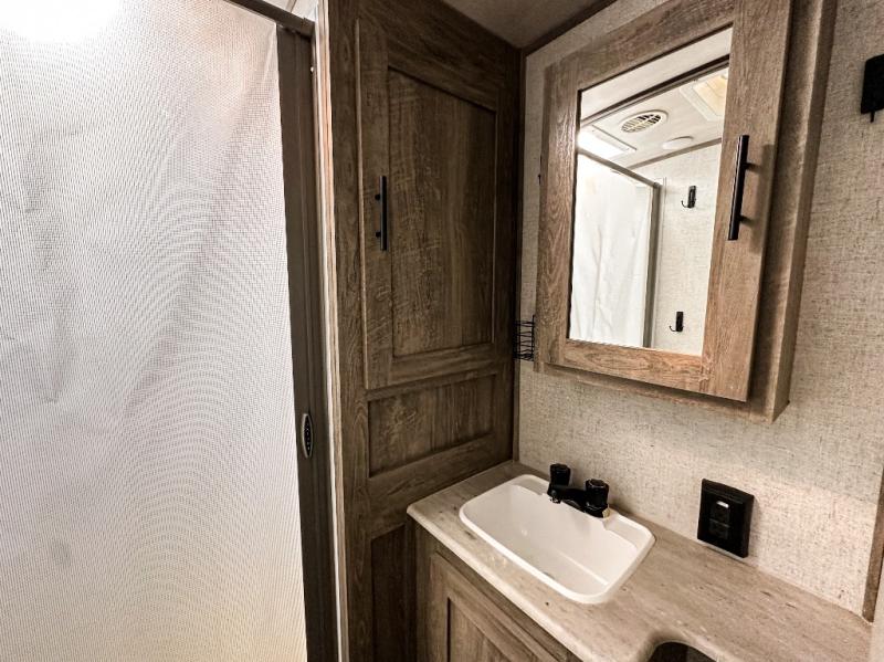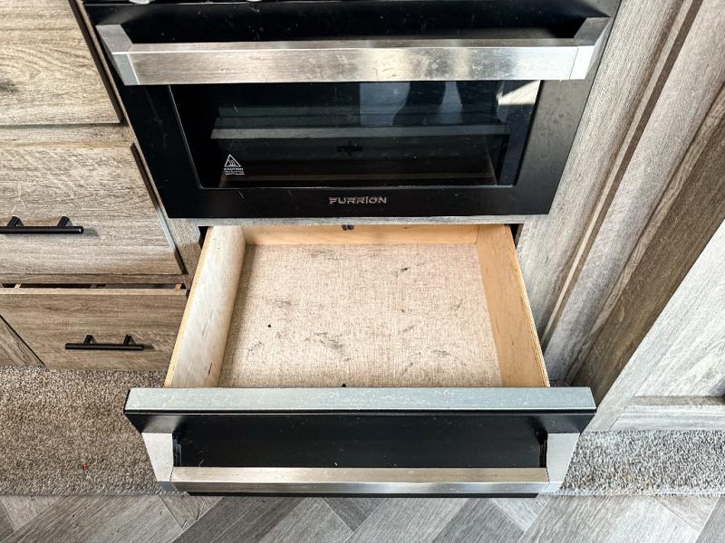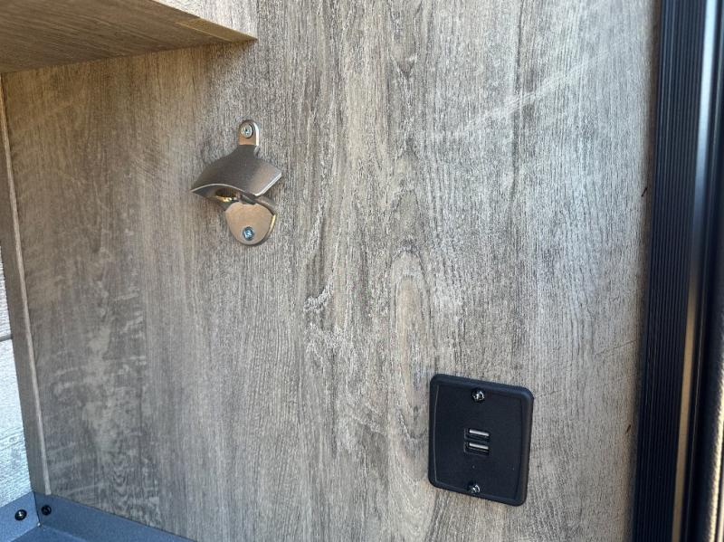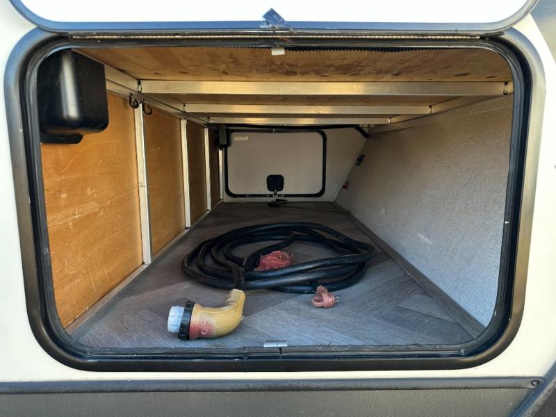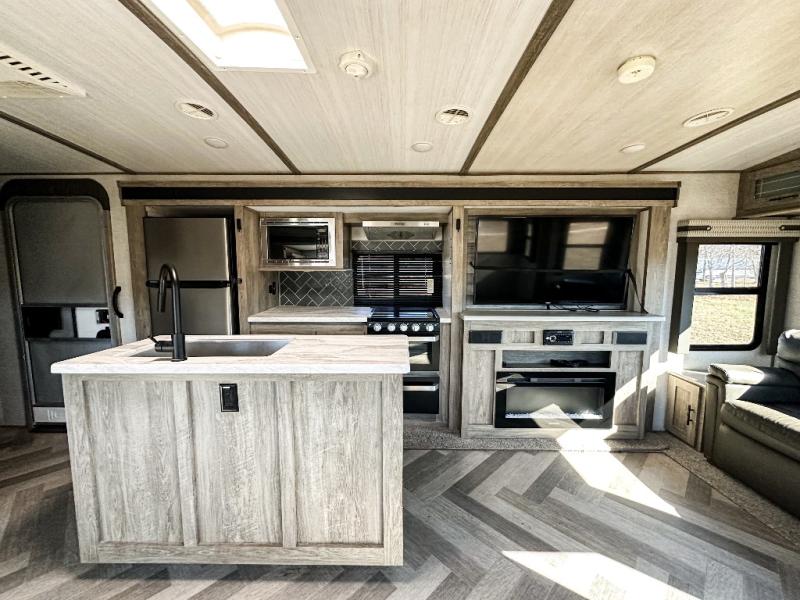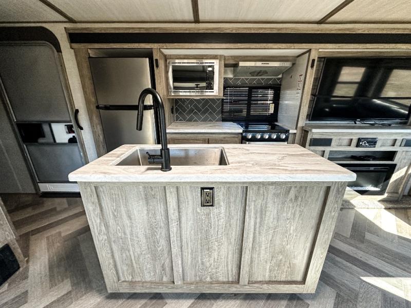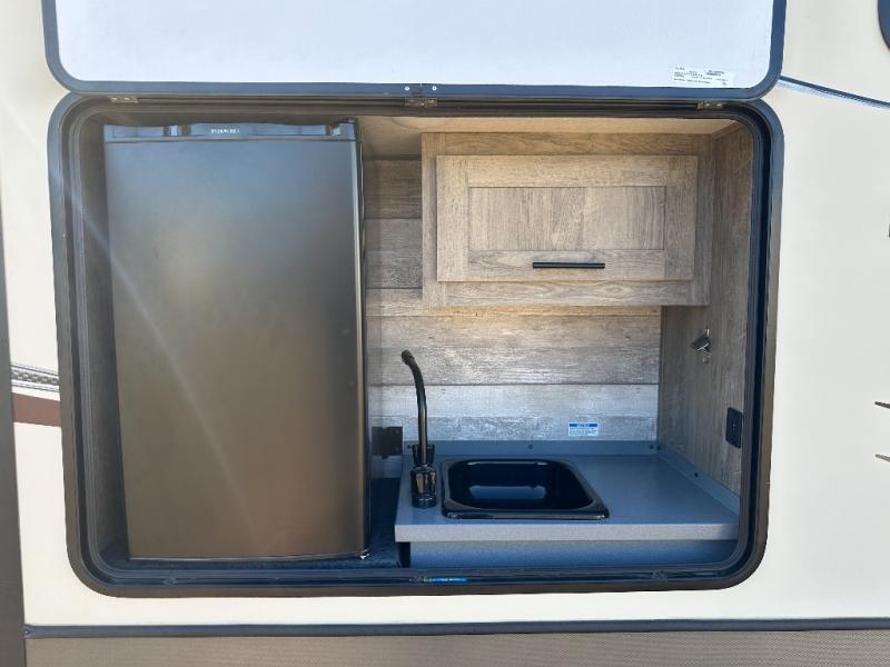 It's time to head to your destination, be it a state park, RV resort, or your own land. Once you arrive, you can easily open up the two slide outs for more interior space, and start planning your day. You might like to cook a meal, wash dishes using the kitchen island, and dine at the booth dinette or choose the free-standing option instead. One thing is for sure, you will love looking out the panoramic window. Your spouse may choose to relax in the theatre seats or the tri-fold sofa and watch TV. The outside kitchen with bar will surely be a useful area when wanting to be outside. Don't worry about storage when the Texas-sized pass-through compartment is available for your camping chairs, tables, fishing rods and such.