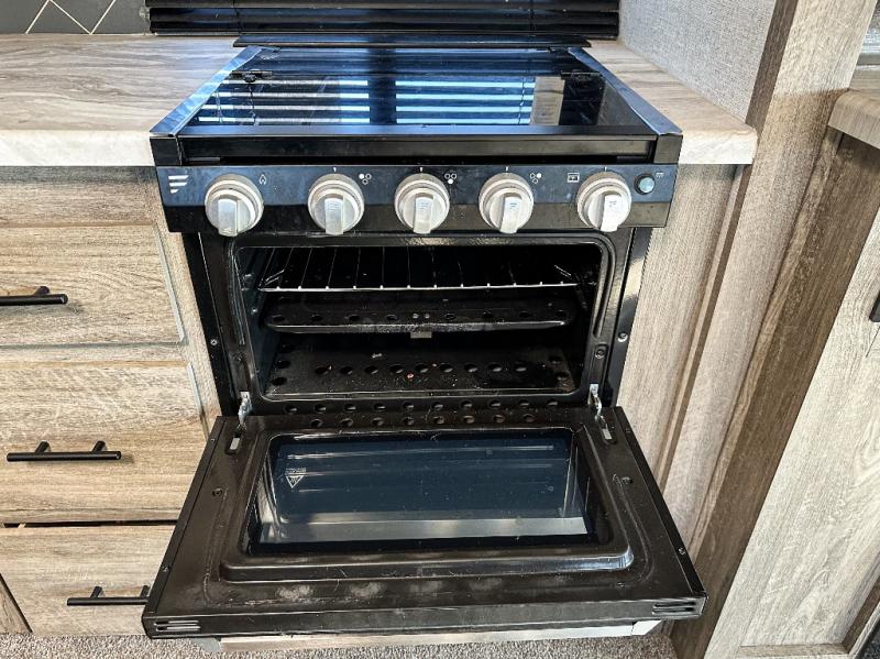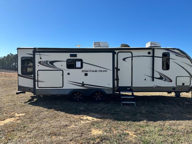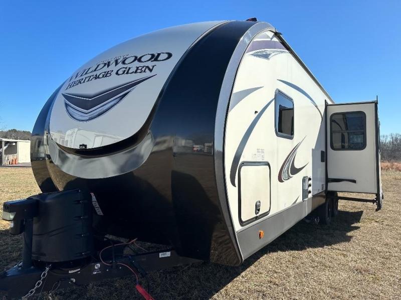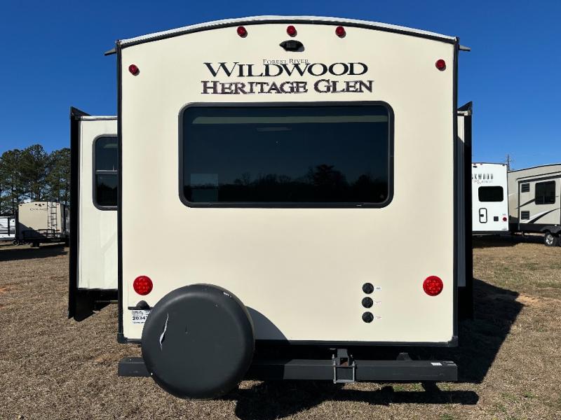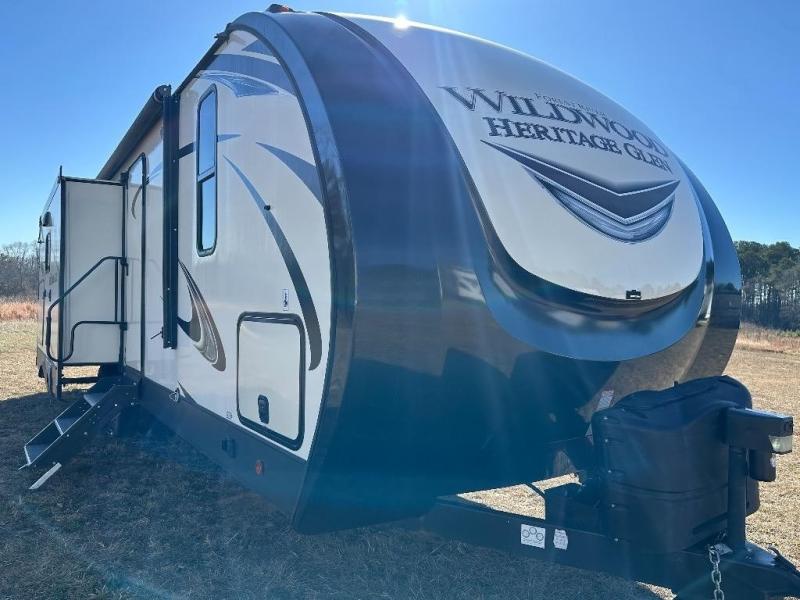 Each Wildwood Heritage Glen travel trailer by Forest River offers a wide stance axle system for stability, a power stabilizer and tongue jacks for quick set up, and Solid-Step entry steps plus an XL Lend-a-Hand entry grab handle to the main entrance for easy access for all. Inside you will love the views from the extra large Max-Tint Panoramic Window package in the main slide, the stainless steel appliances and single bowl undermount sink with roll up sink cover and high rise faucet with pull out sprayer. And the Herringbone Designer's Choice Shaw flooring and Hudson Wood, agreeable grain cabinetry is a nice touch. Choose your favorite trailer today!