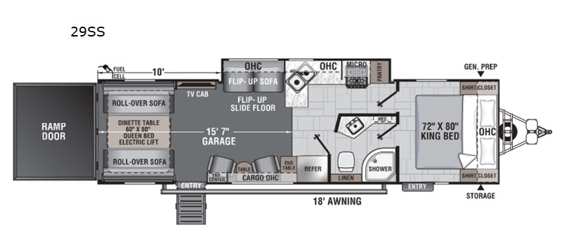 If you've been looking for a toy hauler with more interior space and more sleeping capacity, your search is over! This high profile unit features a large slide out in the kitchen area so your crew can move about freely and the added queen bed electric lift allows you to sleep seven people each night. There are plenty of seating options, including a flip-up sofa, two roll-over sofa, plus two Euro recliners. You'll also appreciate two entry doors; one leading into the 15' 7" garage area, and one directly into the front master bedroom!