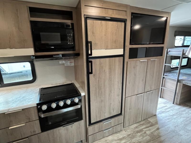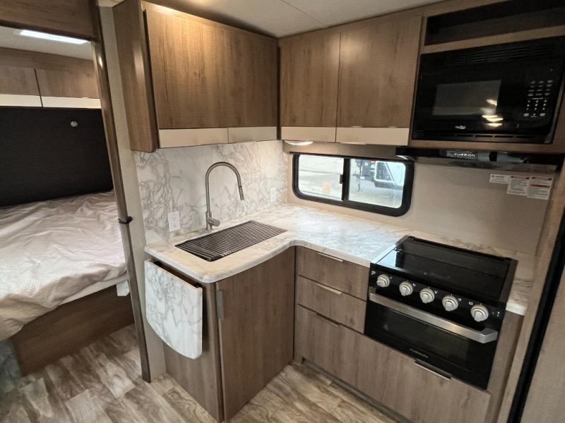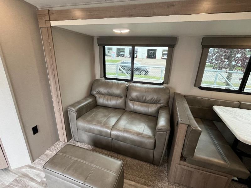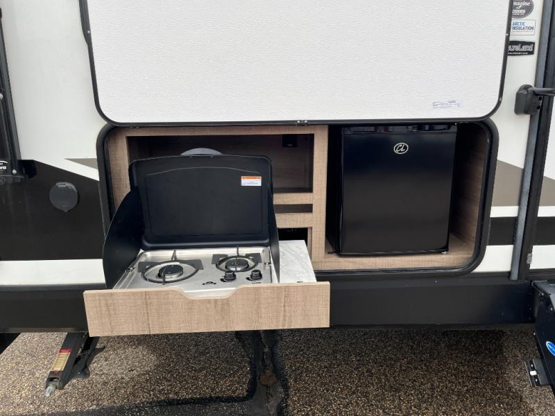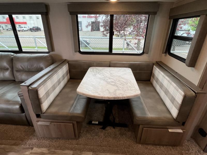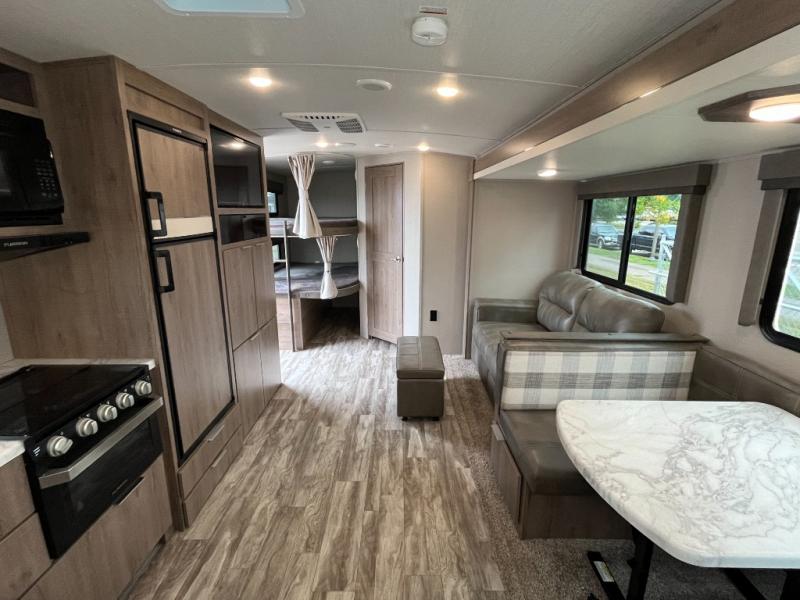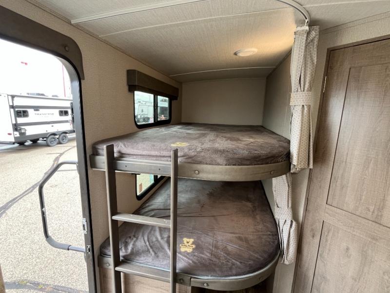 You can daydream about camping but all you need to do is walk inside this travel trailer to see how the floorplan fits your family. You will find bedding for six on the queen bed and bunk beds, plus three to four more if you fold down the U-shaped dinette and sofa slide out. The chef in the family gets to choose to cook inside with full amenities, or outdoors on the outside kitchen. The kiddos will have their very own space on the double size bunk beds after the bikes have been removed. There is a 32" LED TV with swing arm, shoe storage, and much more to enjoy!