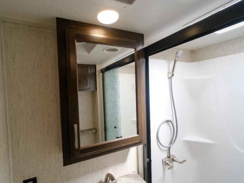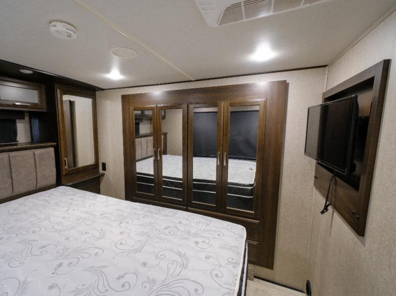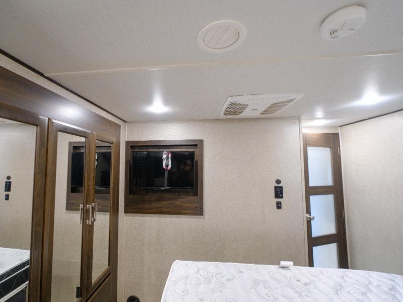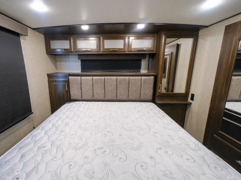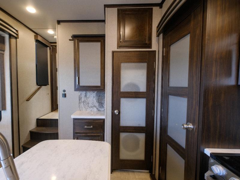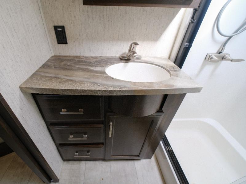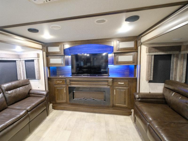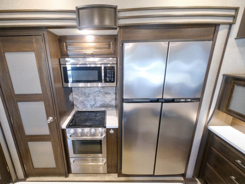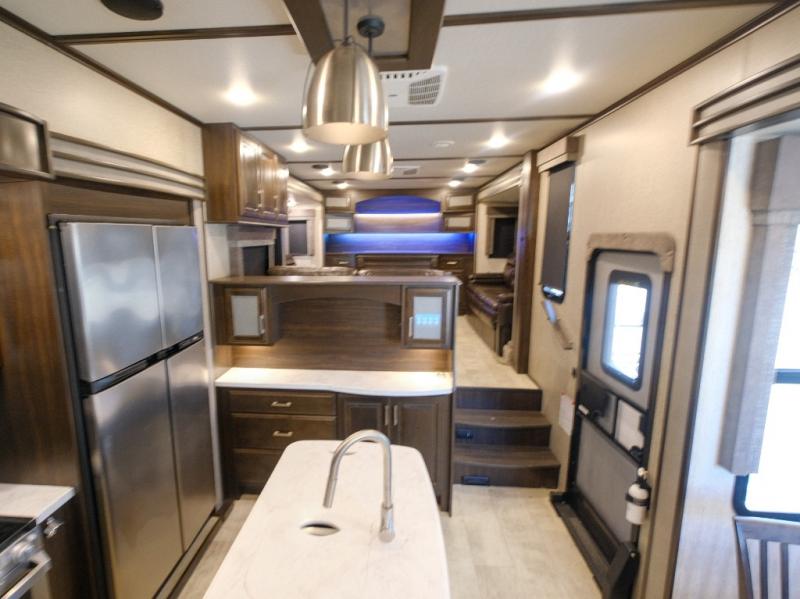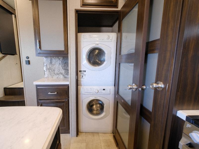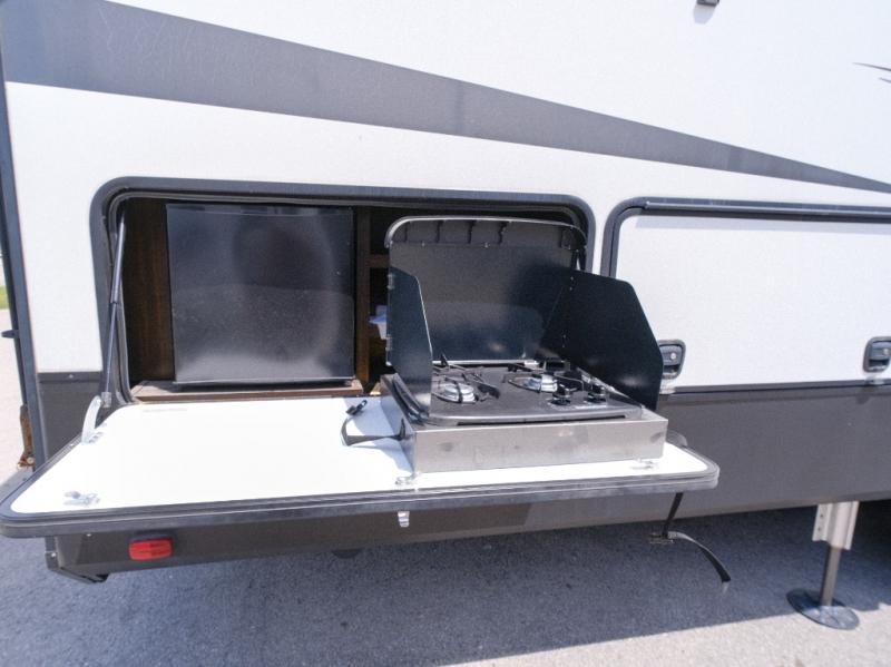 When you are ready for some off-road fun, hitch up this toy hauler fifth wheel to head to your favorite trails! This Momentum 376TH has a unique below floor garage with a bedroom above. After a busy day on the dunes, you can entertain guests in the front living area which includes a telescoping 49" LED TV with fireplace. You will find the separate kitchen area has all the amenities necessary to make and eat meals including a free standing dinette and large pantry. You can even use the washer and dryer in the second pantry if you want to keep your clothes clean the whole trip. You may choose to cook outdoors on the outside kitchen while watching the exterior LED TV. There is much more to see inside and outside this toy hauler!