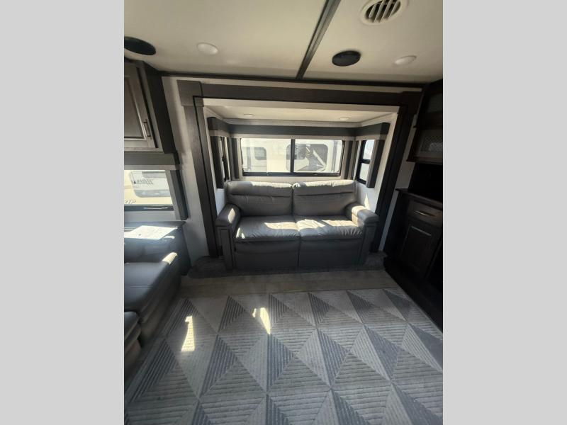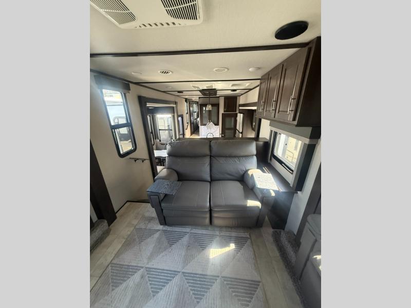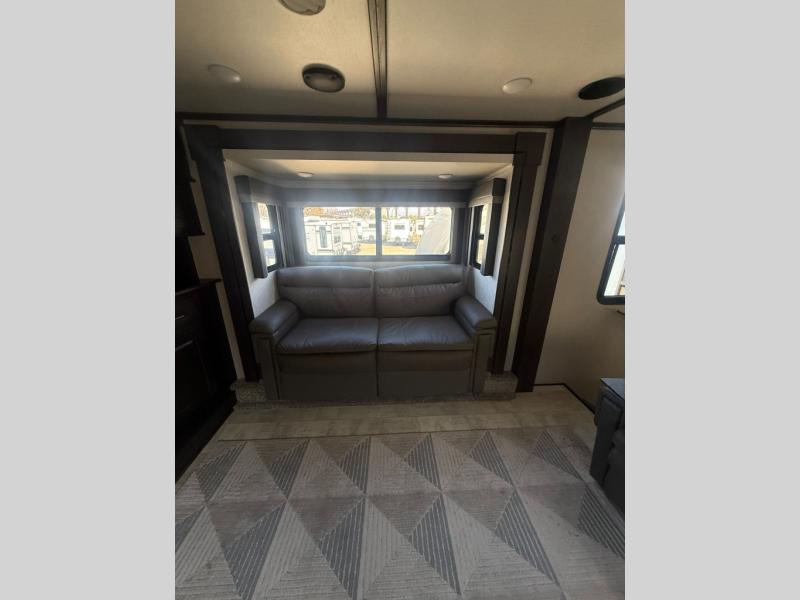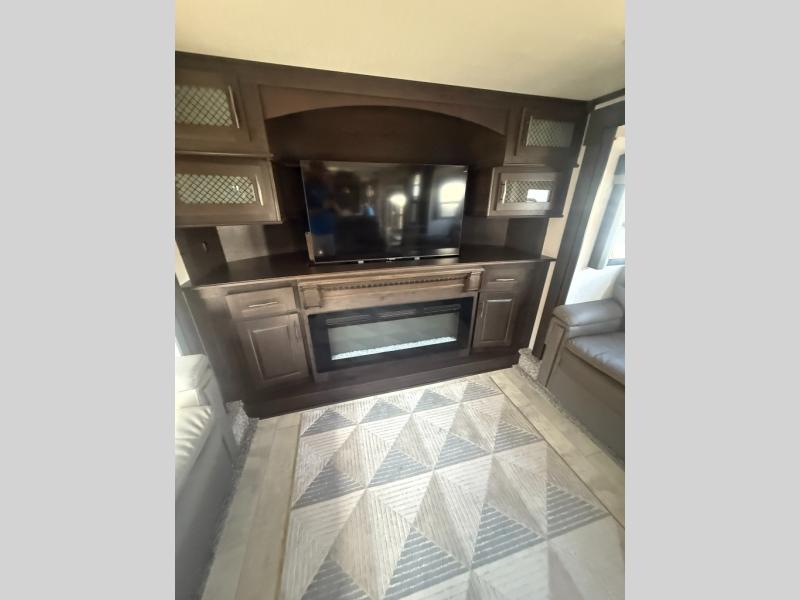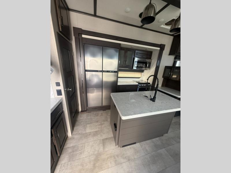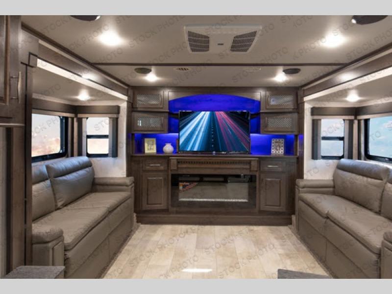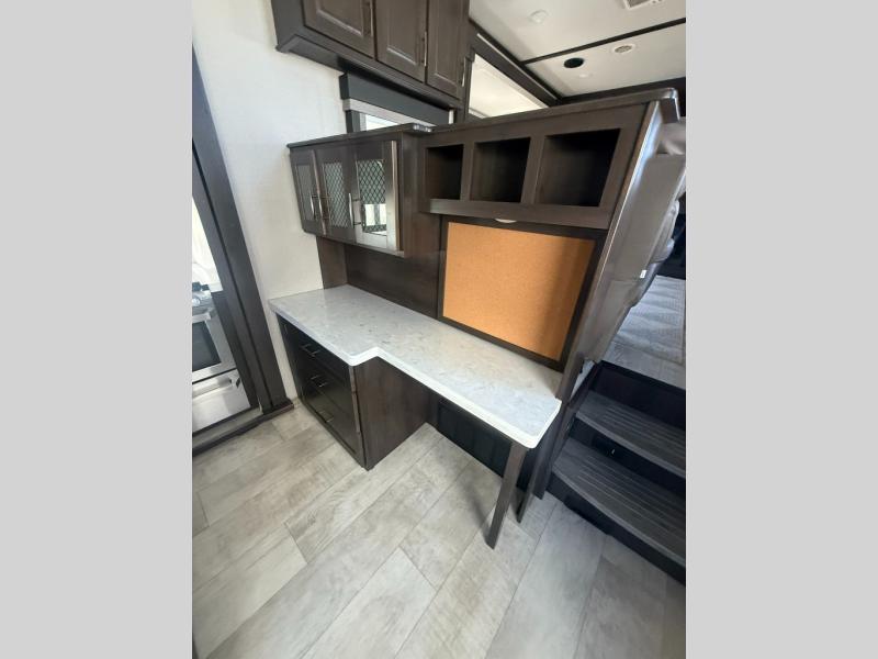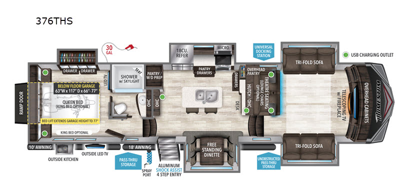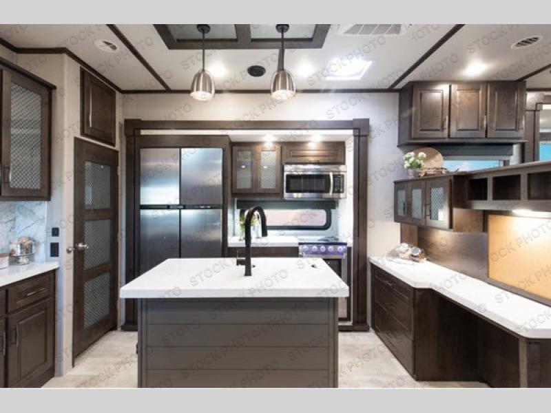 Gain momentum for your upcoming adventures by choosing this Momentum toy hauler to start the journey off right! The below-floor garage allows you to relax comfortably in the rear bedroom while your cargo is stored away underneath, and the bed lift extends the garage height to 6' 5" for tons of space. The dual-entry bath will come in handy at night so that you have easy access from the bedroom, and your guests can use the hallway entrance. Step down to the kitchen area where you'll find opposing slides for more space, a kitchen island with stools that the kids are sure to love, and plenty of storage with the pantry drawers, a hutch with a desk, and an additional pantry. After a day of riding the trails outside, you're going to love relaxing in the front living room which includes two tri-fold sofas, theater seating, and a telescoping TV with a fireplace below for all-around comfort.