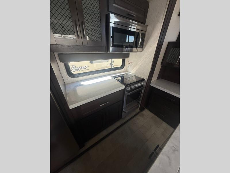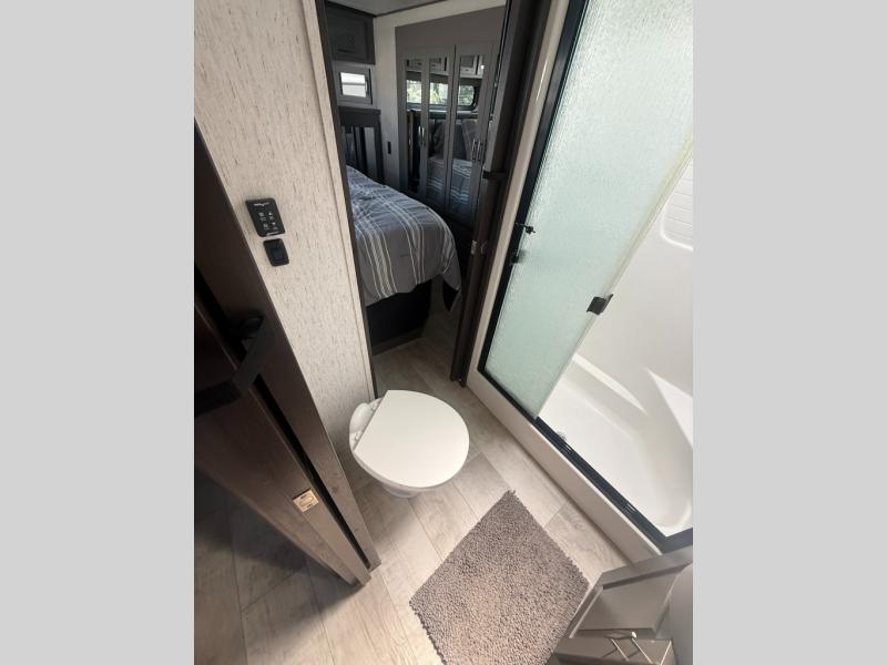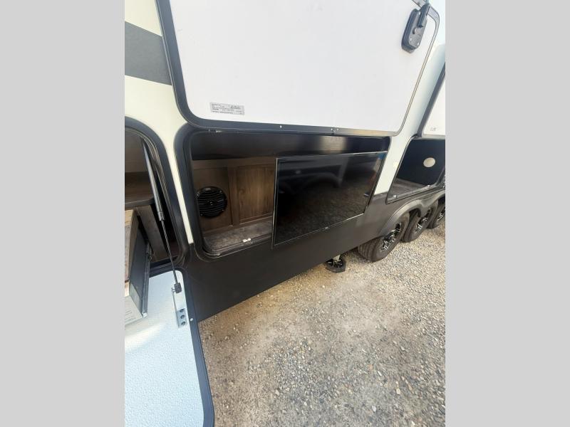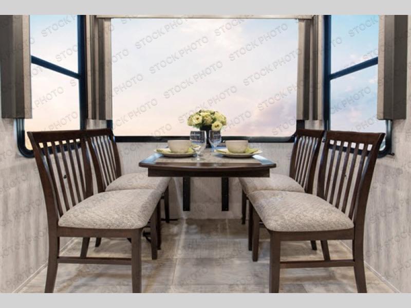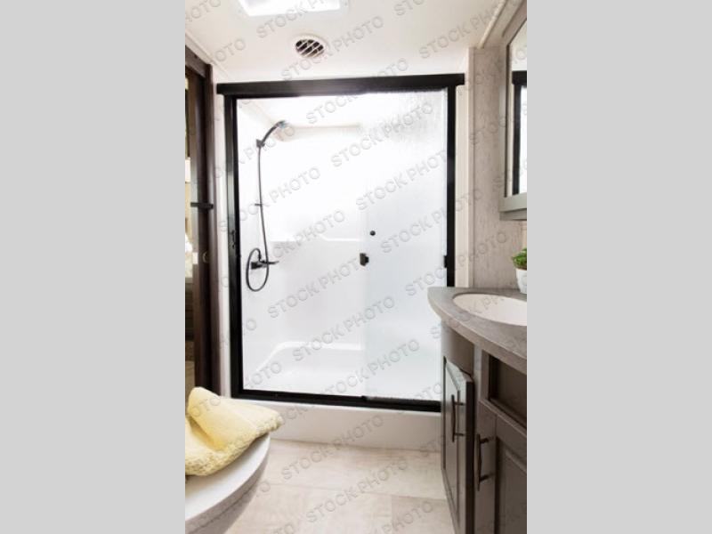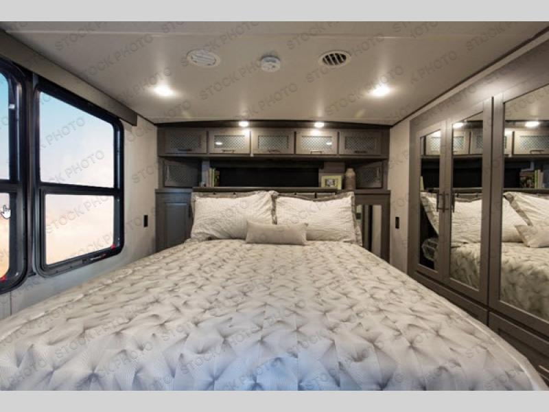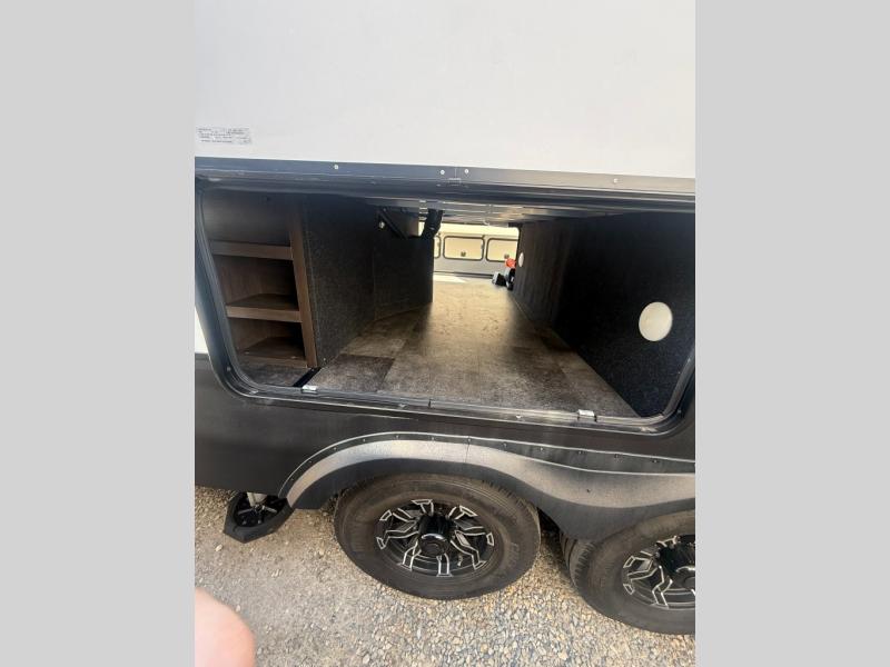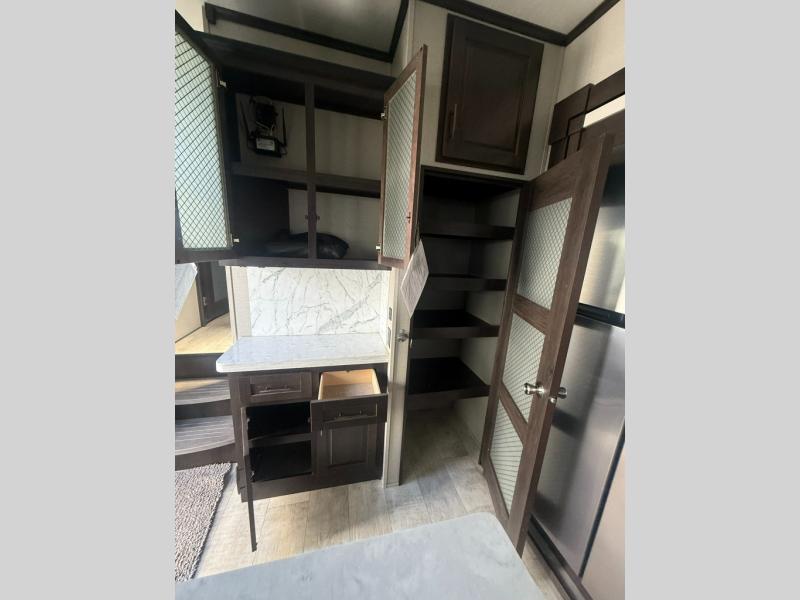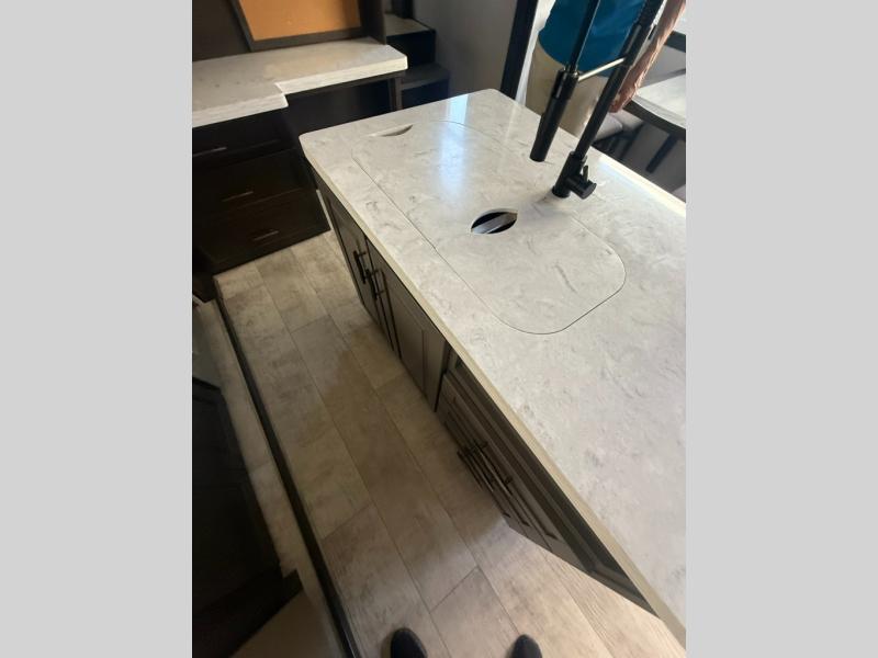 Gain momentum for your upcoming adventures by choosing this Momentum toy hauler to start the journey off right! The below-floor garage allows you to relax comfortably in the rear bedroom while your cargo is stored away underneath, and the bed lift extends the garage height to 6' 5" for tons of space. The dual-entry bath will come in handy at night so that you have easy access from the bedroom, and your guests can use the hallway entrance. Step down to the kitchen area where you'll find opposing slides for more space, a kitchen island with stools that the kids are sure to love, and plenty of storage with the pantry drawers, a hutch with a desk, and an additional pantry. After a day of riding the trails outside, you're going to love relaxing in the front living room which includes two tri-fold sofas, theater seating, and a telescoping TV with a fireplace below for all-around comfort.