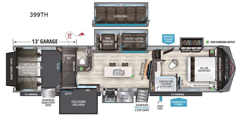 If you are ready to play with your off-road toys, then it's time to hitch up this Momentum fifth wheel toy hauler after loading your toys in the 13' separate garage. You will be able to get cleaned up after getting muddy from the trails in the half bath in the garage or the sunken tub with skylight in the full bathroom up in the master suite. The kids can sit at the kitchen island with bar stools or relax on the theater seats while watching the 49" LED TV and fireplace. The fold-down side patio is going to be your favorite spot when summertime rolls around, and the exterior unobstructed pass-through storage compartment will allow you to bring along some lawn chairs that you can set up on the patio.