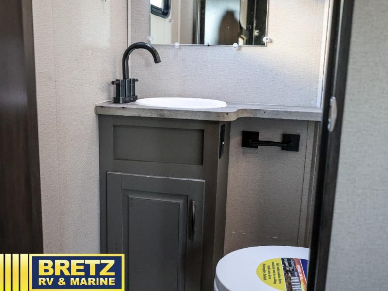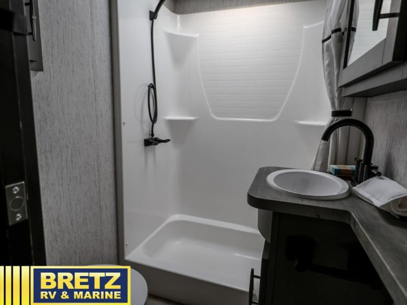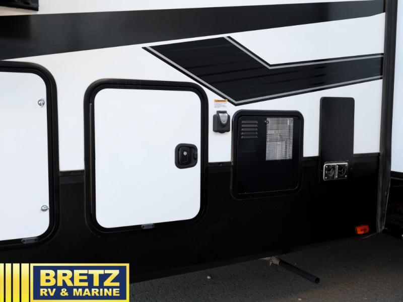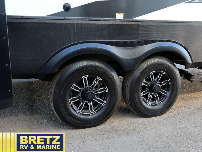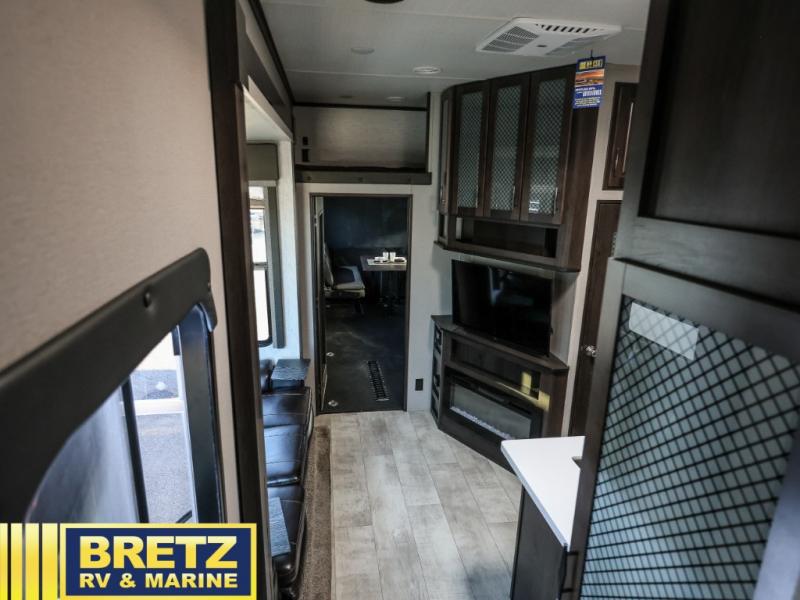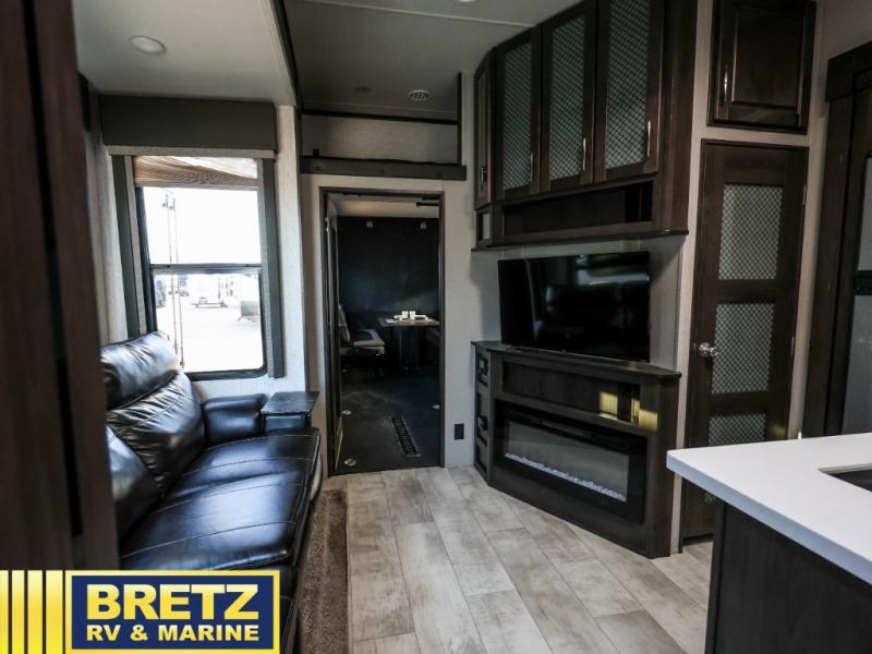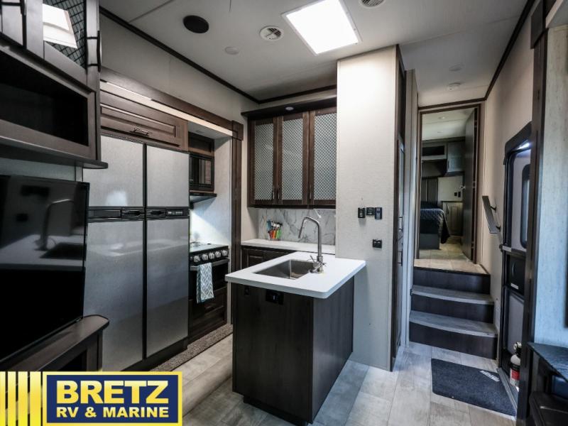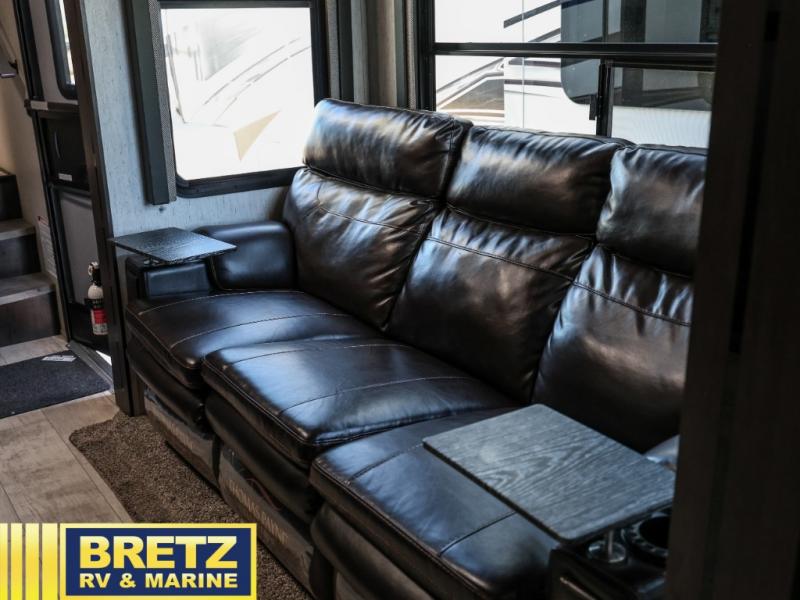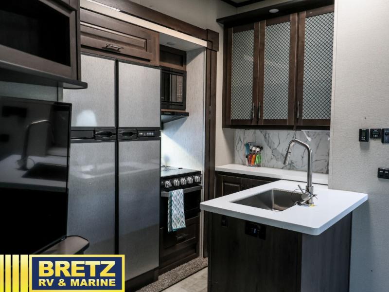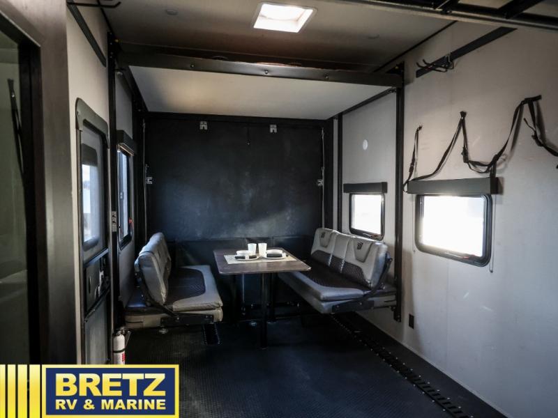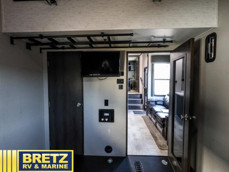 Just imagine the fun you will have with this Momentum G-Class toy hauler set up at any off-road park. With the 14' 6" separate garage that includes a half bath, a second exterior entry door, rollover sofas, a power bunk, and a loft, you will have your own area to do what you like. The rear ramp door can even be converted into a patio if you need more outdoor living space. The main living area offers a fireplace, theater seating, and kitchen appliances away from the dirty garage floor. You will also be able to stay clean and ready for the next ride with the sunken tub/shower in the full bathroom, and the front master bedroom has plenty of storage for clothing with the wardrobe slide and overhead cabinets. You might even choose to add a washer and dryer option to this trailer to keep everything clean while away from home.