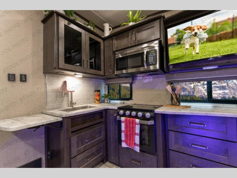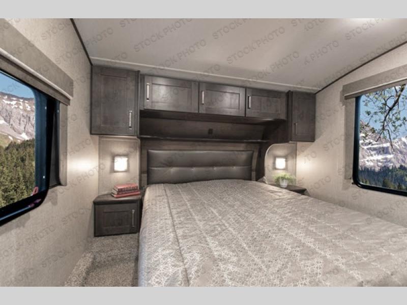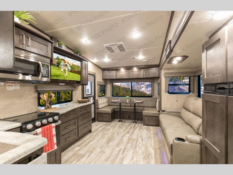 Load up lots of cold food in the 12 cu. ft. refrigerator to enjoy a weekend away from it all! The dry food can be placed in the pantry and overhead cabinets, depending where you want everything. You will enjoy having the appliances near by to make a warm meal in the L-shaped corner kitchen that is next to the entry in case you need to carry anything outside to eat under the 20' power awning. And you can grab your camp chairs from the exterior unobstructed pass-through storage. You might prefer to dine at the U-shaped dinette with a view, and watch TV from the theatre seating with massage feature. At night you can get cleaned up in the full bathroom with a walk-in shower, and fall quickly to sleep on your own queen bed.