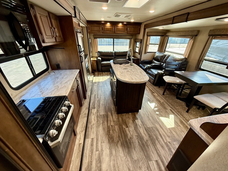 This unit is perfect for any couple seeking an outdoor adventure that is also looking to enjoy a bit of at-home comforts as well. Just imagine cooking in a gourmet kitchen with a center island and large sink, plus watching a 40" TV with a fireplace below. You can look out the windows and enjoy your RVing lifestyle while cooking or relax on the tri-fold sofa or the theater seating. You will love the front master bedroom which includes a queen bed and plenty of storage, plus an area to add the optional washer/dryer. There is more storage throughout for all your traveling items, as well as an exterior unobstructed pass-through compartment that allows you to stow away your larger items. Don't forget about the outside kitchen and shower, the real reason you chose this model!