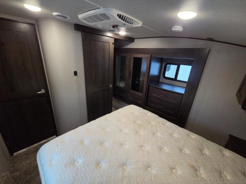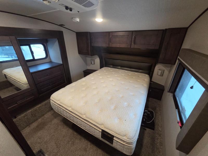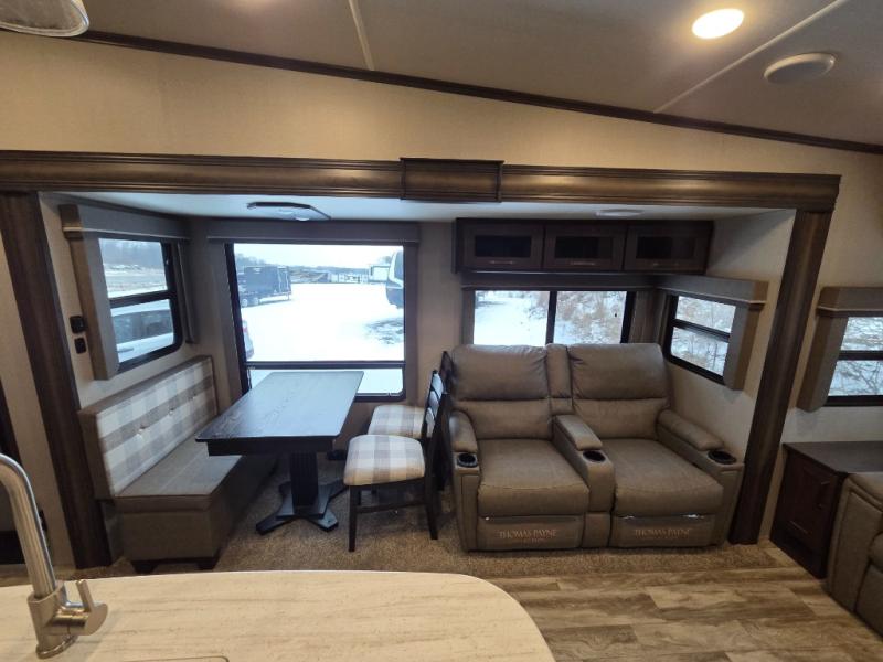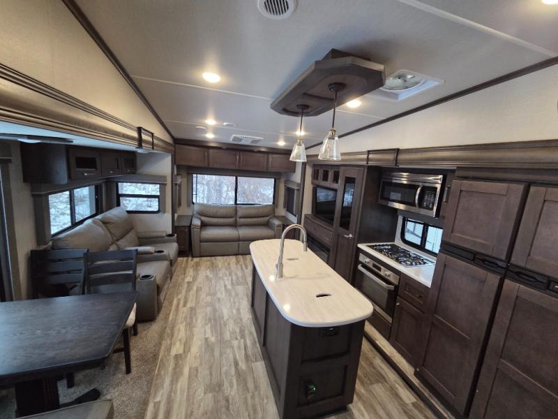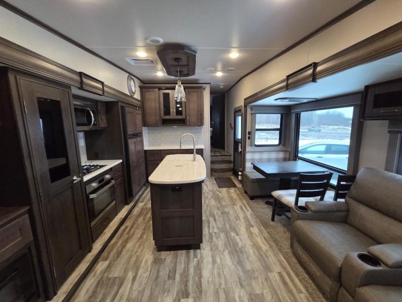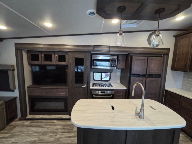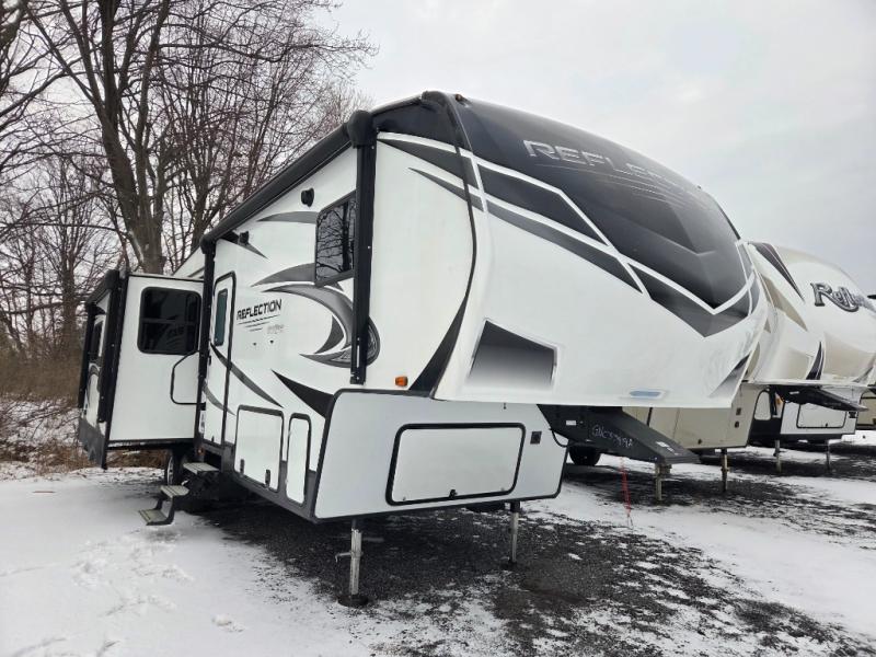 You will enjoy the comforts of home while on the road with this Reflection fifth wheel! It features a front private bedroom with a queen bed for you to enjoy a good night's rest, under the bed storage, and closets/drawers for you to keep all of your clothes neat and tidy. After an adventurous day, you can head to the rear living area where you will have your choice to relax on either the tri-fold sofa or the theater seats while you watch your favorite movie on the 40" TV or enjoy a cozy fire in the fireplace. The kitchen has everything you will need to whip up your best meals including a kitchen island with a large sink to make your clean up a breeze. Don't forget about storing your camp chairs and golf clubs in the exterior unobstructed pass-through compartment too. This model has many more standard features to enjoy and options to choose from, come see today!