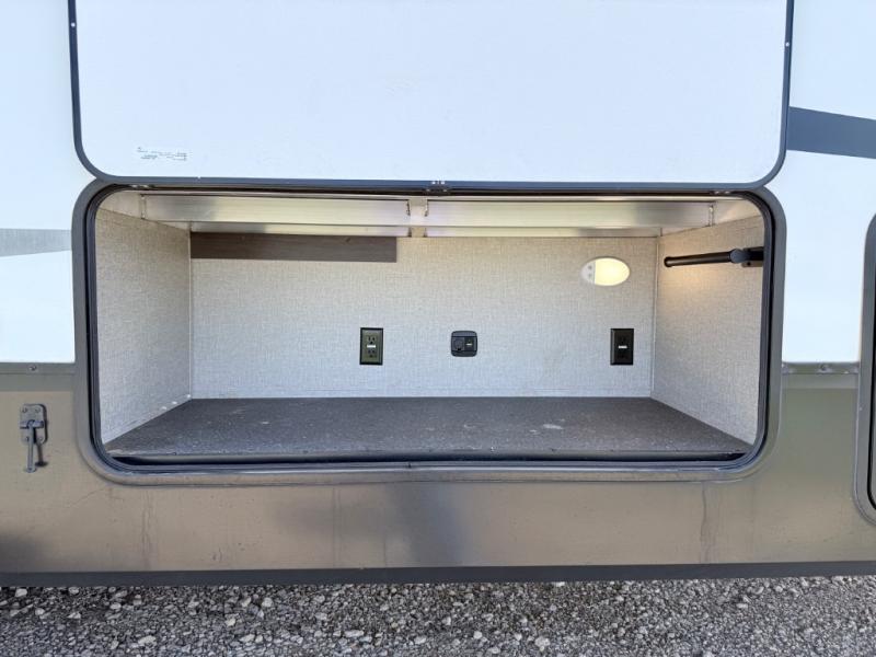 This two bedroom Reflection fifth wheel is just what you and your family will want when taking your next family camping vacation! Your kiddos are sure to love having their own private bunkhouse with a large window for them to enjoy the view at night. You will enjoy your own oasis in the front private bedroom with a queen bed for you to rest up after an adventurous day, and the full bathroom is between the two rooms allowing everyone easy access. The rear dining and living area offers a U-shaped dinette with a large window to enjoy the view of the great outdoors while eating a meal together. The 78" theater seating includes cupholders and a fun way to watch the 40" TV with a fireplace below it. You will find plenty of storage throughout and the chef will love the kitchen layout with a center island, large sink and plenty of storage in the pantry. Load up today!