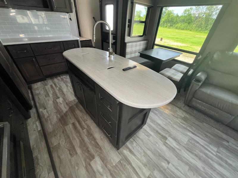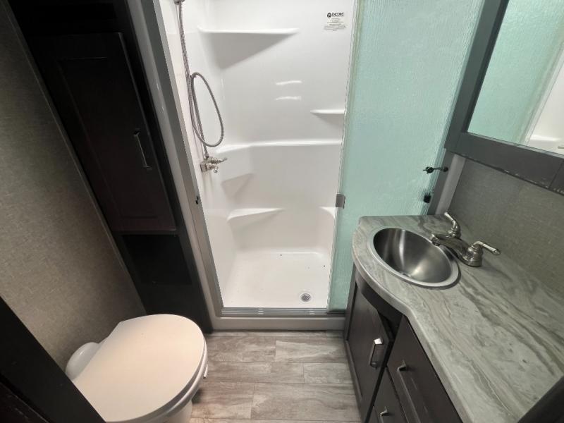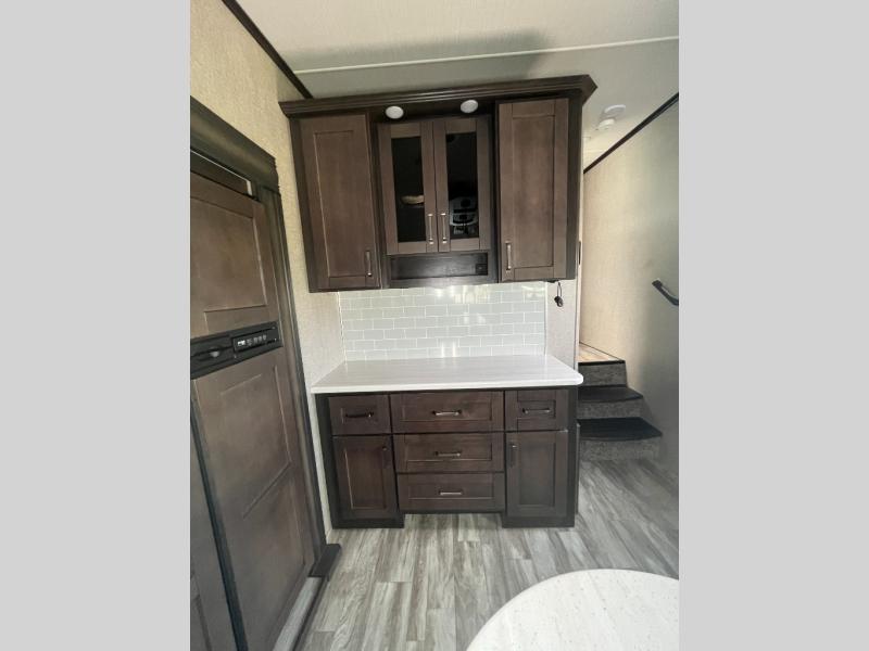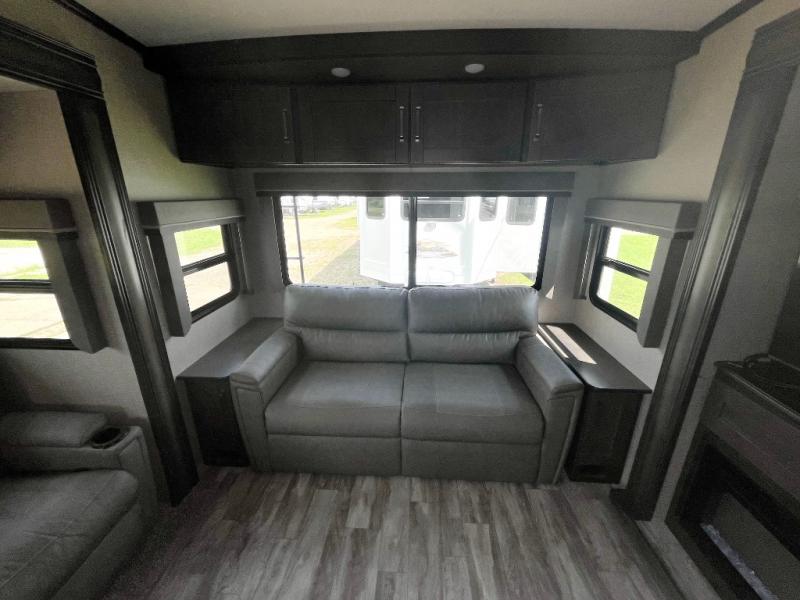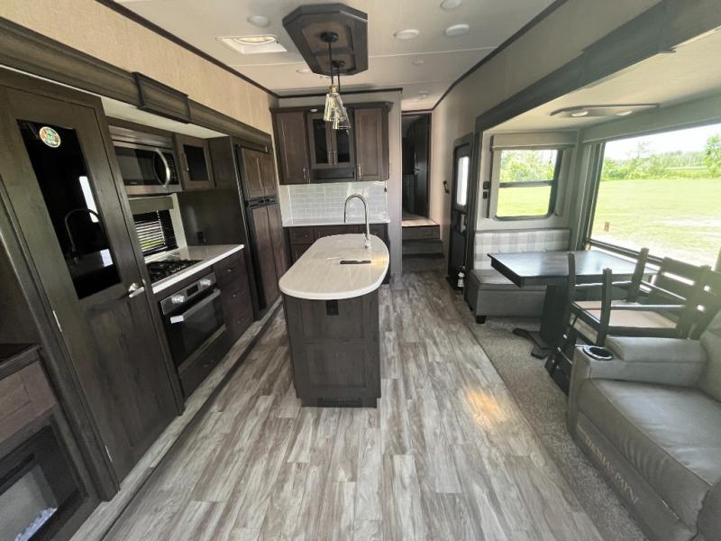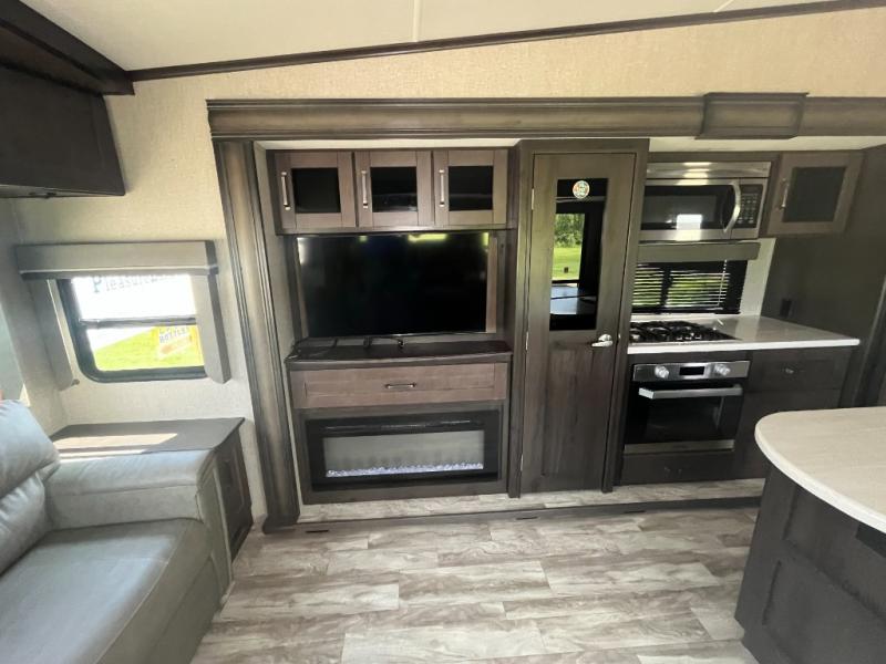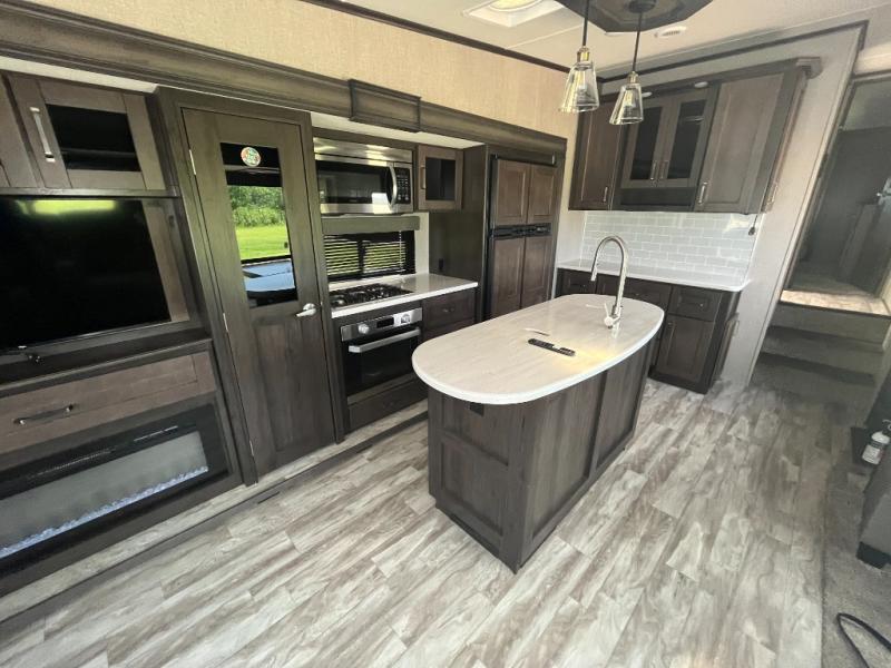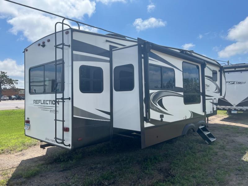 Do you wish to escape the hustle and bustle of your busy life? Well then, check out this Reflection fifth wheel! It features everything you will need to have yourself a good time from the rear living area with a 40" TV and a cozy fireplace for you to warm up at night with to the kitchen island with a large sink to make your cleanup a breeze. You will love all that the exterior has to offer with the two awnings, the coax TV hookup, and the unobstructed pass-through compartment to hold all of your outdoor gear. At night, you can pop a bag of popcorn in the convection microwave and relax on either the tri-fold sofa or the theater seats. Take a look today!