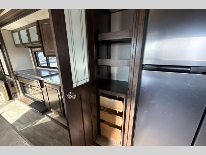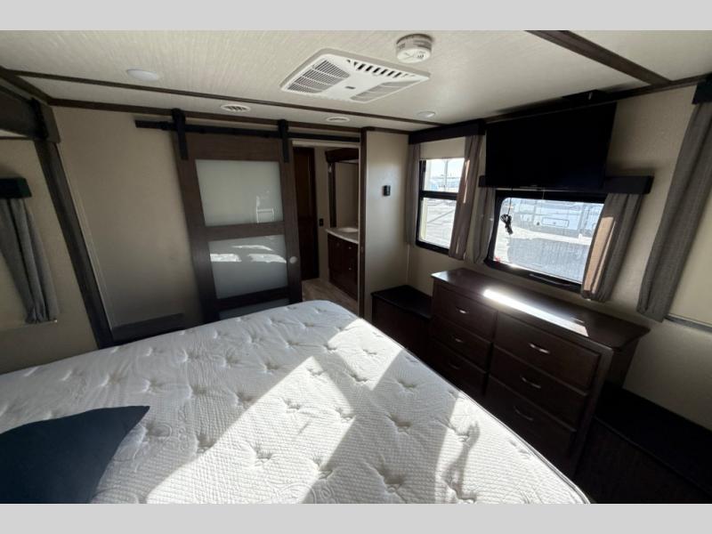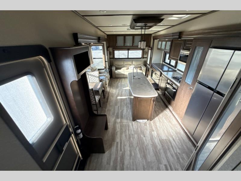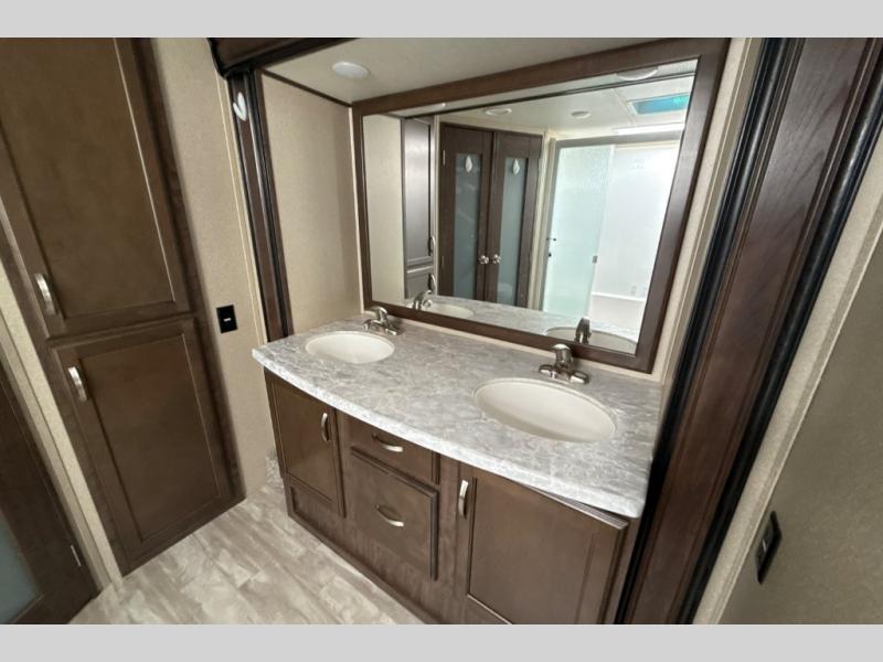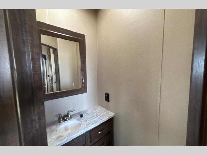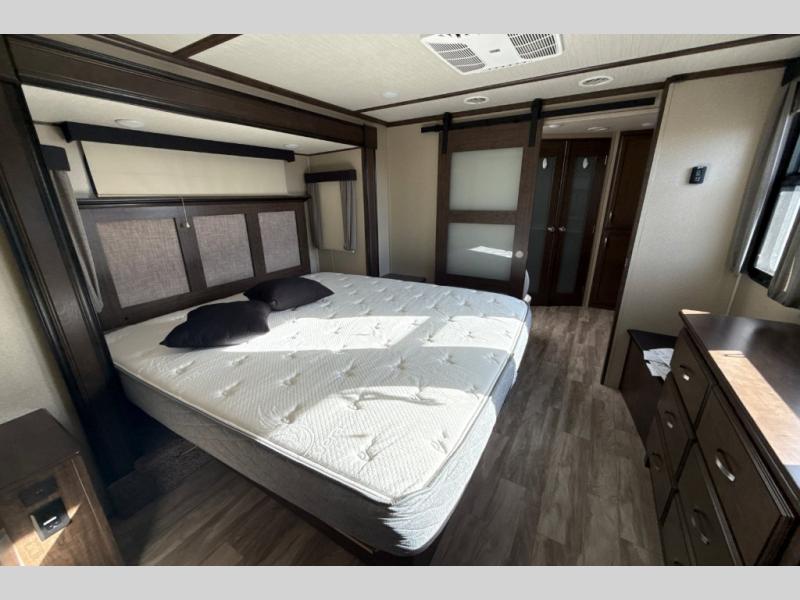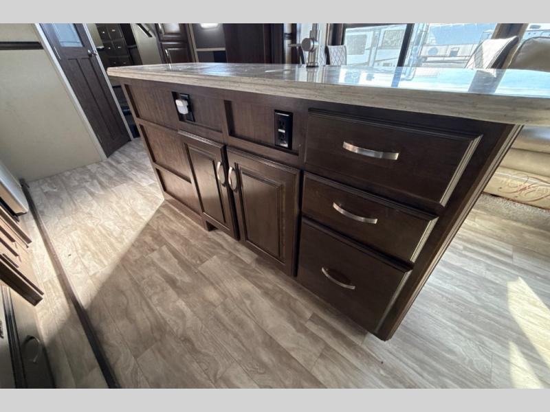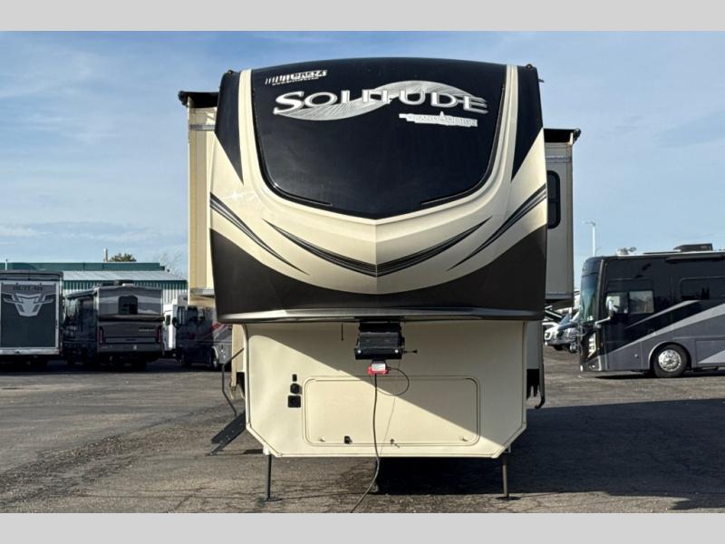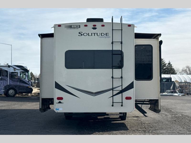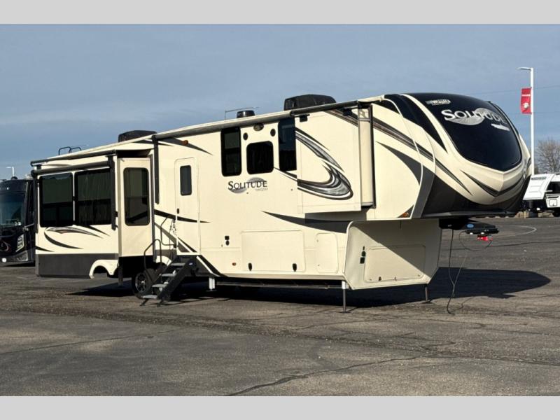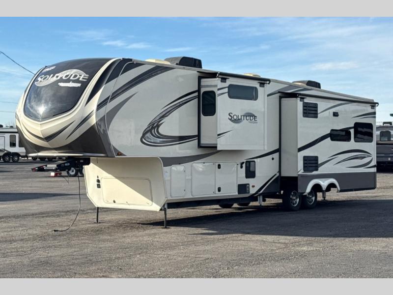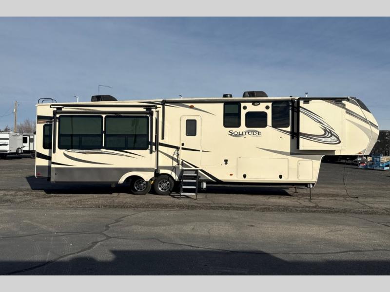 Imagine the convenience of having a full master bathroom with dual sinks, an additional half bath, plus storage everywhere you look around this Solitude fifth wheel. From the two closets next to the entry door, the large walk-in wardrobe in the master bath, the under-bed storage, and all the overhead cabinets throughout, you will have plenty of space to invite the grandkids for a week-long stay. Now start thinking about how you will enjoy the walk-through master bedroom with a flip-top dresser, dual benches, and a TV. The cook in the family will surely love making meals in the kitchen on the island. You might even like to choose a few options to make this the perfect full-timer RV!