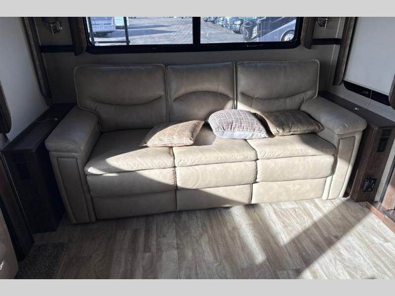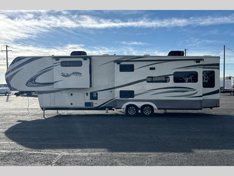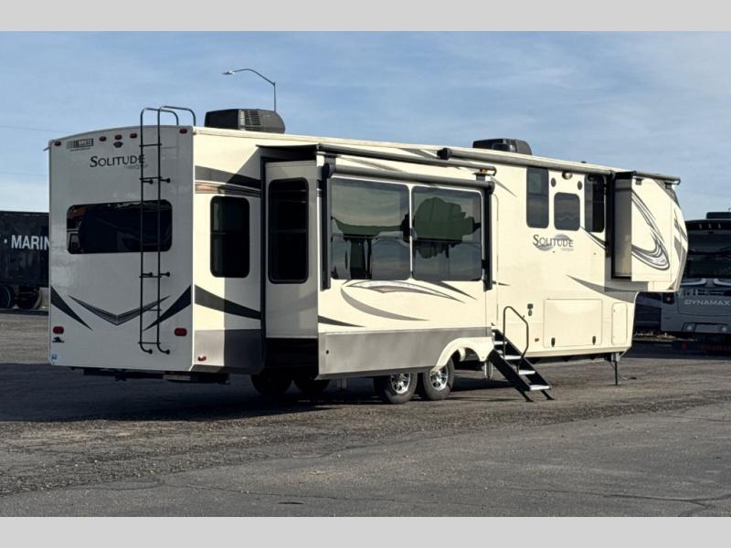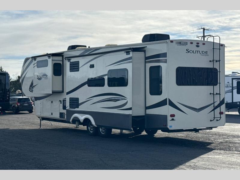 With each Solitude fifth wheel by Grand Design, you will receive refined residential finishes and affordable luxury for your extended stays or weekend getaways. From the solid foundation that rests upon an exclusive superchassis and the maximum insulation to the taller ceilings, taller and deeper cabinets, and the power reclining theatre seating with removable swivel tables and heat and massage, you will be impressed! The pet dish drawer, the Stealth AC system, and the Weather-Tek package that allows you to travel during any season will also give you many more reasons to love everything about your Solitude. It's time to redefine luxury living wherever you decide to land.