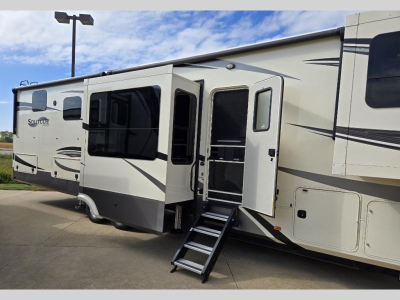 With each Solitude fifth wheel by Grand Design, you will receive refined residential finishes and affordable luxury for your extended stays or weekend getaways. From the solid foundation that rests upon an exclusive superchassis and the maximum insulation to the taller ceilings, taller and deeper cabinets, and the power reclining theatre seating with removable swivel tables and heat and massage, you will be impressed! The pet dish drawer, the Stealth AC system, and the Weather-Tek package that allows you to travel during any season will also give you many more reasons to love everything about your Solitude. It's time to redefine luxury living wherever you decide to land.