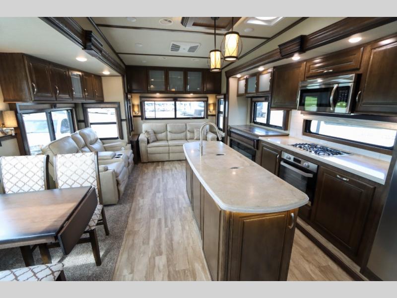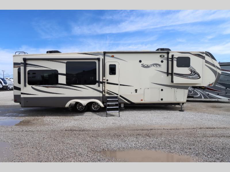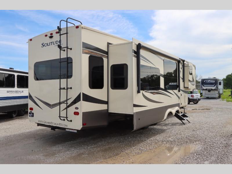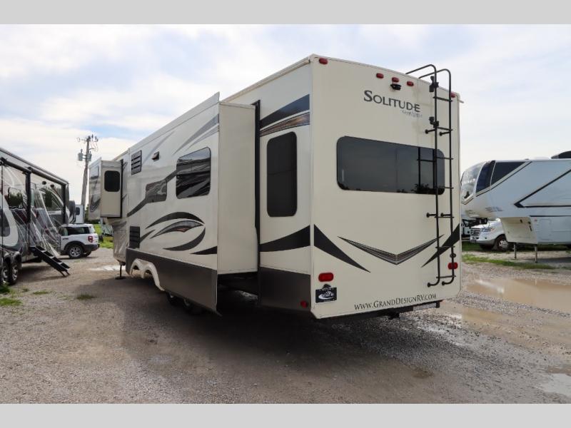 With each Solitude fifth wheel by Grand Design, you will receive refined residential finishes and affordable luxury for your extended stays or weekend getaways. From the solid foundation that rests upon an exclusive superchassis and the maximum insulation to the taller ceilings, taller and deeper cabinets, and the power reclining theatre seating with removable swivel tables and heat and massage, you will be impressed! The pet dish drawer, the Stealth AC system, and the Weather-Tek package that allows you to travel during any season will also give you many more reasons to love everything about your Solitude. It's time to redefine luxury living wherever you decide to land.