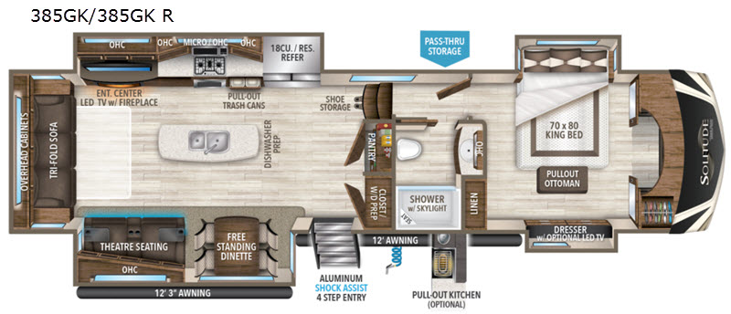 With each Solitude fifth wheel by Grand Design, you will receive refined residential finishes and affordable luxury for your extended stays or weekend getaways. From the solid foundation that rests upon an exclusive superchassis and the maximum insulation to the taller ceilings, taller and deeper cabinets, and the power reclining theatre seating with removable swivel tables and heat and massage, you will be impressed! The pet dish drawer, the Stealth AC system, and the Weather-Tek package that allows you to travel during any season will also give you many more reasons to love everything about your Solitude. It's time to redefine luxury living wherever you decide to land.