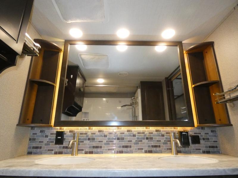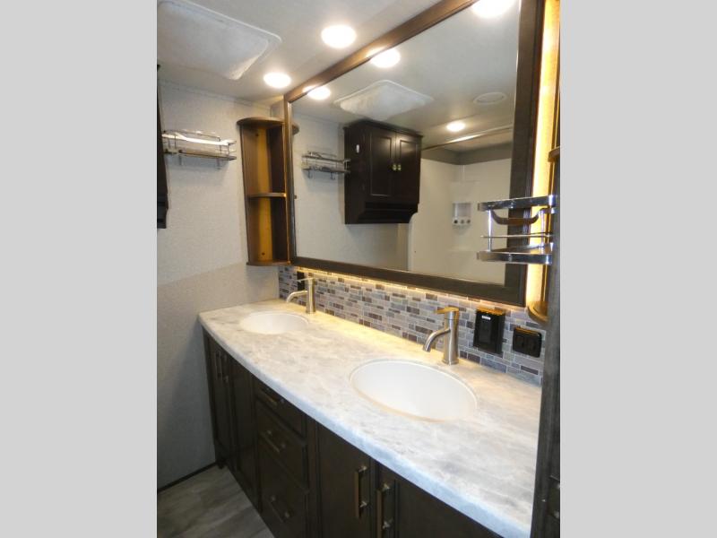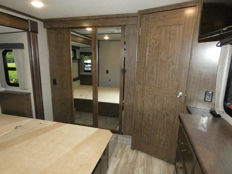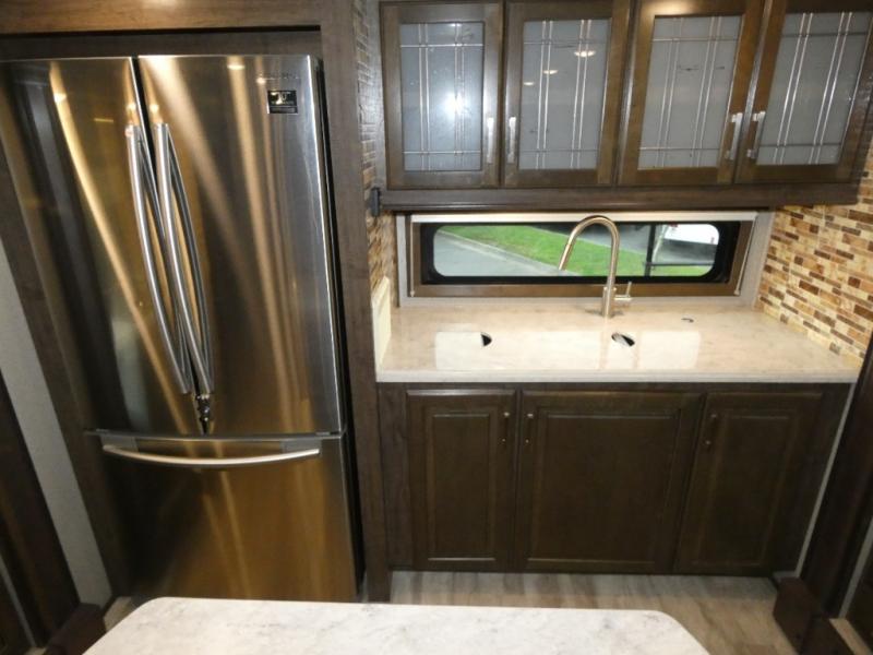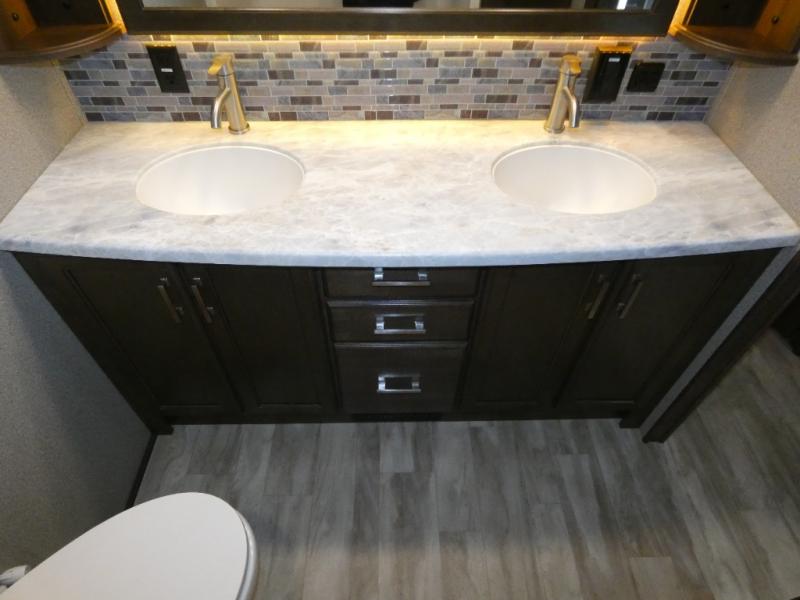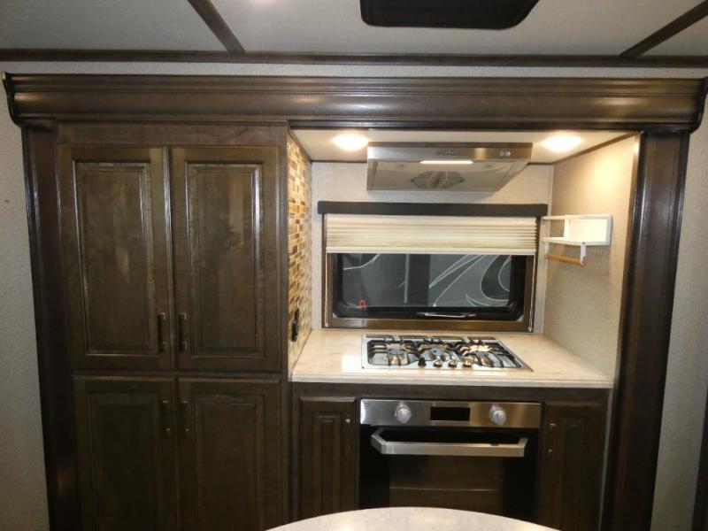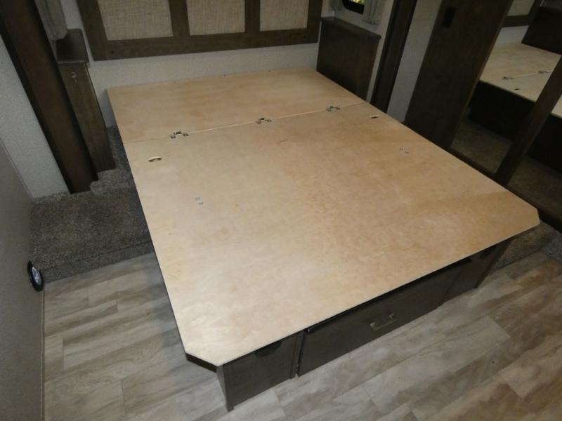 You will love your extended stays while traveling in this Solitude fifth wheel which features five slides! A rear raised kitchen provides the family chef a great space with opposing slides as well as an island for food prep. A raised bar top with two stools overlooks the center living space that also features dual opposing slides, tri-fold sofa, and theatre seating. Dual sinks in the full bathroom means getting ready is easy for two, and the shower with skylight offers more head room that you are also sure to appreciate. As you wind down your day, the front master bedroom will be a welcomed retreat thanks to a queen bed slide, and the walk-in closet provides ample space for all of your things. For added storage, a large exterior sliding tray offers more room for luggage and larger items. There is also a mid-coach pass-through storage compartment for other camping gear.