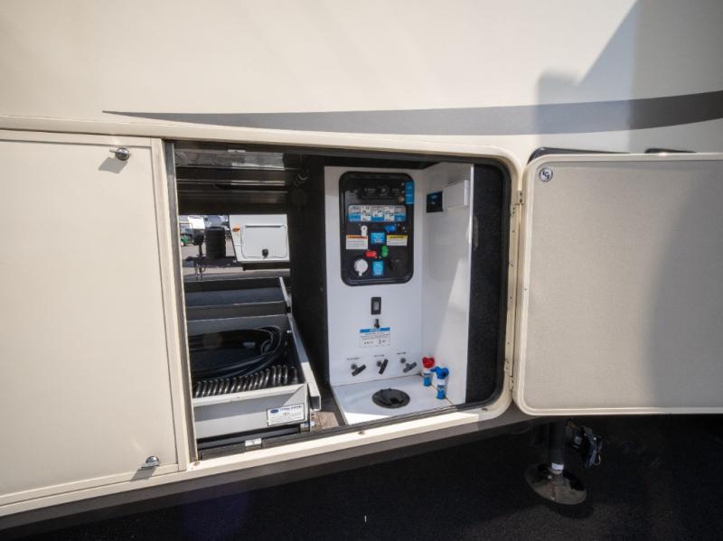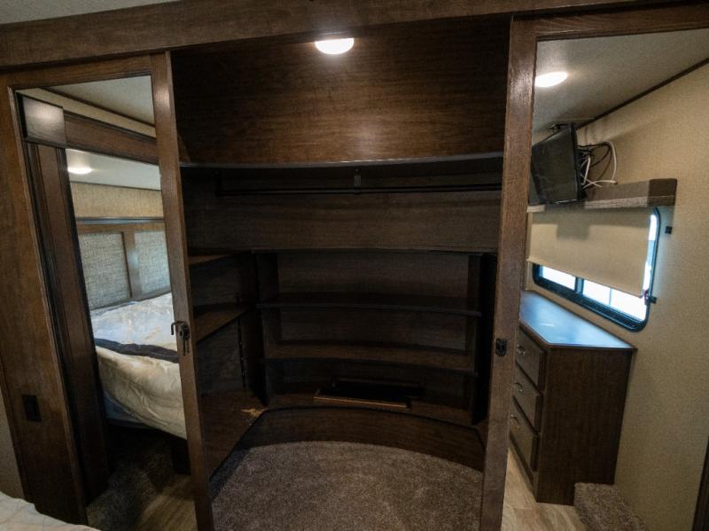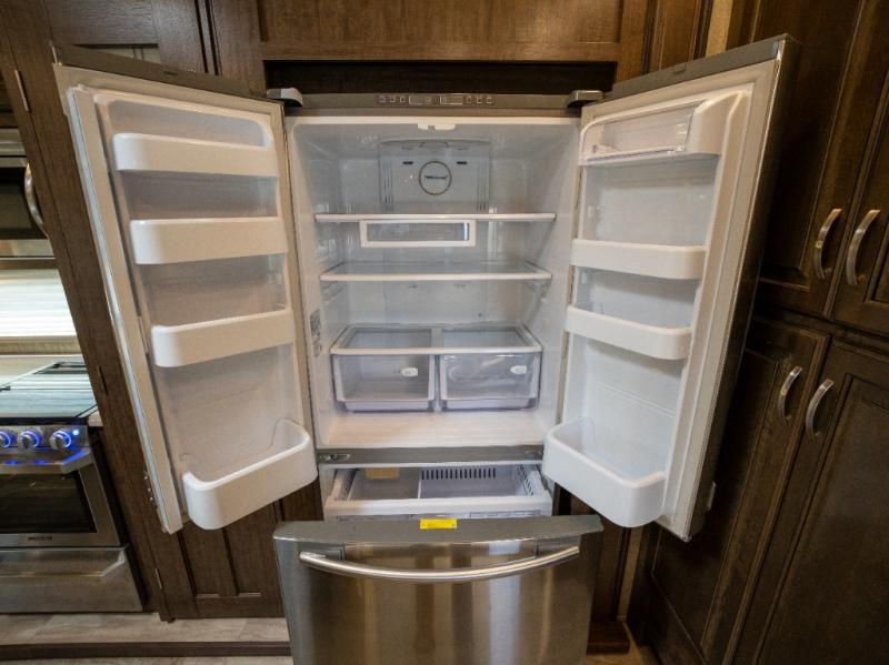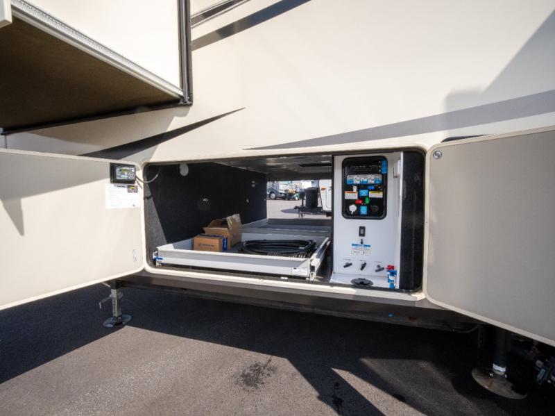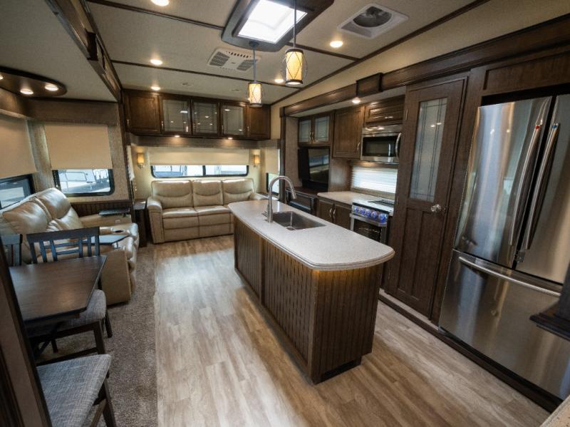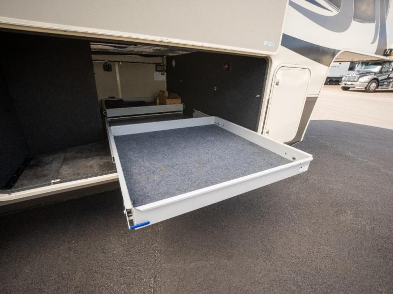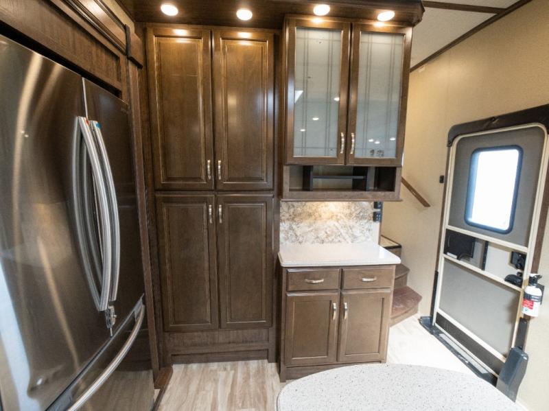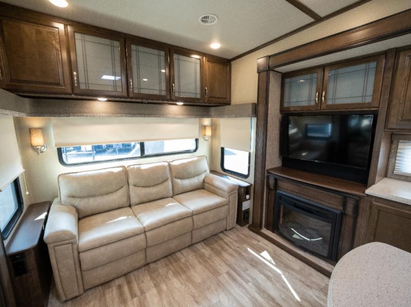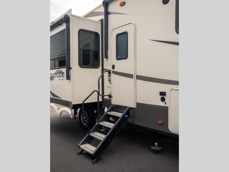 This Solitude S-Class fifth wheel will have you daydreaming about all the places you will visit, and maybe change you into a full-timer once you see all the amenities. Of course your sleeping accommodations are very important to you, the front master suite offers a queen bed or choose an optional king size if you prefer. And your spouse will surely love having their own sink in the bathroom, and plenty of clothing storage in the bedroom. The cook will enjoy using the professional grade stainless steel cooktop and convection microwave, the oversized pantry, the hutch, the stainless steel 12 cu. ft. four door refrigerator, plus the kitchen island. Everyone can relax in the rear living area on the tri-fold sofa or on the theatre seats for a massage. There are many more features to enjoy such as the fireplace, and options to add like a washer and dryer and/or a residential refrigerator. Start your plans now!
