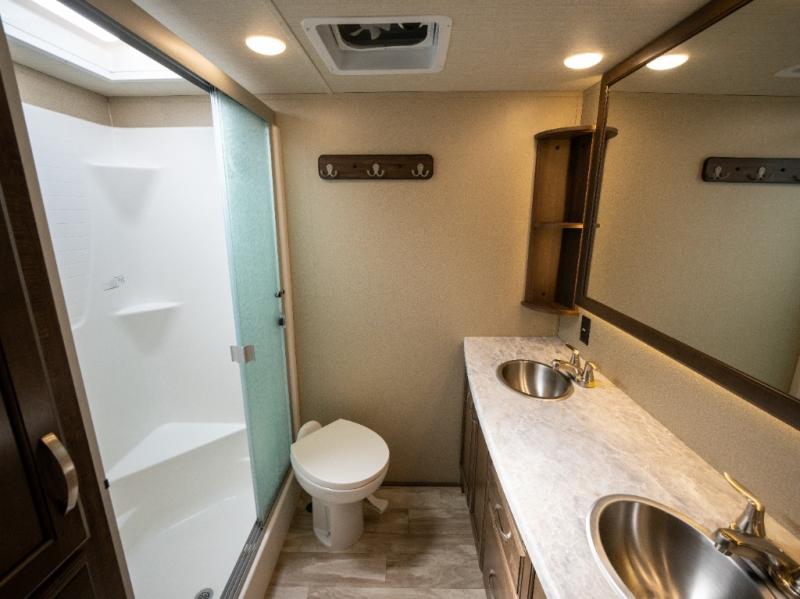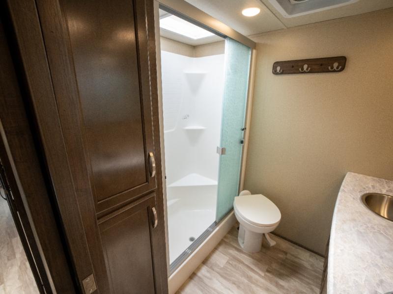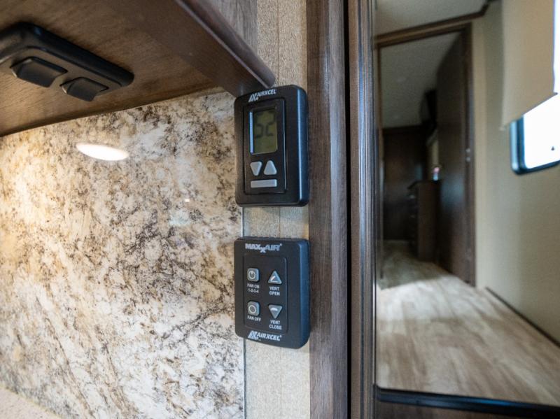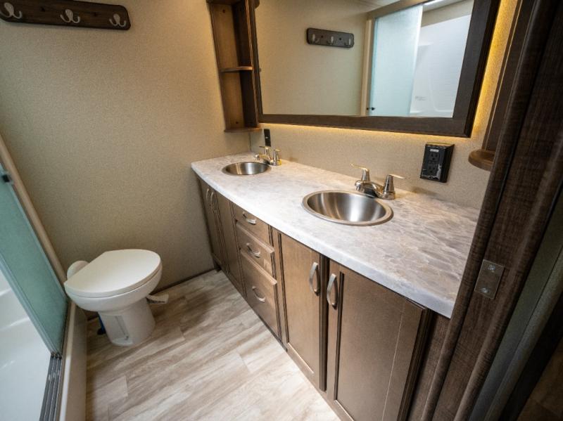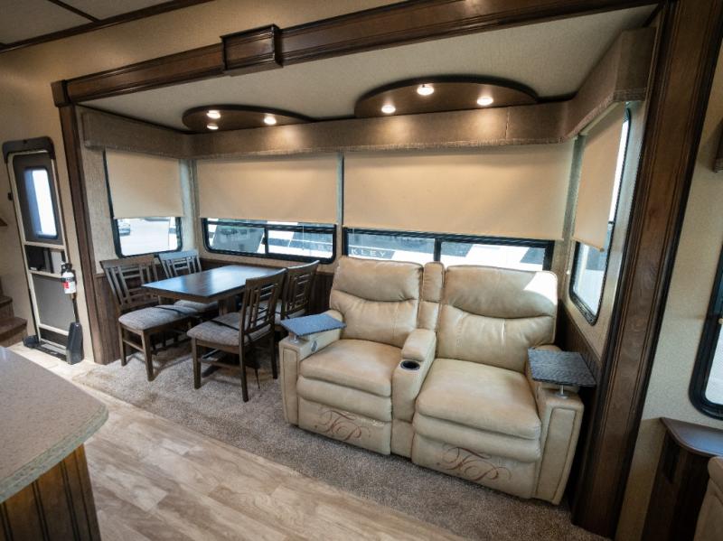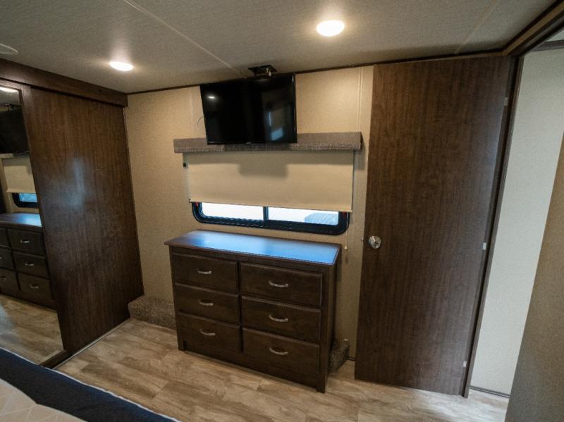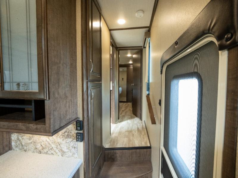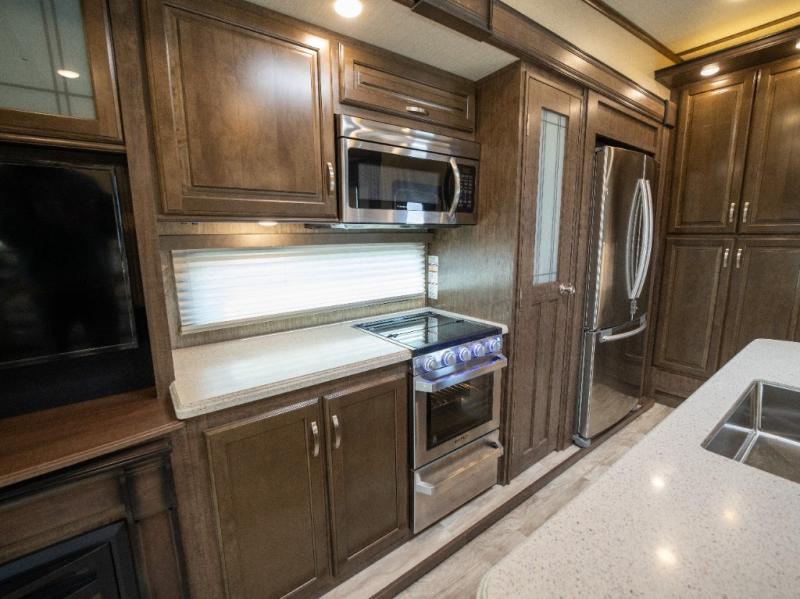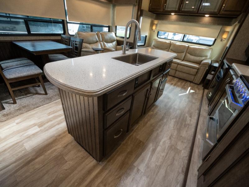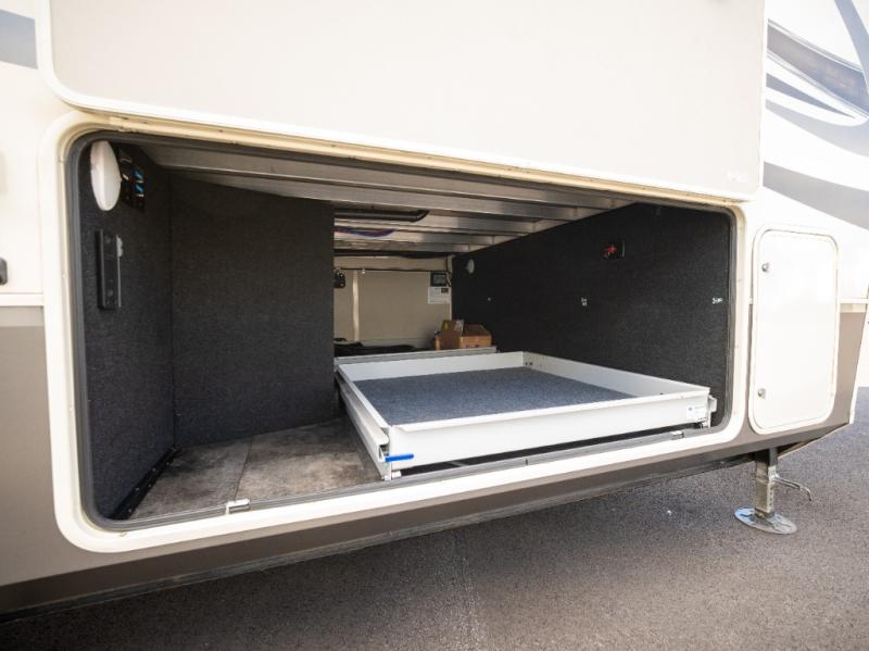 This Solitude S-Class fifth wheel will have you daydreaming about all the places you will visit, and maybe change you into a full-timer once you see all the amenities. Of course your sleeping accommodations are very important to you, the front master suite offers a queen bed or choose an optional king size if you prefer. And your spouse will surely love having their own sink in the bathroom, and plenty of clothing storage in the bedroom. The cook will enjoy using the professional grade stainless steel cooktop and convection microwave, the oversized pantry, the hutch, the stainless steel 12 cu. ft. four door refrigerator, plus the kitchen island. Everyone can relax in the rear living area on the tri-fold sofa or on the theatre seats for a massage. There are many more features to enjoy such as the fireplace, and options to add like a washer and dryer and/or a residential refrigerator. Start your plans now!