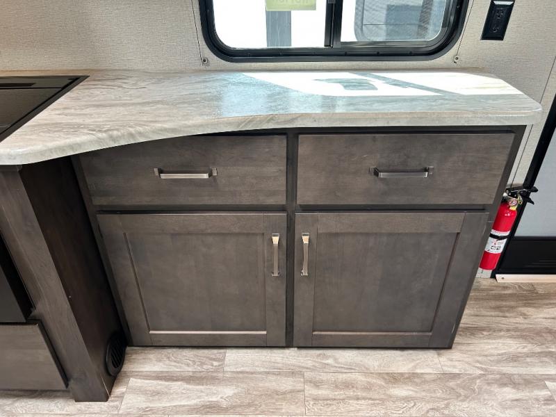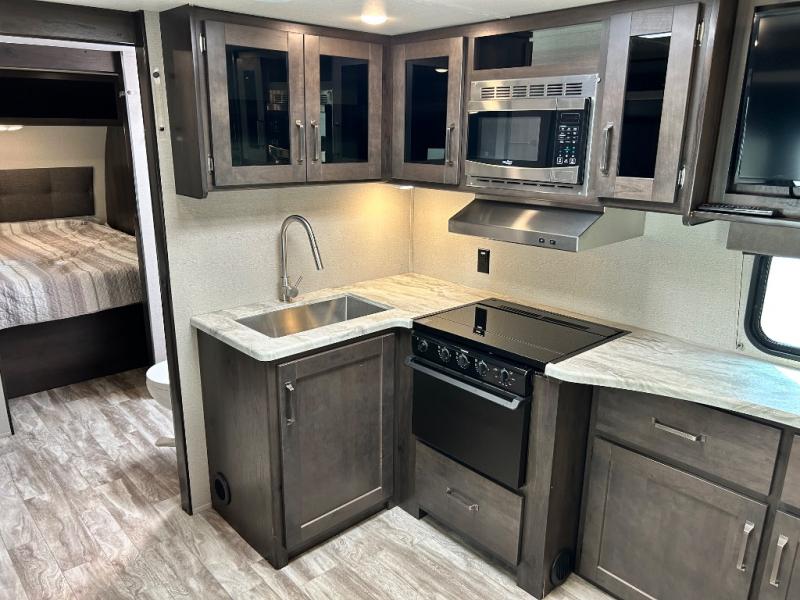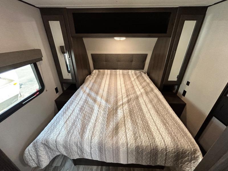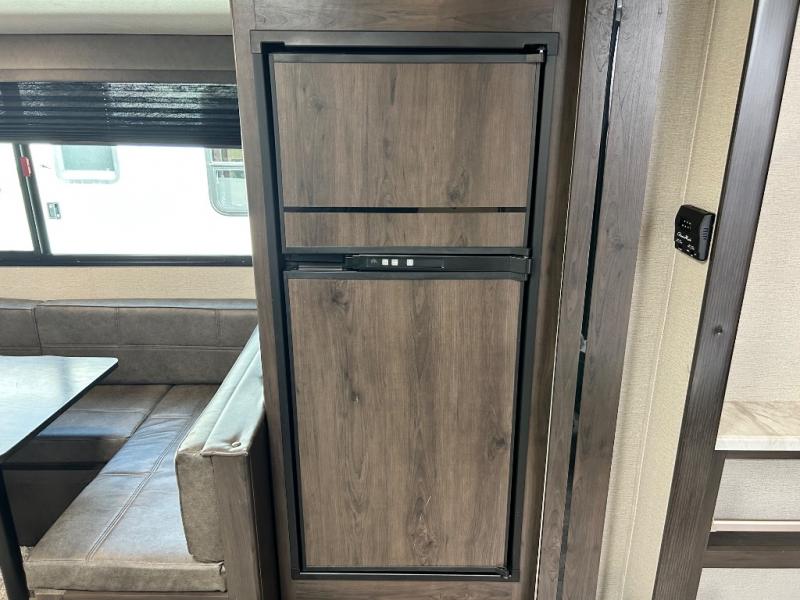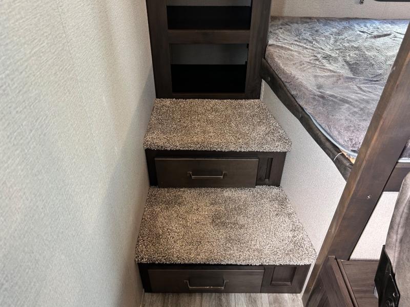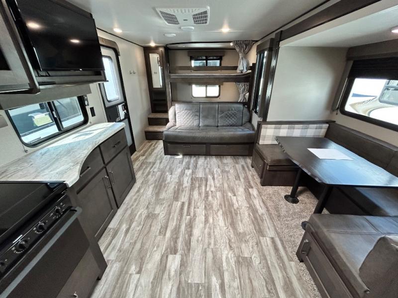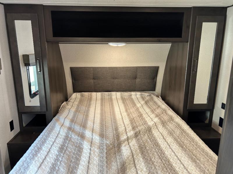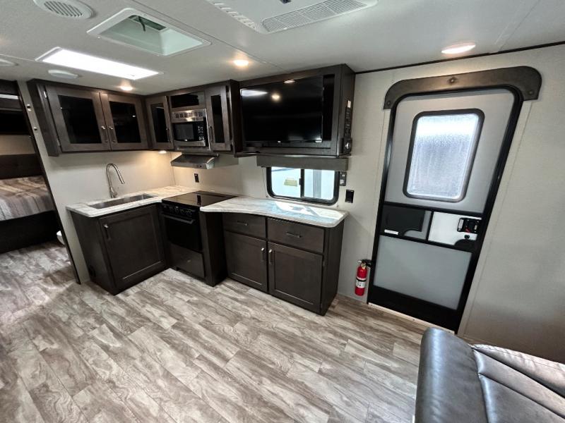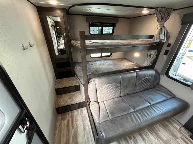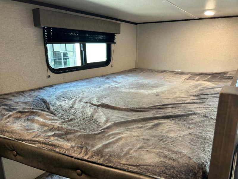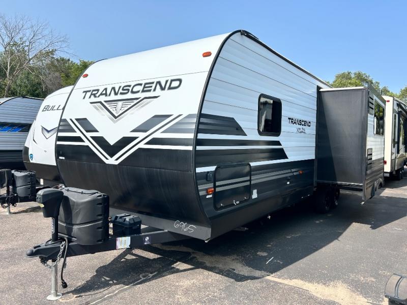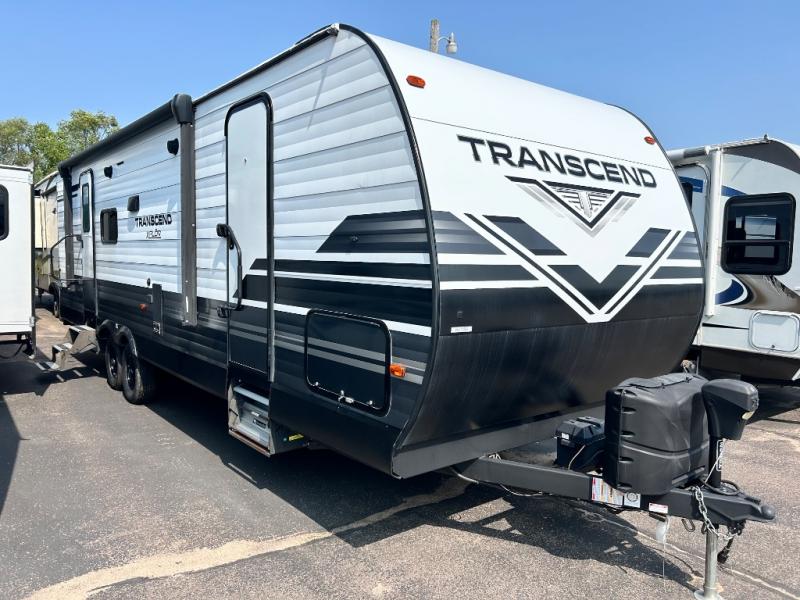 Your family will love the space and the amenities while camping at all of your favorite places in this new Transcend Xplor travel trailer. There is plenty of sleeping space with double-size bunks in back and a queen-size bed in the front private bedroom. You can also use the jackknife sofa and U-shaped dinette for added sleeping for more overnight guests. Two entry doors in this unit make loading and unloading simple, plus the second entry door into the front master bedroom is great for slipping out for a morning walk or coffee under the 16' power awning without disturbing the kids while they are asleep in the bunk space in back.