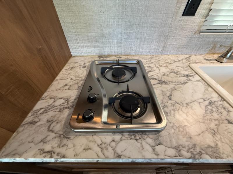 You and your family will enjoy sleeping in this trailer with double size bunk beds for the kids and their friends, a queen bed for the parents or choose the optional Murphy bed/sofa, and a booth dinette to sleep one more! The seven of you can wake up and take a hike or walk around the campgrounds, and someone can stay back to make breakfast in the galley kitchen with everything needed for warm meals. Everyone can take turns getting ready in the private toilet and tub/shower room while others take turns brushing their teeth in the single bath sink just outside the bath door. You will find plenty of storage for your clothes, dishes, and your outdoor camping gear in the pass-through compartment.