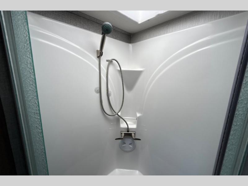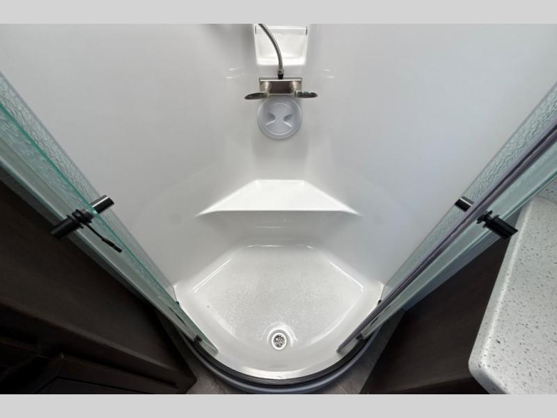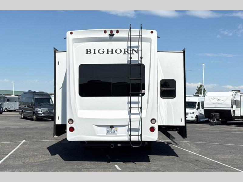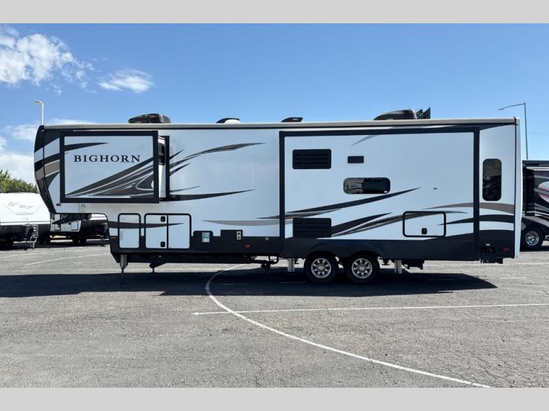 Each Bighorn fifth wheel by Heartland features a double-welded aircraft quality aluminum superstructure cage construction, a strong 12" I-beam frame with rust prohibitive coating, and a walkable roof decking to provide a strong unit that will last for years to come. The convenient Universal Docking Center features a 12v light, an exterior shower with hot/cold water, satellite hook-up, winterization valves, plus much more. With each model you'll enjoy glazed hardwood Magnolia Maple cabinetry, recessed LED lighting, 20" residential size drawers, and real solid surface countertops with a pencil nose edge. The elegant glass shower surround in the bath, along with the domed king skylight will provide a luxurious experience each time you clean up and the upgraded foam mattress will give you rest before you start the next day.