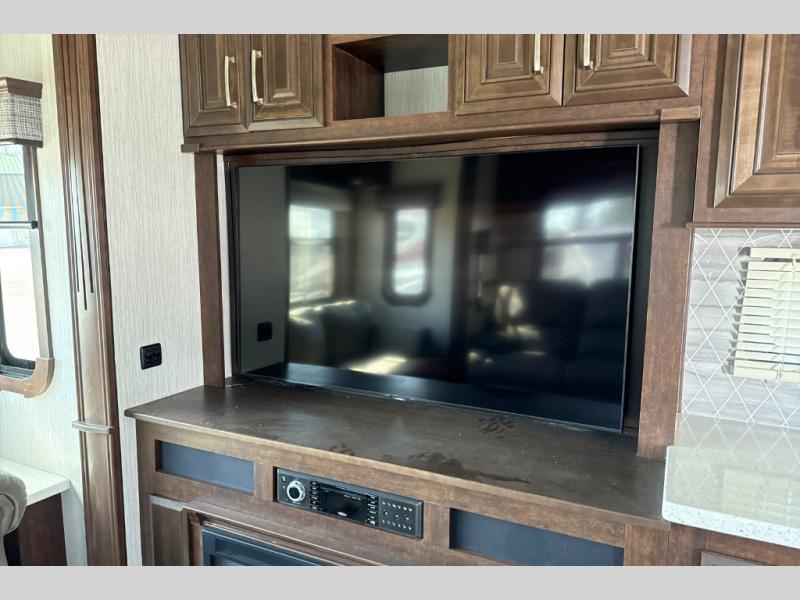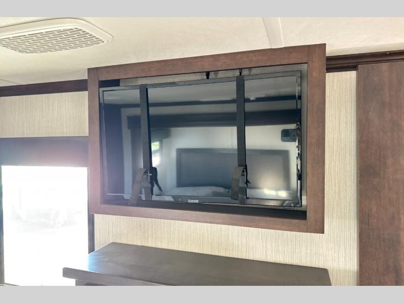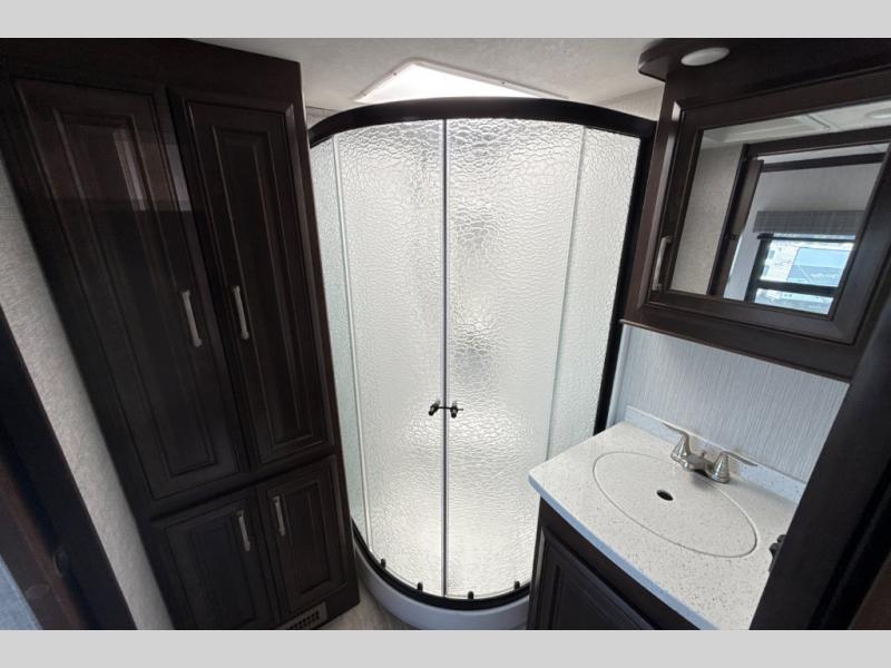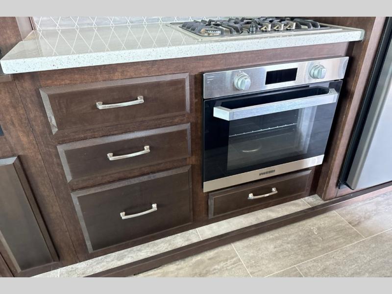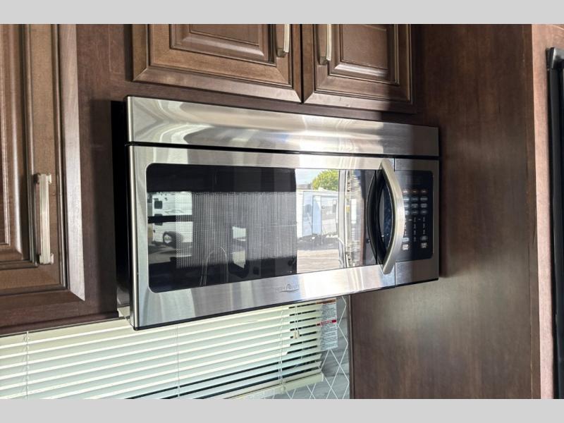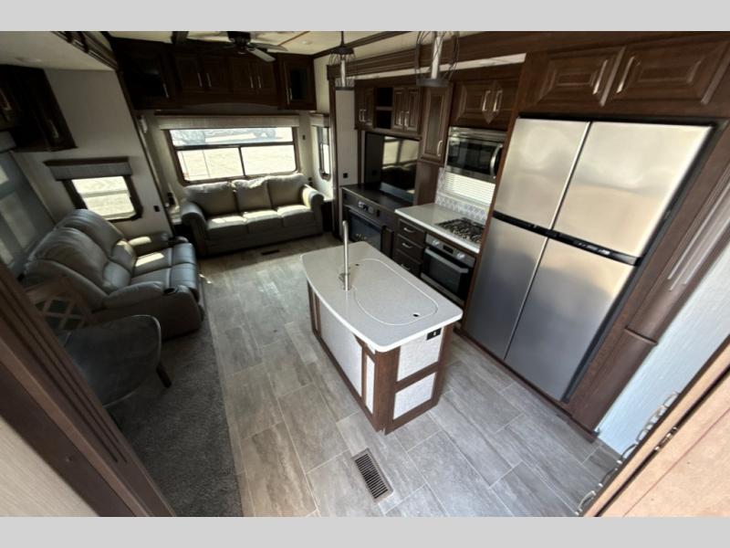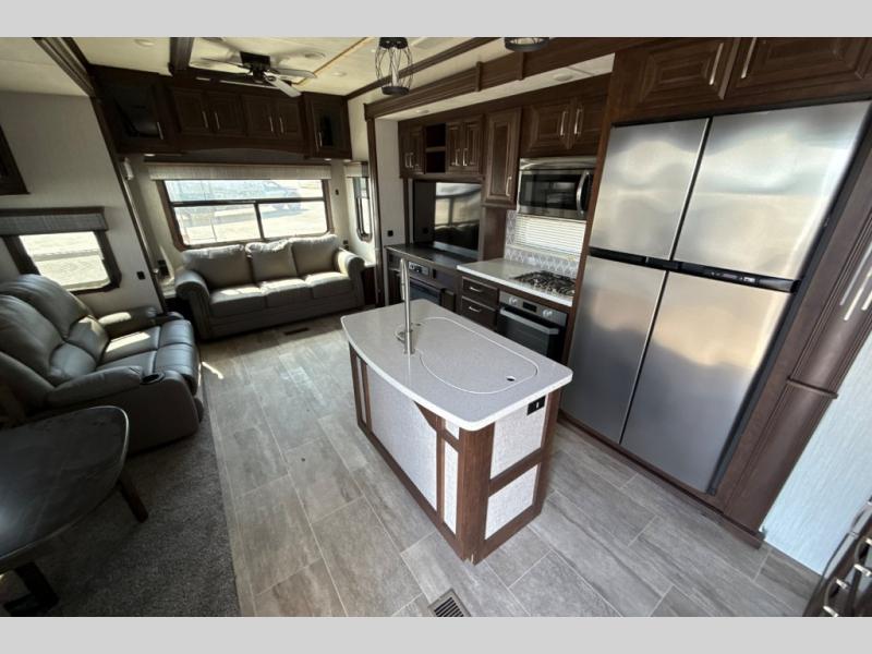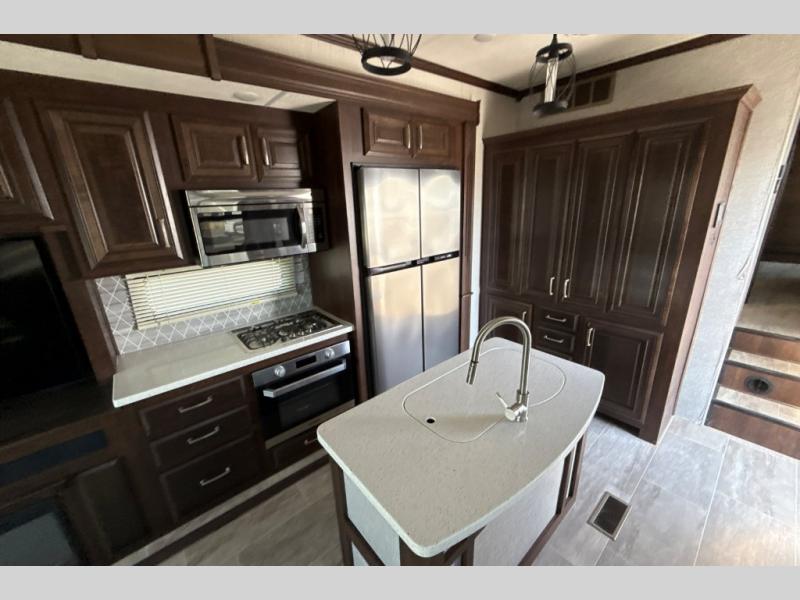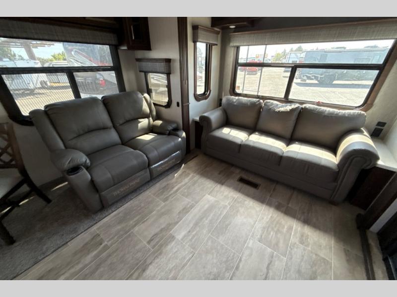 Pack up the kids for a fun trip to your favorite camping spot in this fifth wheel! This unit features dual opposing slides in the rear living and kitchen area, creating a large open space to relax. You'll also appreciate a slide out in the front bedroom for more space. Mom and dad will love their king bed that features massive underbed storage for extra blankets or board games. After spending the day outside, the kids can clean in the full bath, then head to the rear living area to watch a movie on the 55" LED TV. You'll find comfortable seating on the sofa or on the power theater seats. The chef of the family can prep some snacks on the kitchen island or make some popcorn in the convection microwave for a fun evening!