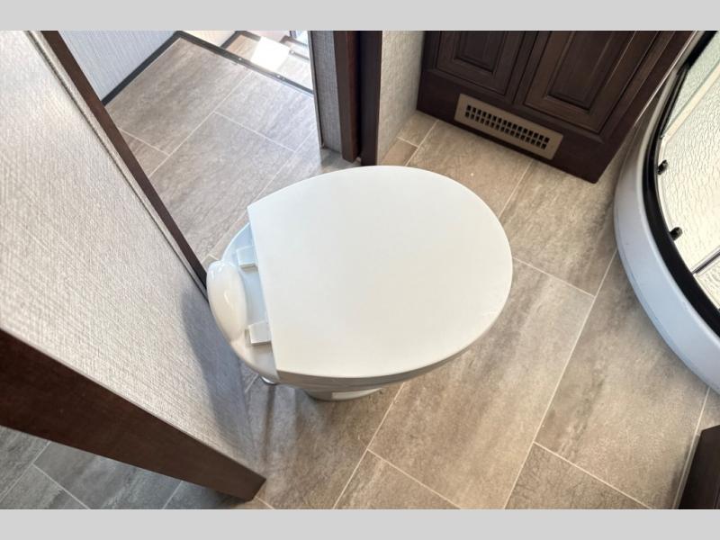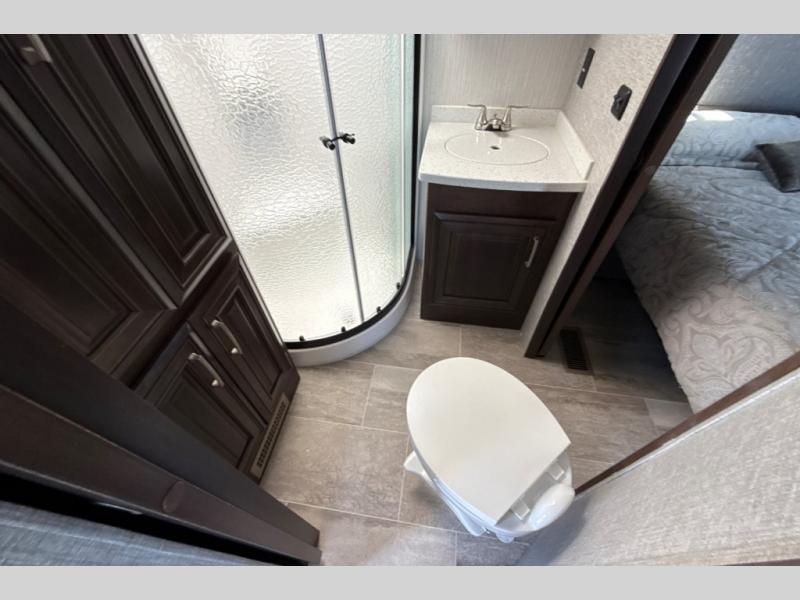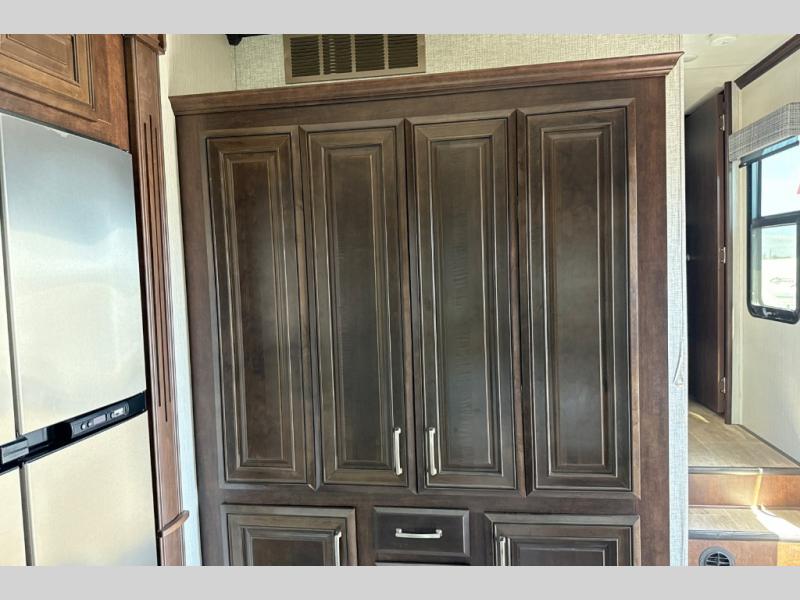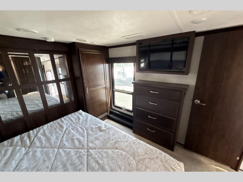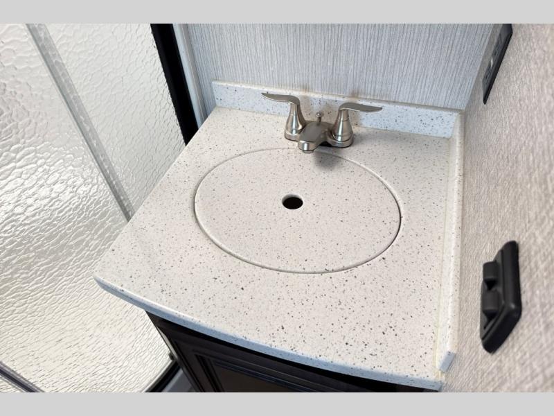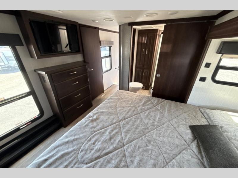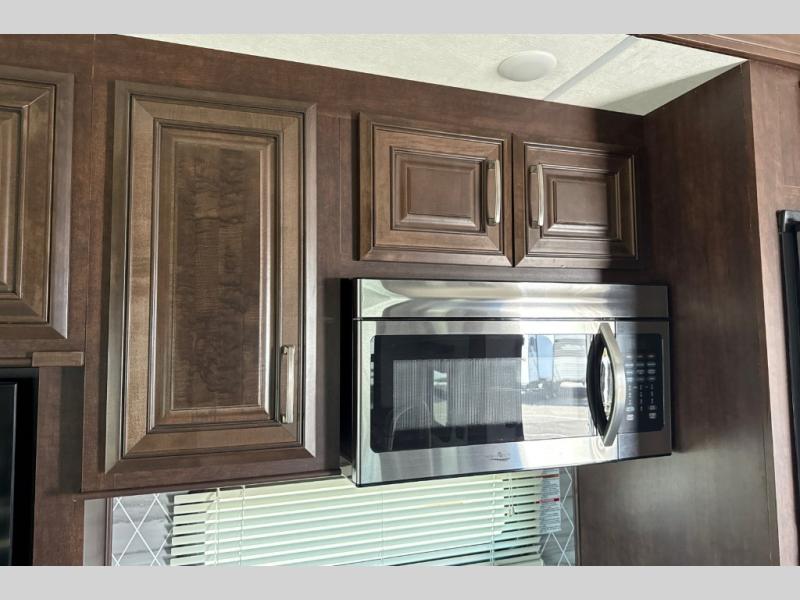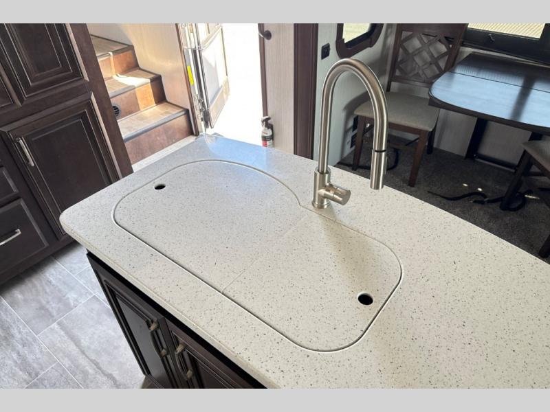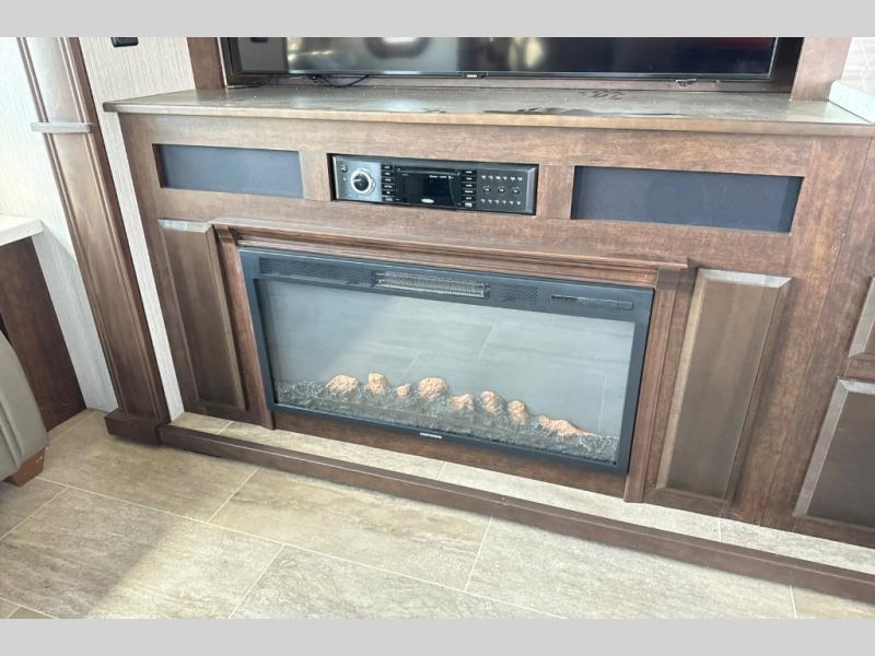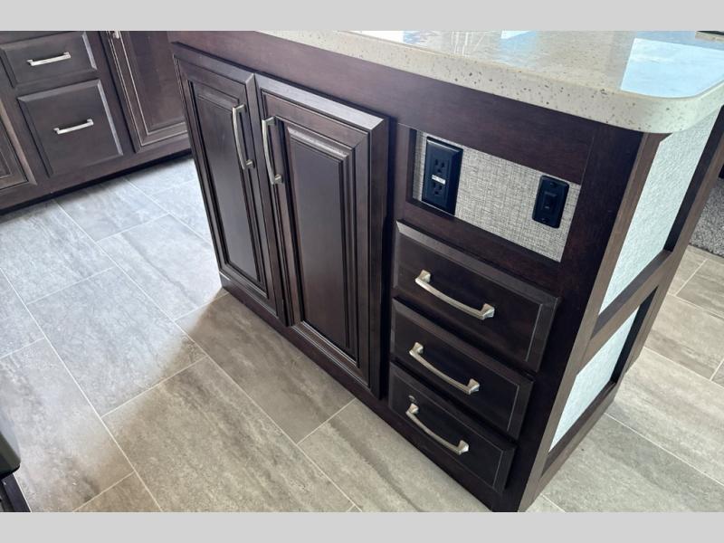Pack up the kids for a fun trip to your favorite camping spot in this fifth wheel! This unit features dual opposing slides in the rear living and kitchen area, creating a large open space to relax. You'll also appreciate a slide out in the front bedroom for more space. Mom and dad will love their king bed that features massive underbed storage for extra blankets or board games. After spending the day outside, the kids can clean in the full bath, then head to the rear living area to watch a movie on the 55" LED TV. You'll find comfortable seating on the sofa or on the power theater seats. The chef of the family can prep some snacks on the kitchen island or make some popcorn in the convection microwave for a fun evening!
