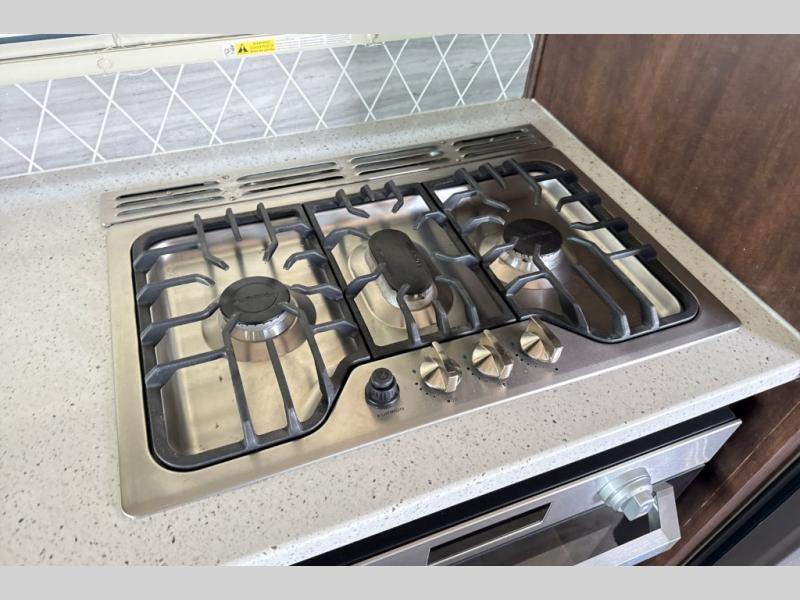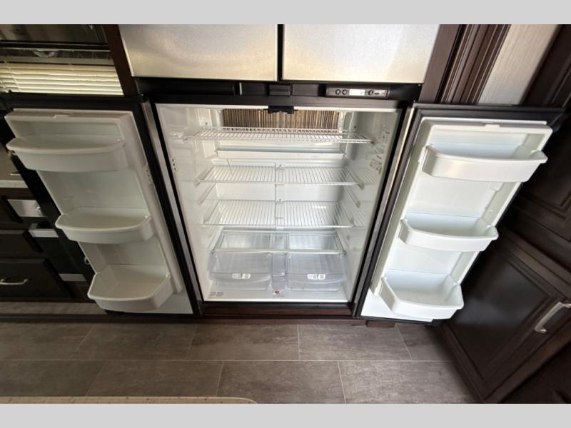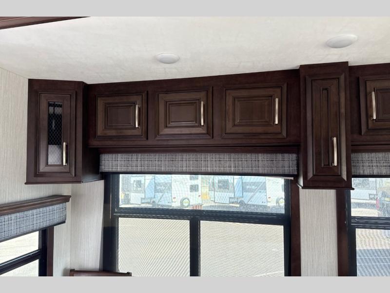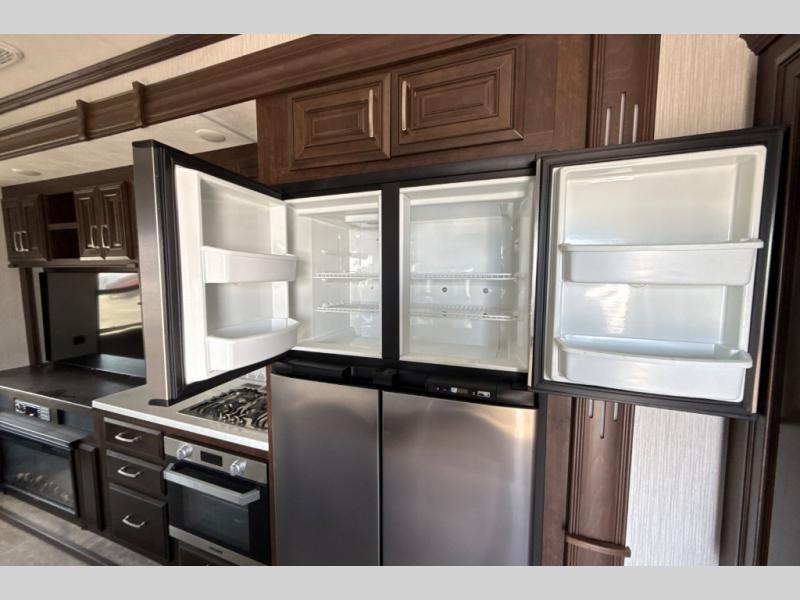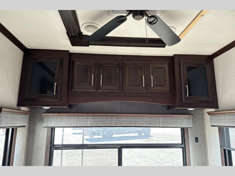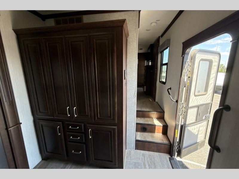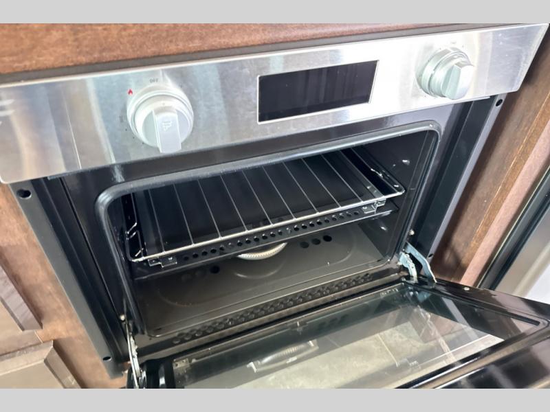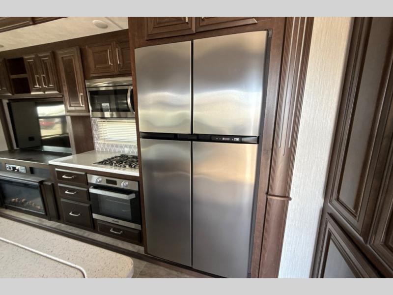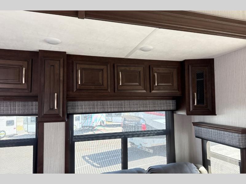 Pack up the kids for a fun trip to your favorite camping spot in this fifth wheel! This unit features dual opposing slides in the rear living and kitchen area, creating a large open space to relax. You'll also appreciate a slide out in the front bedroom for more space. Mom and dad will love their king bed that features massive underbed storage for extra blankets or board games. After spending the day outside, the kids can clean in the full bath, then head to the rear living area to watch a movie on the 55" LED TV. You'll find comfortable seating on the sofa or on the power theater seats. The chef of the family can prep some snacks on the kitchen island or make some popcorn in the convection microwave for a fun evening!